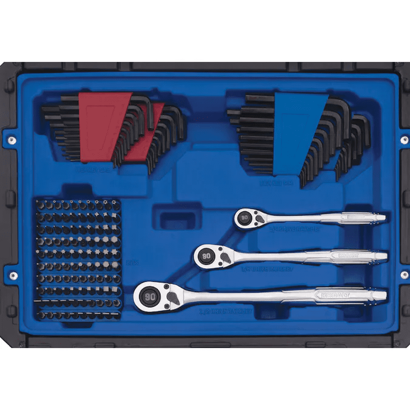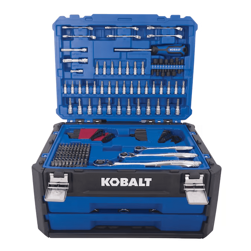 Kobalt’s 302-piece mechanic’s tool set features a wide assortment of tools housed in a two-drawer blow-molded case. Reinforced joints help the case withstand the rigors of day-to-day use. Larger drawer detents have been added to ensure the drawers stay closed during transportation. Metal clasps secure the case top and a rubber inlay has been added to the top handle for improved grip in wet conditions. The inside of the lid and both drawers feature individual compartments that securely hold all of the tools in a specific place. Every compartment has a stamped size callout that indicates what tool belongs there, helping keep things highly organized. As a skilled, do-it-all type of person, we wanted to provide you with high-quality tools to help you conquer a number of jobs. Whether you’re working on the go, in the garage or at home, you’ll truly be able to do it all.