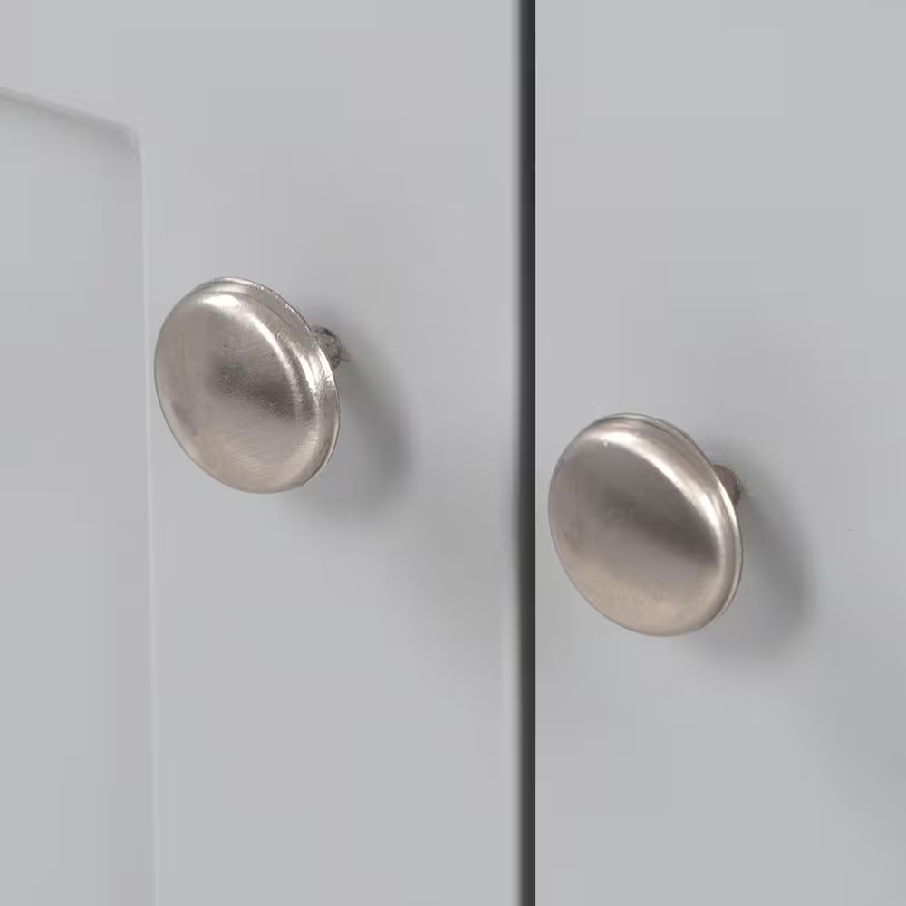 - Soft pearl gray cabinet finish with Shaker-style doors