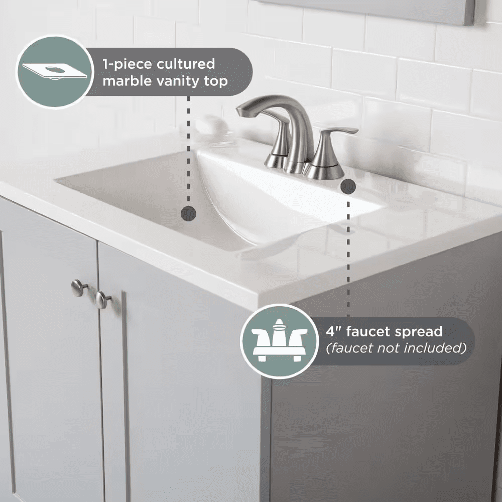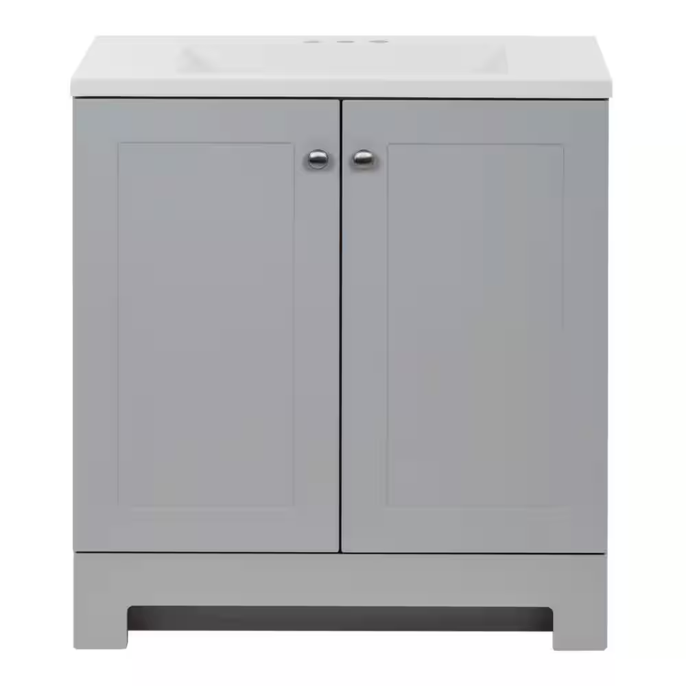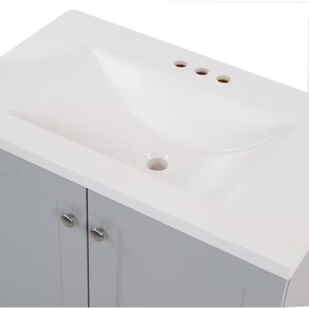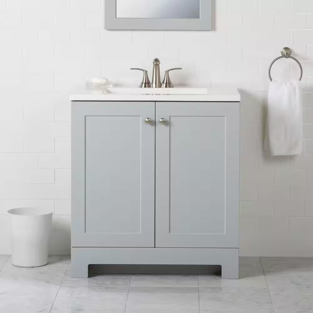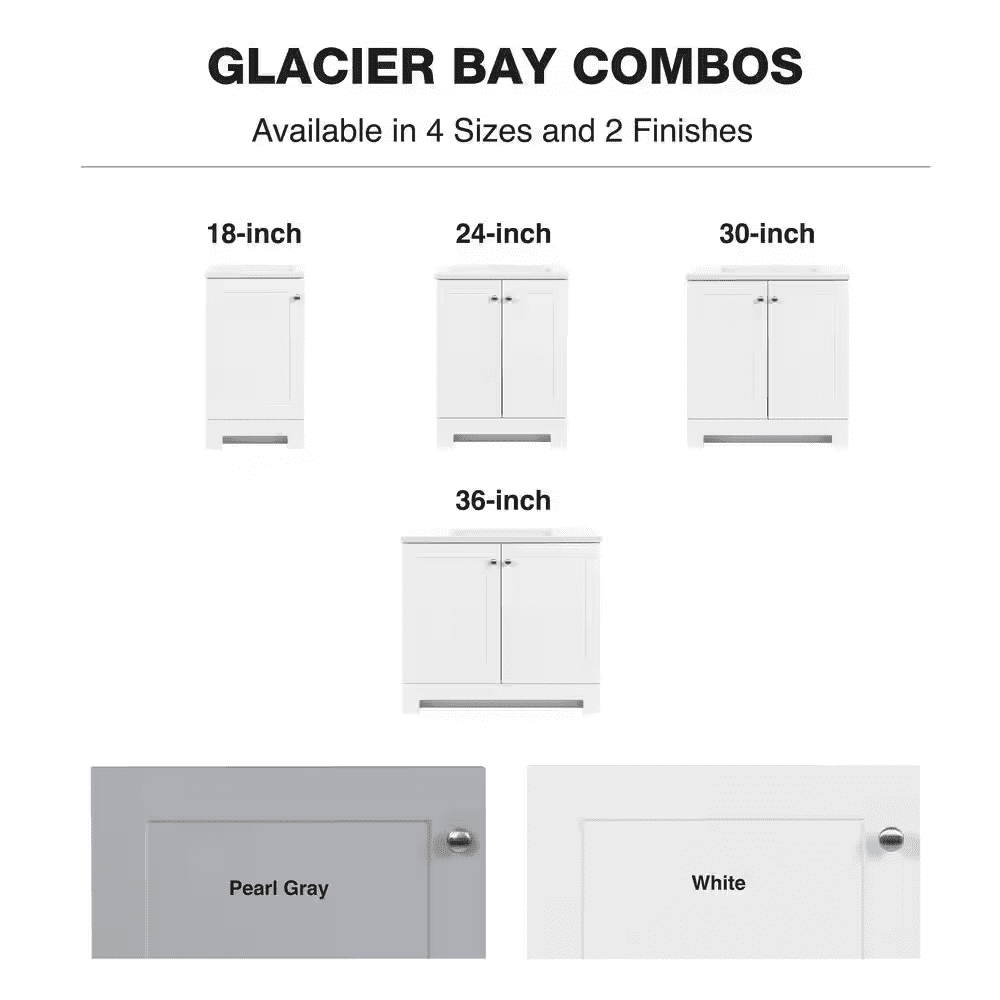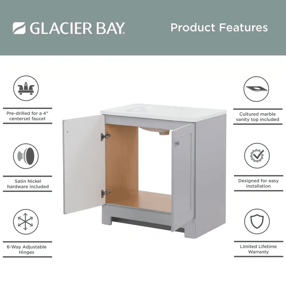 The 30.25 in. W Glacier Bay bathroom vanity in pearl gray features a 2-door cabinet and a white cultured marble vanity top. This soft pearl gray freestanding vanity features a Shaker-style full-overlay design, accented by satin nickel pulls. A predrilled white cultured marble vanity top with an integrated rectangular sink completes this vanity set.Created with convenience in mind, this pre-assembled single-sink bathroom vanity features an open-back design, 6-way adjustable cabinet hinges, and an unattached vanity top for easy installation.