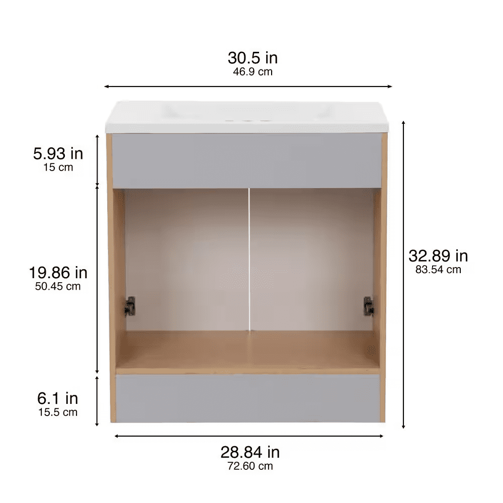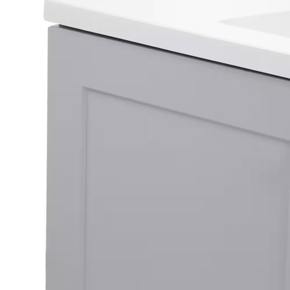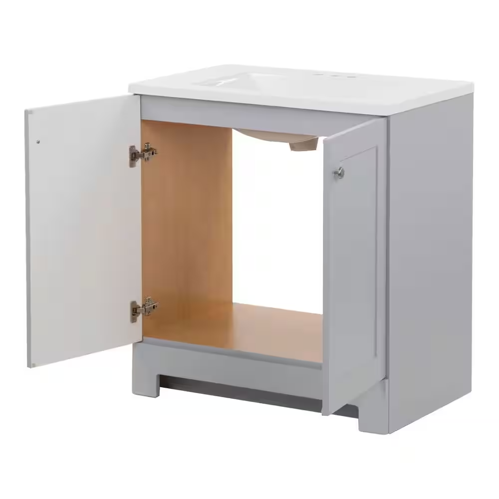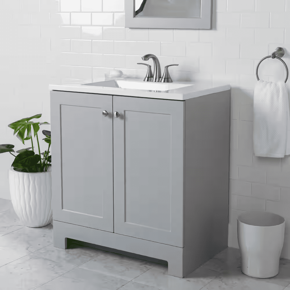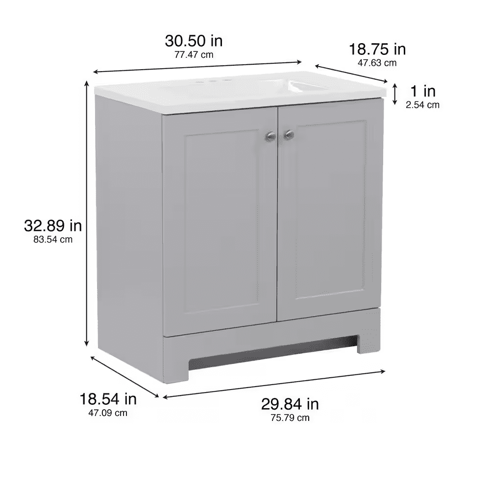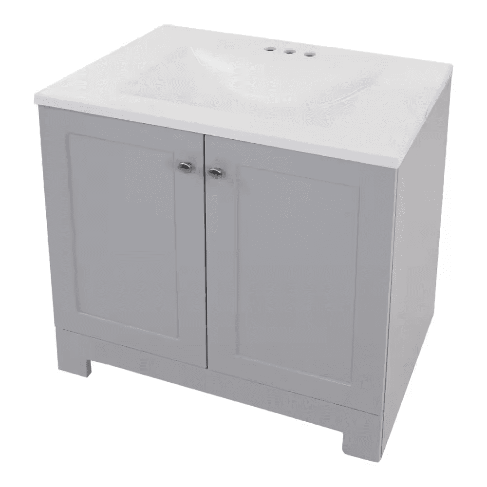 The 30.25 in. W Glacier Bay bathroom vanity in pearl gray features a 2-door cabinet and a white cultured marble vanity top. This soft pearl gray freestanding vanity features a Shaker-style full-overlay design, accented by satin nickel pulls. A predrilled white cultured marble vanity top with an integrated rectangular sink completes this vanity set.Created with convenience in mind, this pre-assembled single-sink bathroom vanity features an open-back design, 6-way adjustable cabinet hinges, and an unattached vanity top for easy installation.