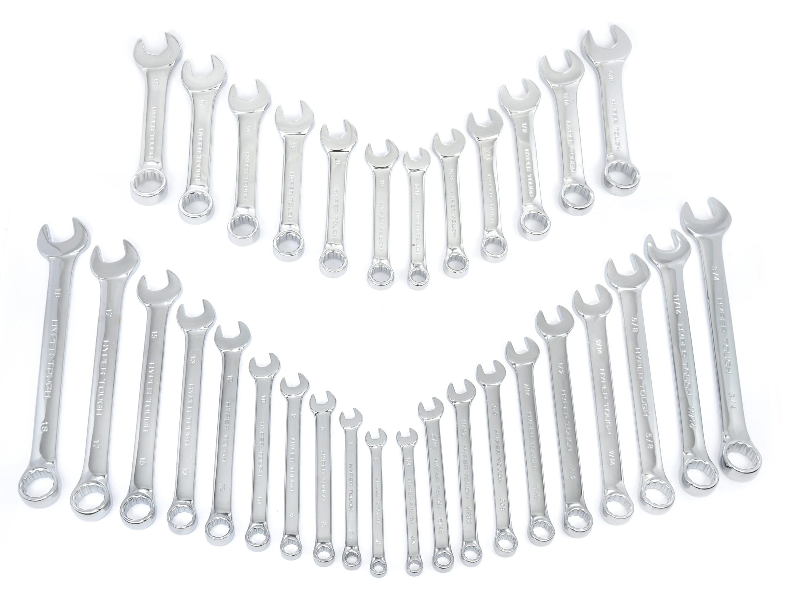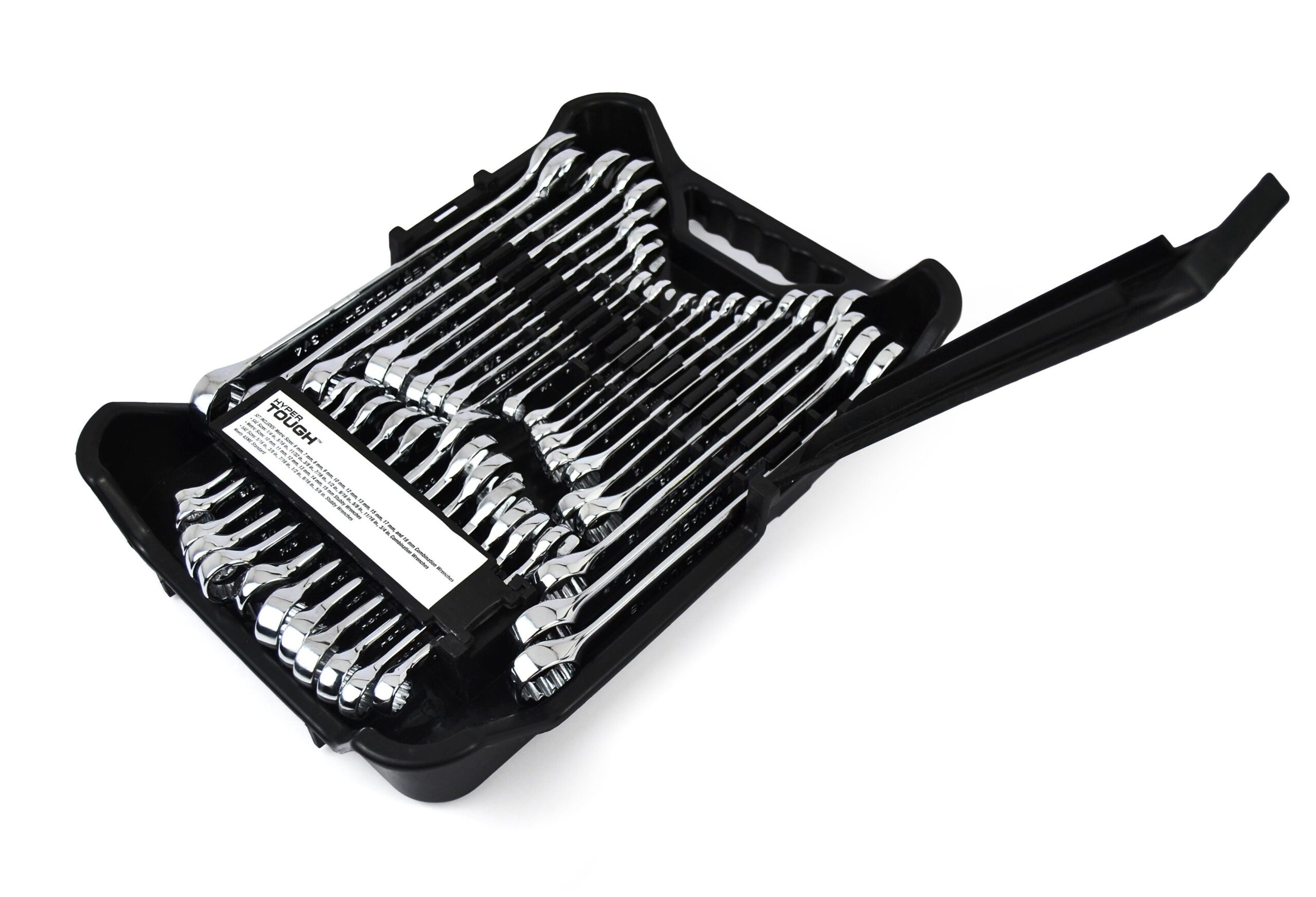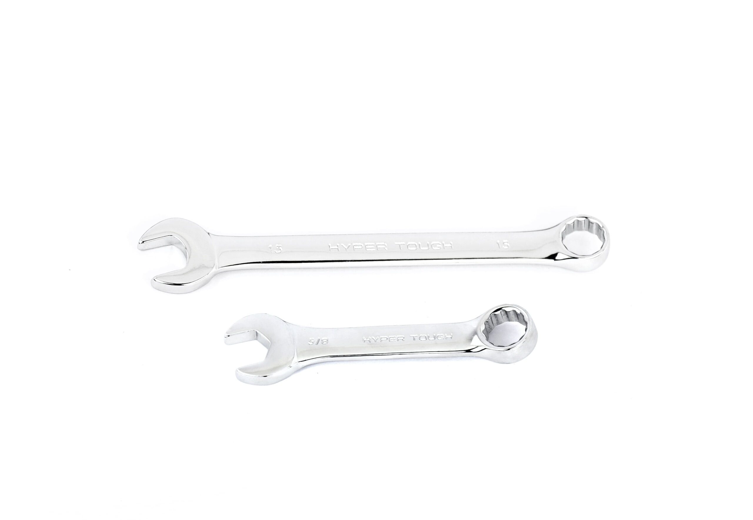 Hyper Tough 32-Piece Combination Wrench Set includes 20 standard and 12 stubby wrenches in both metric and SAE sizes for greater compatibility with numerous fasteners and for working in tight spaces. They’re made of durable chrome vanadium steel with nickel-chrome plating for a polished finish and reliable grip and performance. Sizes are etched on, making reading and identification easier, and all pieces meet ANSI/ASME standard of safety and quality. This wrench tool set comes packaged in a sturdy case with a carrying handle for convenient storage and portability.