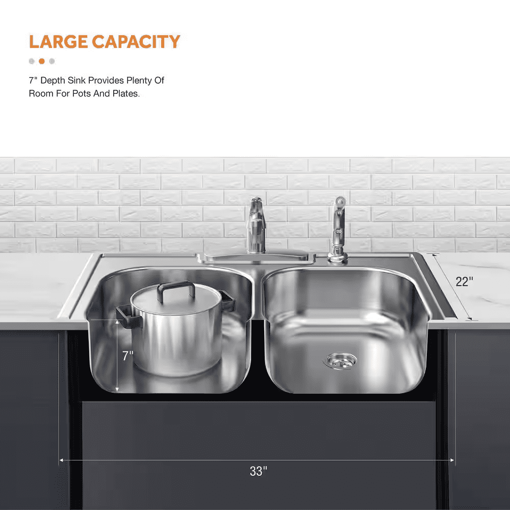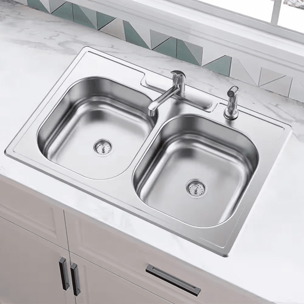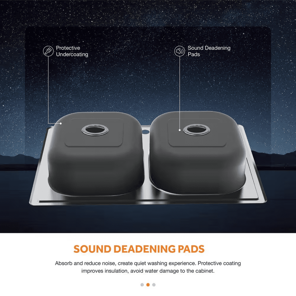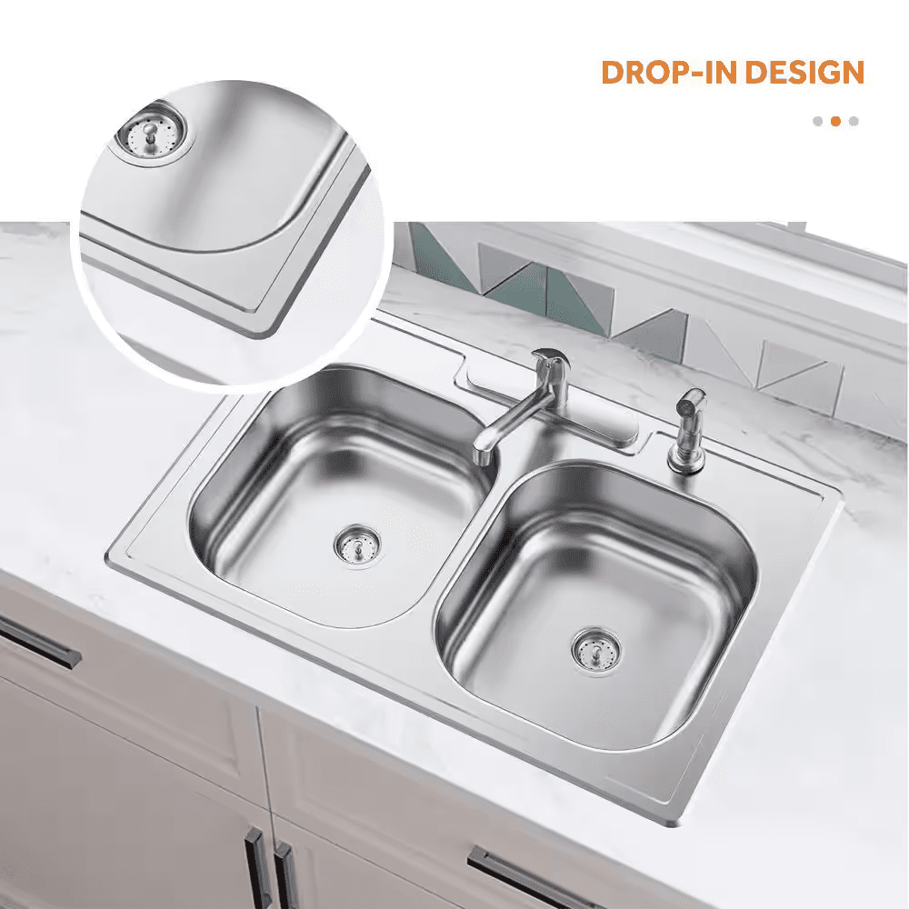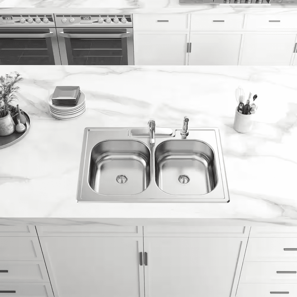 This Glacier Bay kitchen sink features an insulating undercoat that not only dampens noises and vibrations, it inhibits condensation buildup and helps stabilize water temperature in the double bowls. Simple yet stylish, the gleaming 22-Gauge stainless steel construction provides strength and durability for years of lasting use while the clean lines and gently rounded corners provide visual allure. The drop-in sink is pre-drilled with four holes to accommodate a faucet and sprayer, soap dispenser or other accessories (sold separately), ready to occupy a 33 in. x 22 in. footprint on your countertop.