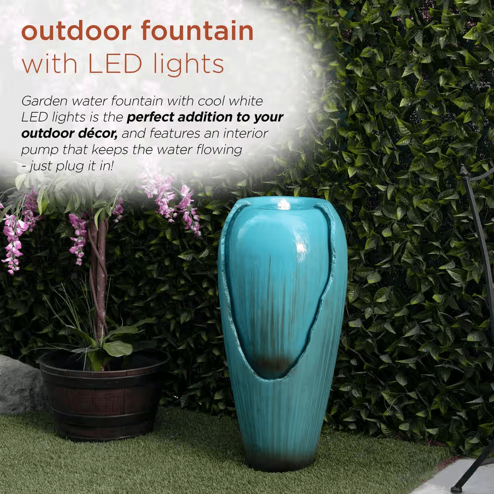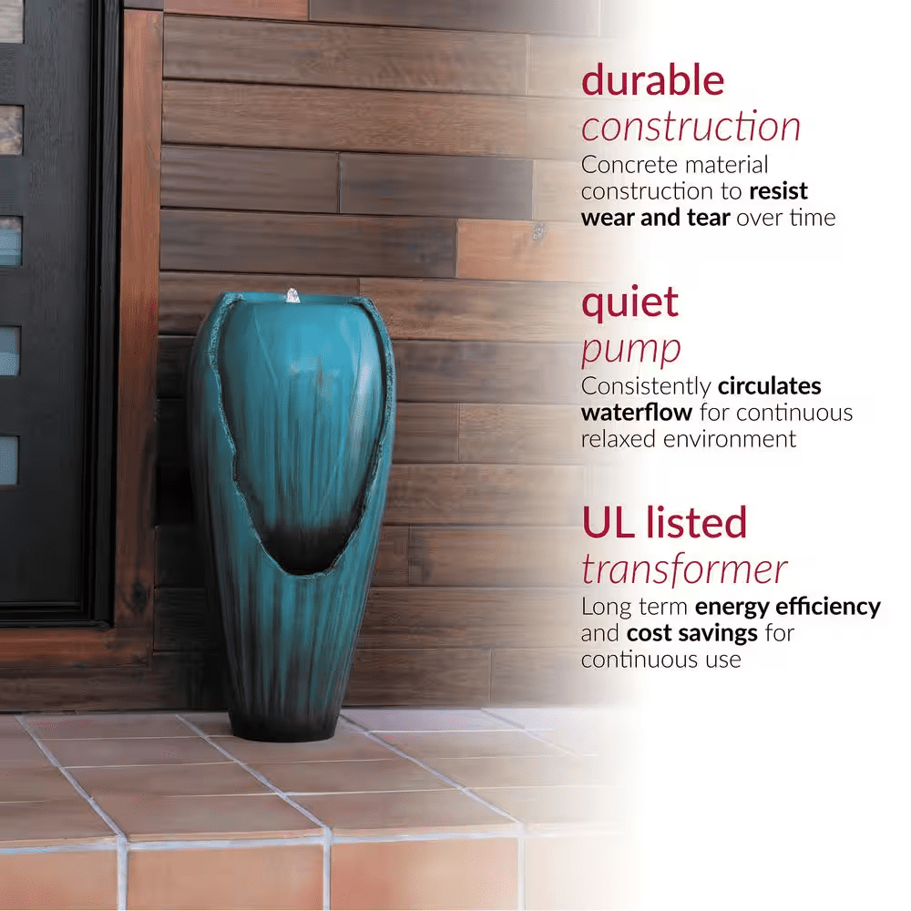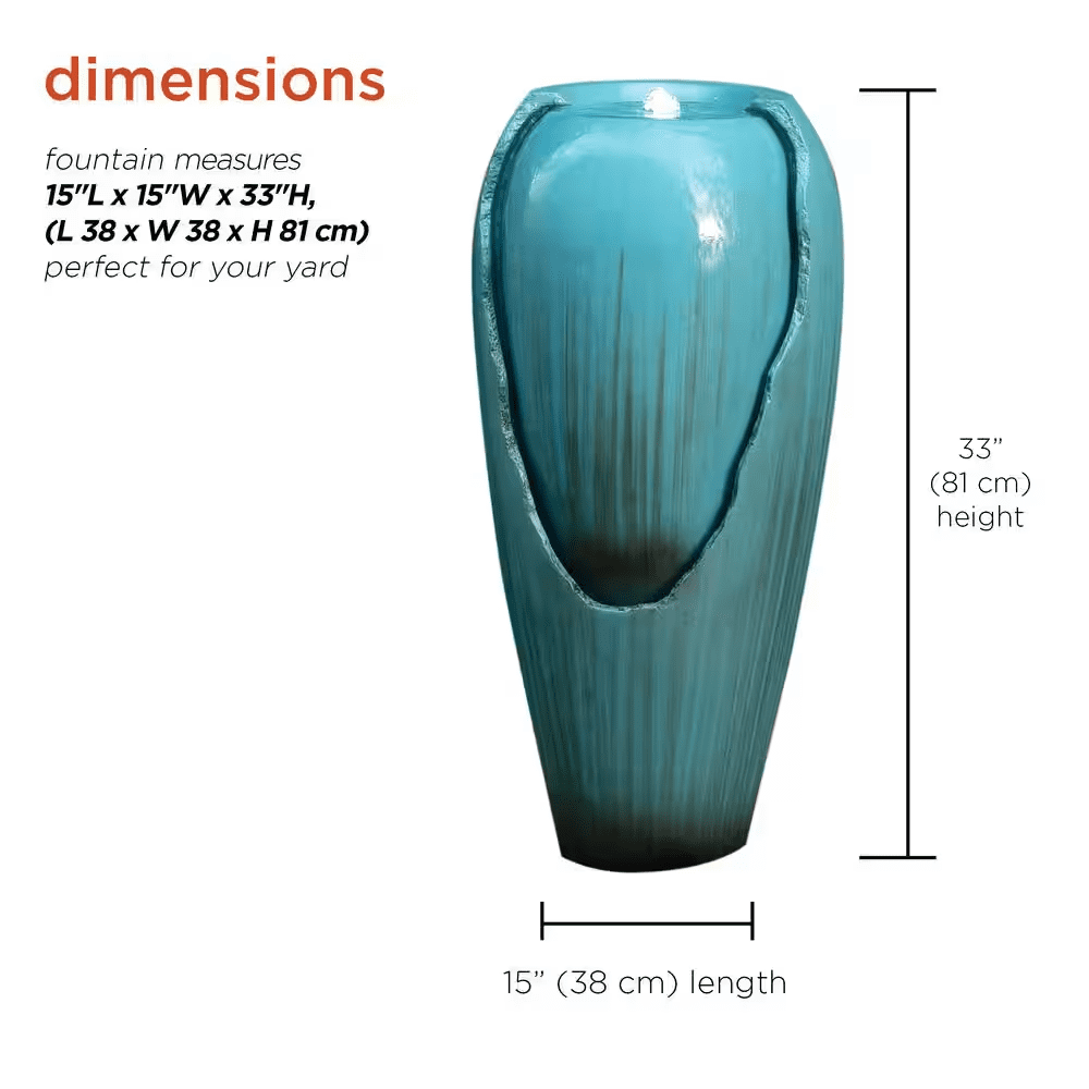 Bring a calming and decorative accent to your outdoor living area with the Alpine Corporation DIG100XS 33-in Tall Turquoise Ceramic Jar Water Fountain with LED Light, a stylish piece designed to combine timeless charm with modern functionality. Featuring a tall, glazed ceramic jar in a vibrant turquoise finish, this fountain adds a refreshing pop of color. The freestanding jar design allows water to flow gently down the sides into the basin, creating the soothing sounds of trickling water that promote relaxation, mask unwanted background noise, and set a tranquil mood for your evenings. A built-in LED light highlights the flowing water, turning the fountain into a glowing centerpiece at night and extending its ambiance long after the sun sets. Crafted from durable, weather-resistant ceramic, it is built to withstand outdoor conditions while retaining its beauty and glossy finish through the seasons. The included 12V pump recirculates water continuously, ensuring reliable, low-maintenance performance, while the 6.5 ft. power cord makes placement flexible and setup simple-just fill with water, plug it in, and enjoy. Measuring 15 in. L x 15 in. W x 33 in. H, this compact yet eye-catching fountain is perfectly sized for yards of any scale, fitting neatly in corners, entryways, or as a garden focal point. For added peace of mind, the Alpine Corporation DIG100XS is backed by a 2-year limited manufacturer’s support, ensuring years of dependable quality and enjoyment.