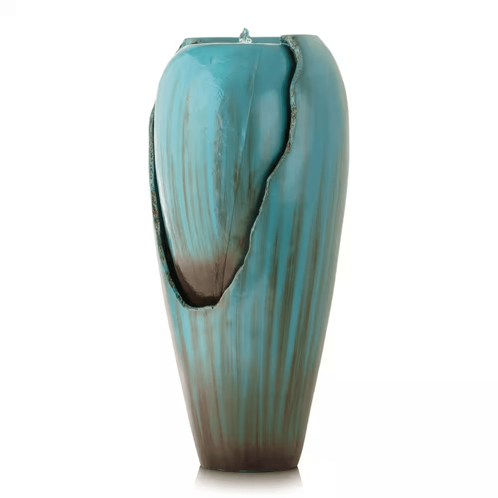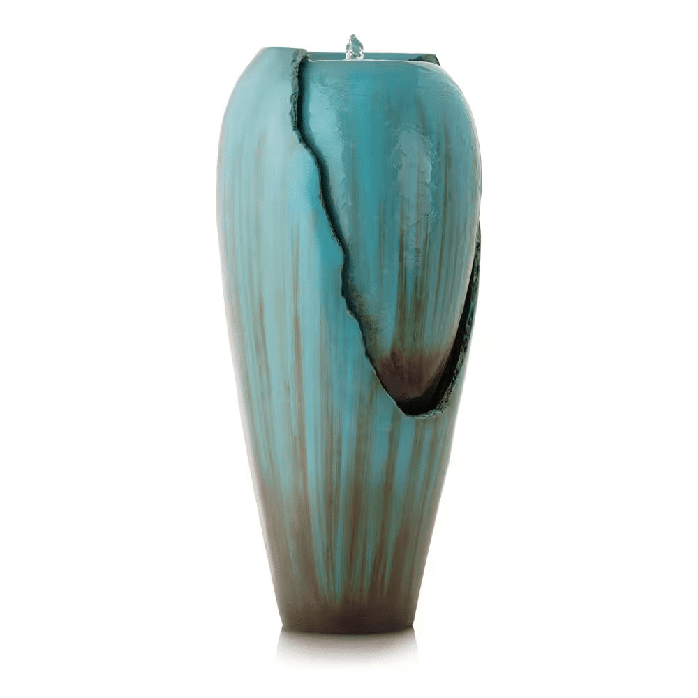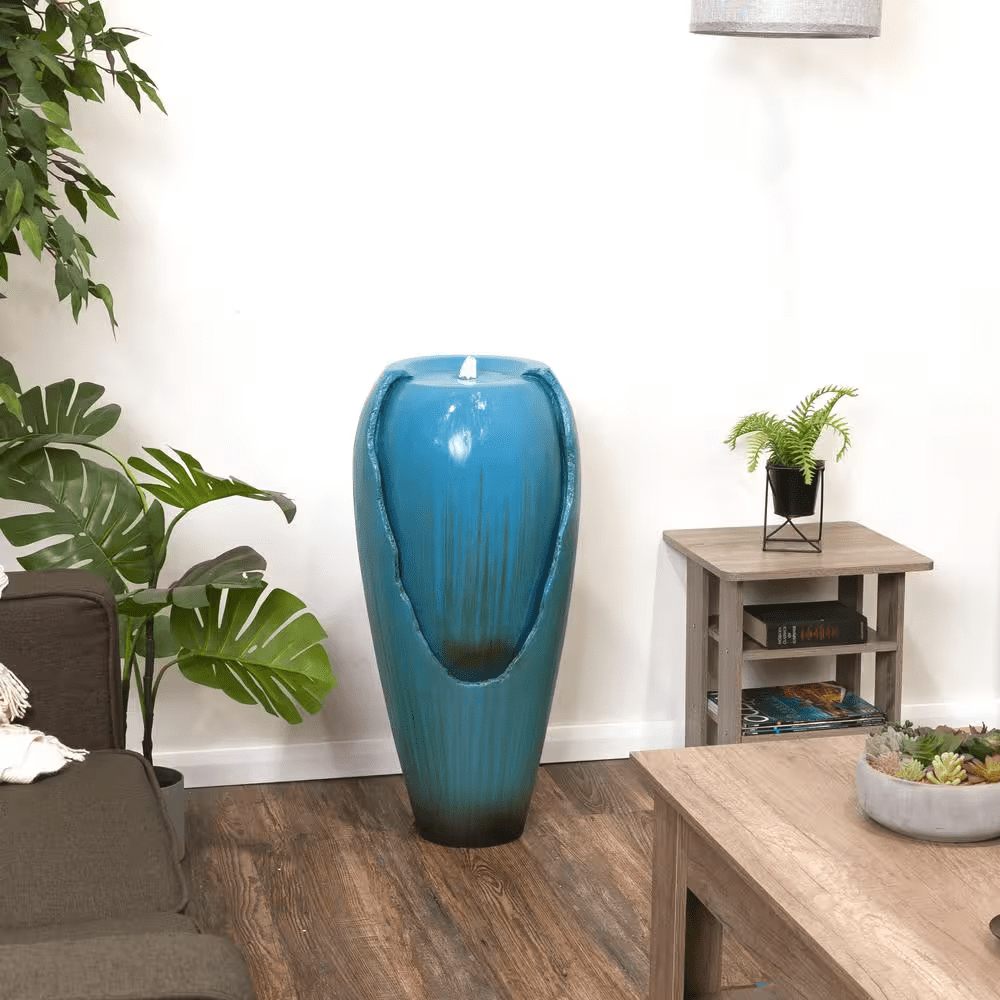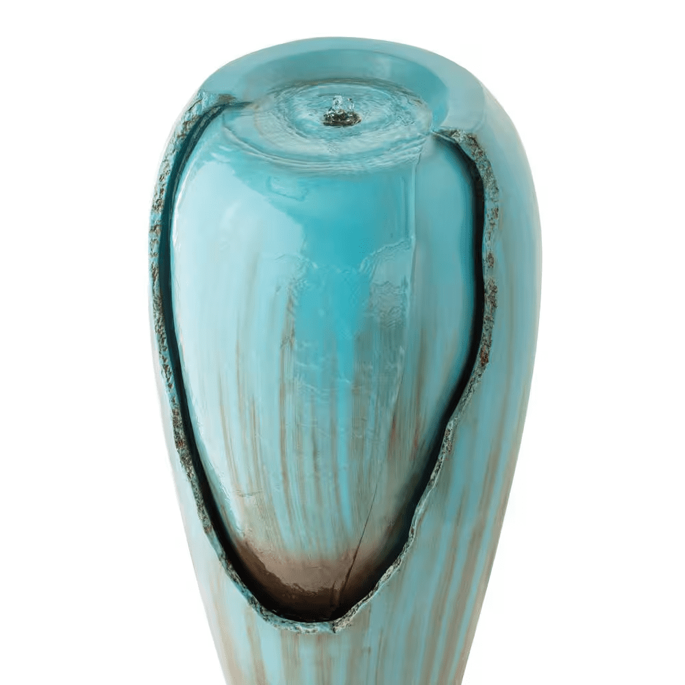 Bring a calming and decorative accent to your outdoor living area with the Alpine Corporation DIG100XS 33-in Tall Turquoise Ceramic Jar Water Fountain with LED Light, a stylish piece designed to combine timeless charm with modern functionality. Featuring a tall, glazed ceramic jar in a vibrant turquoise finish, this fountain adds a refreshing pop of color. The freestanding jar design allows water to flow gently down the sides into the basin, creating the soothing sounds of trickling water that promote relaxation, mask unwanted background noise, and set a tranquil mood for your evenings. A built-in LED light highlights the flowing water, turning the fountain into a glowing centerpiece at night and extending its ambiance long after the sun sets. Crafted from durable, weather-resistant ceramic, it is built to withstand outdoor conditions while retaining its beauty and glossy finish through the seasons. The included 12V pump recirculates water continuously, ensuring reliable, low-maintenance performance, while the 6.5 ft. power cord makes placement flexible and setup simple-just fill with water, plug it in, and enjoy. Measuring 15 in. L x 15 in. W x 33 in. H, this compact yet eye-catching fountain is perfectly sized for yards of any scale, fitting neatly in corners, entryways, or as a garden focal point. For added peace of mind, the Alpine Corporation DIG100XS is backed by a 2-year limited manufacturer’s support, ensuring years of dependable quality and enjoyment.