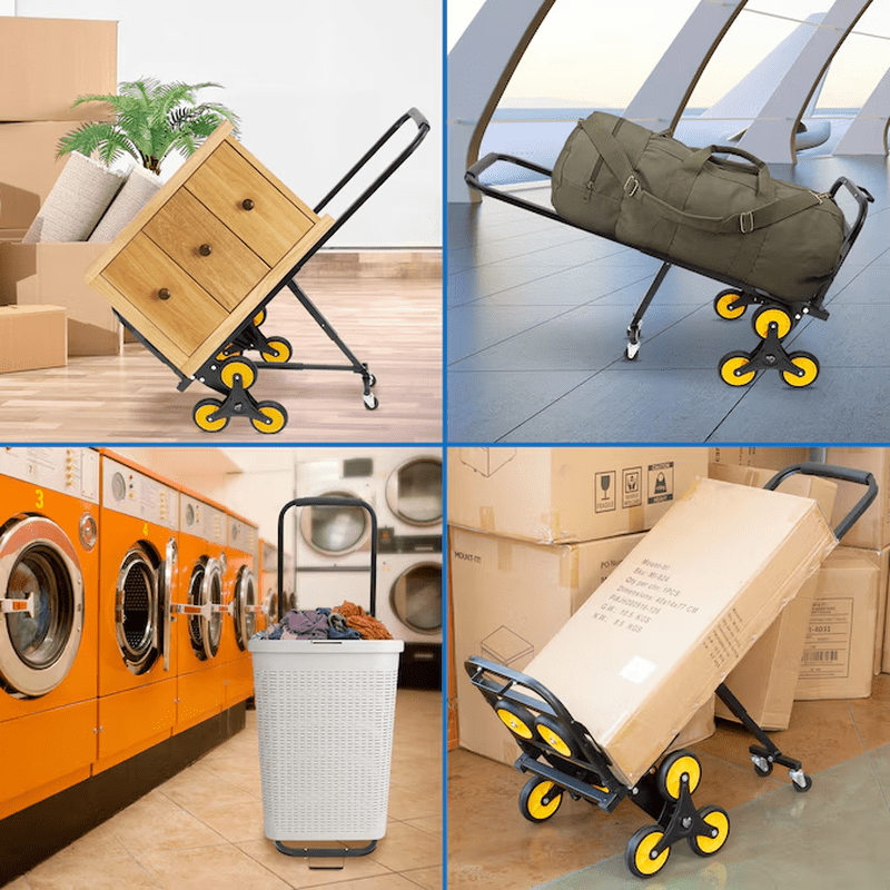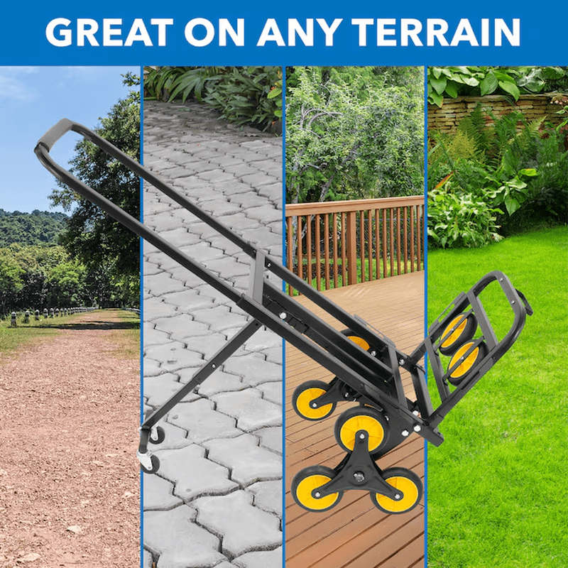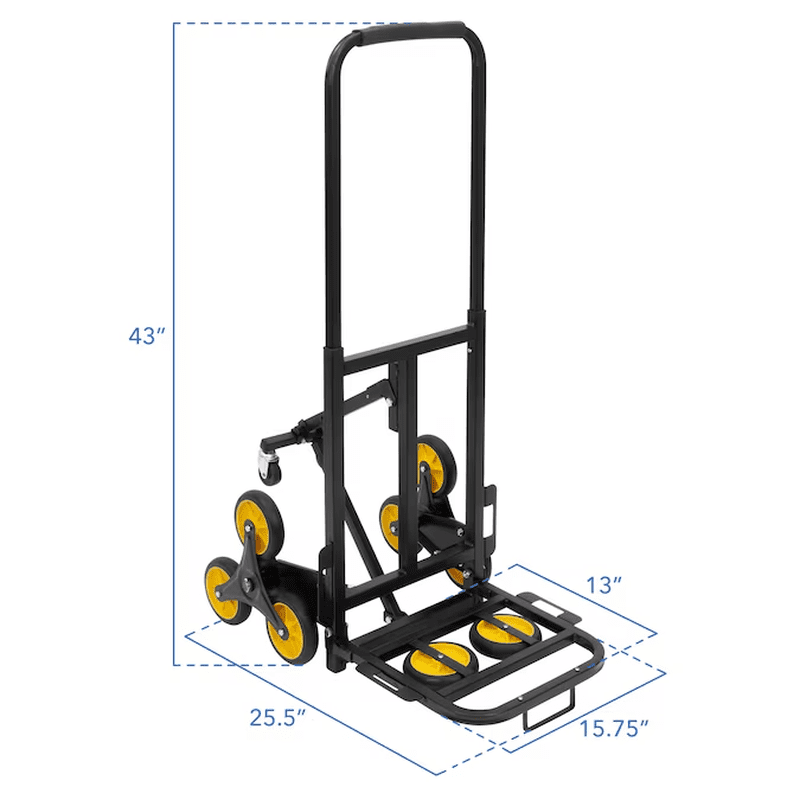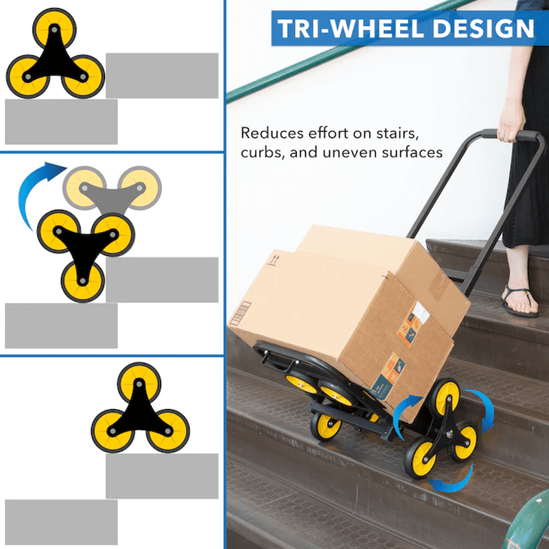 - The triple support design of our 3 wheel stair climbing folding cart disperses weight making it feel like less of dead load – reducing strain on your back.
