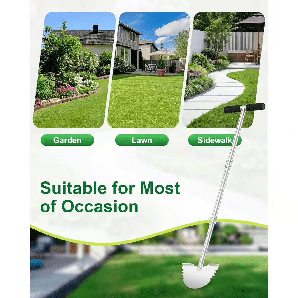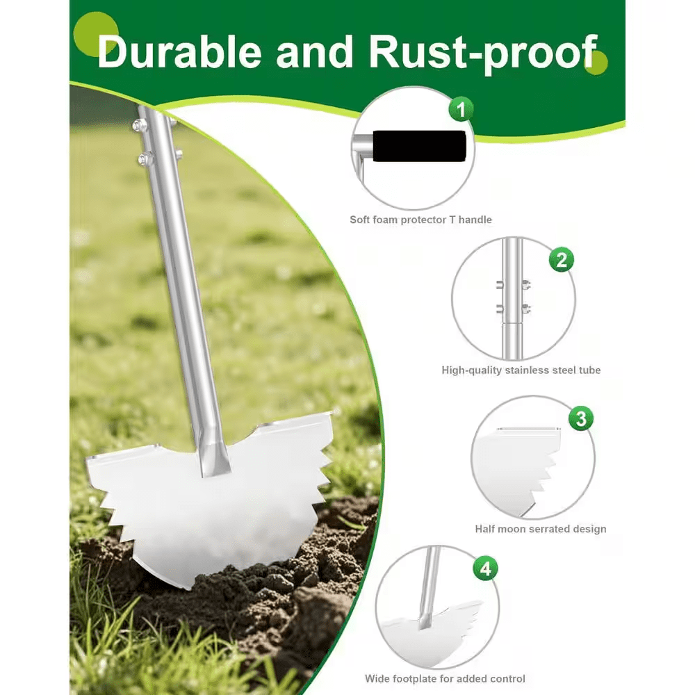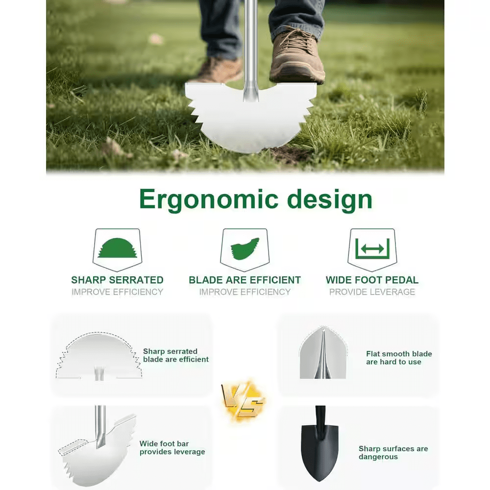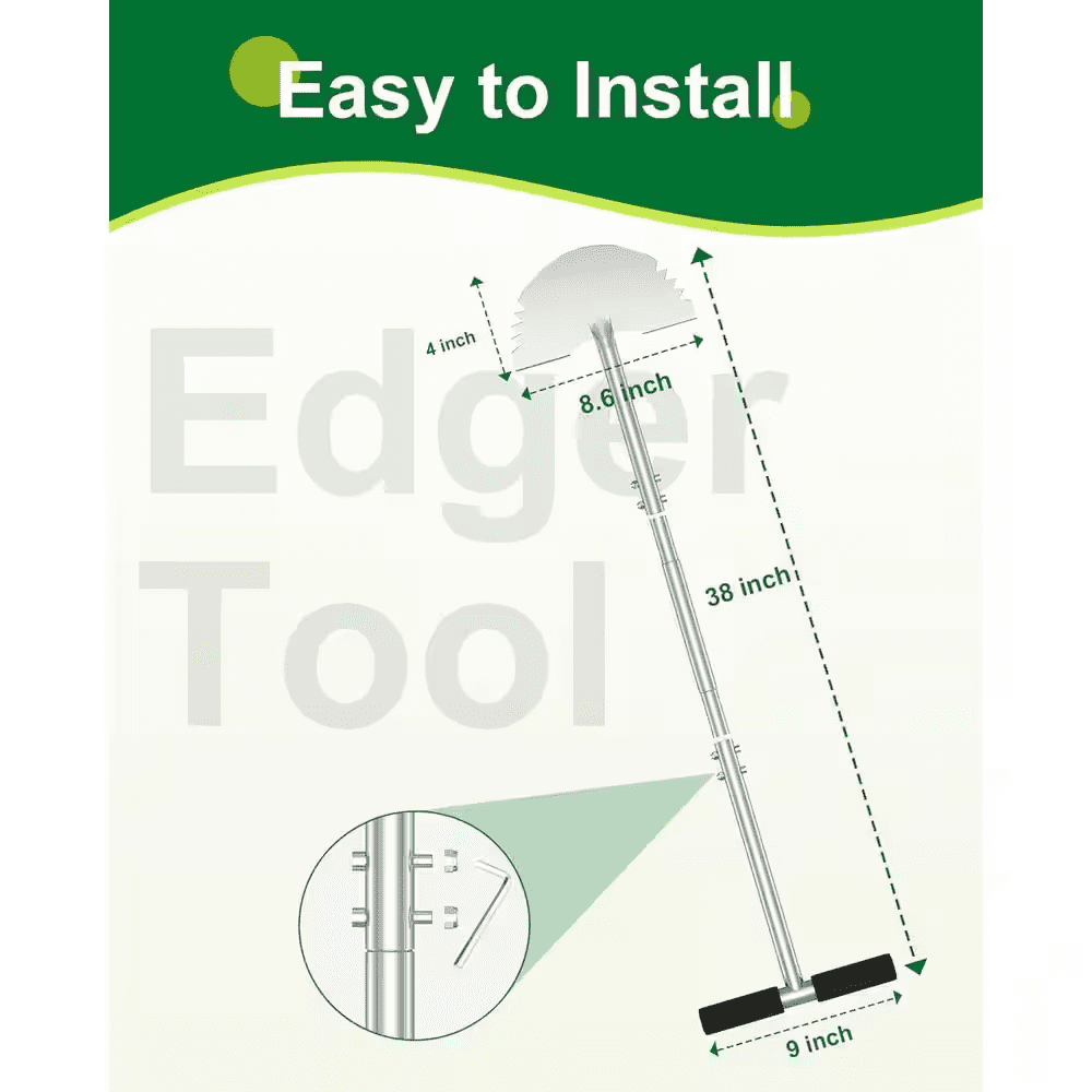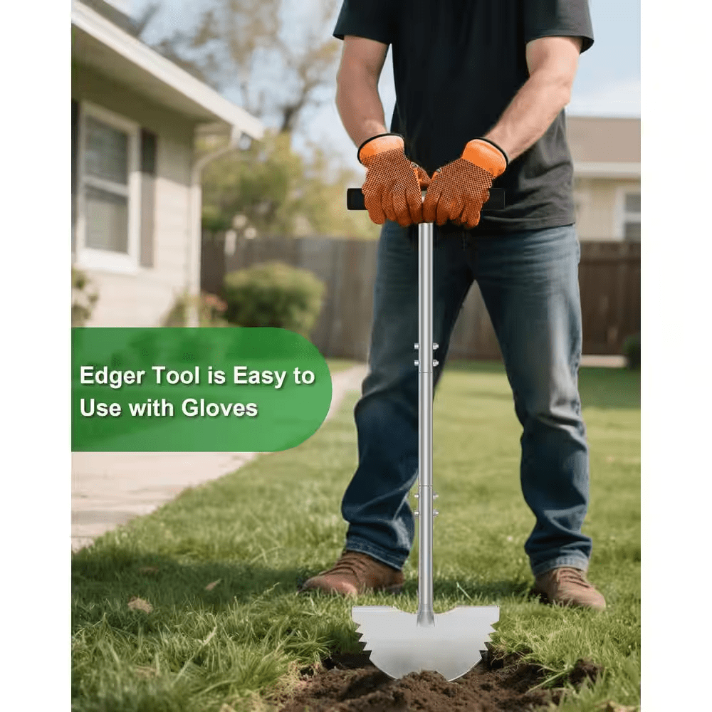 This 38 in. serrated edger lawn tool is designed for precise and efficient yard maintenance. Featuring a durable half-moon serrated steel blade, it cuts through grass and soil more effectively than flat shovels. The wide footrest offers added leverage and stability, allowing for clean, straight edges with minimal effort. Its ergonomic T-handle provides a comfortable grip and reduces hand strain, making it easier to work longer without fatigue. The long handle also minimizes the need to bend, helping to reduce back stress during use. Made from rust-proof, high-quality steel with a water-resistant coating, this lawn edger is built to withstand regular outdoor use and varying weather conditions. It’s suitable for edging sidewalks, driveways, flower beds, and garden borders. The tool also doubles as a sod cutter and is great for small trenching jobs such as cable or wire burial. Easy to use and store, it comes with gloves to protect your hands while working. Ideal for homeowners, gardeners, and landscapers who want a clean, professional-looking lawn.