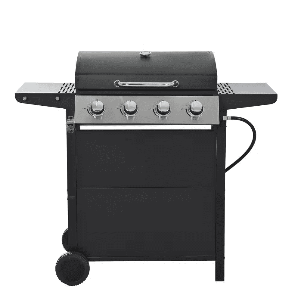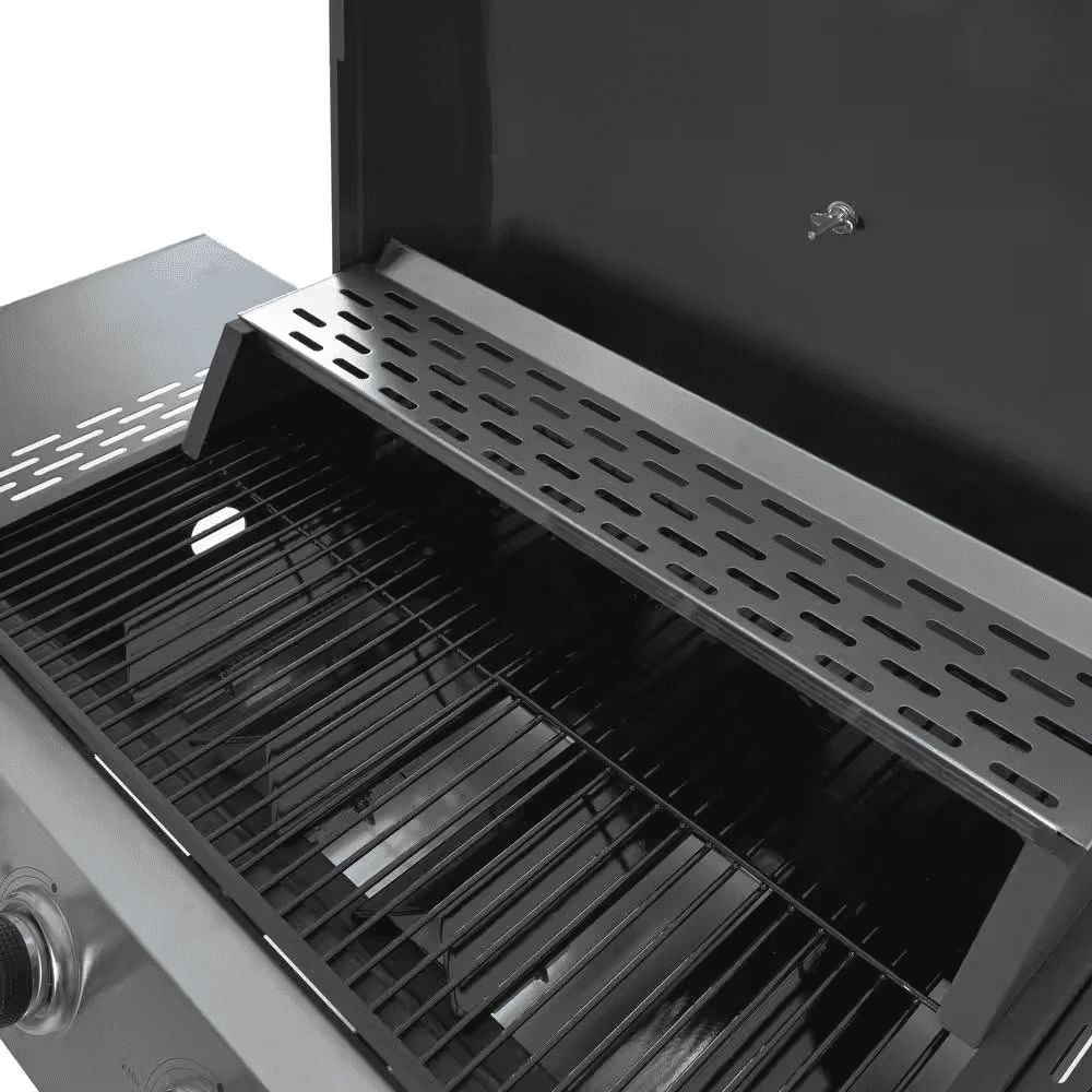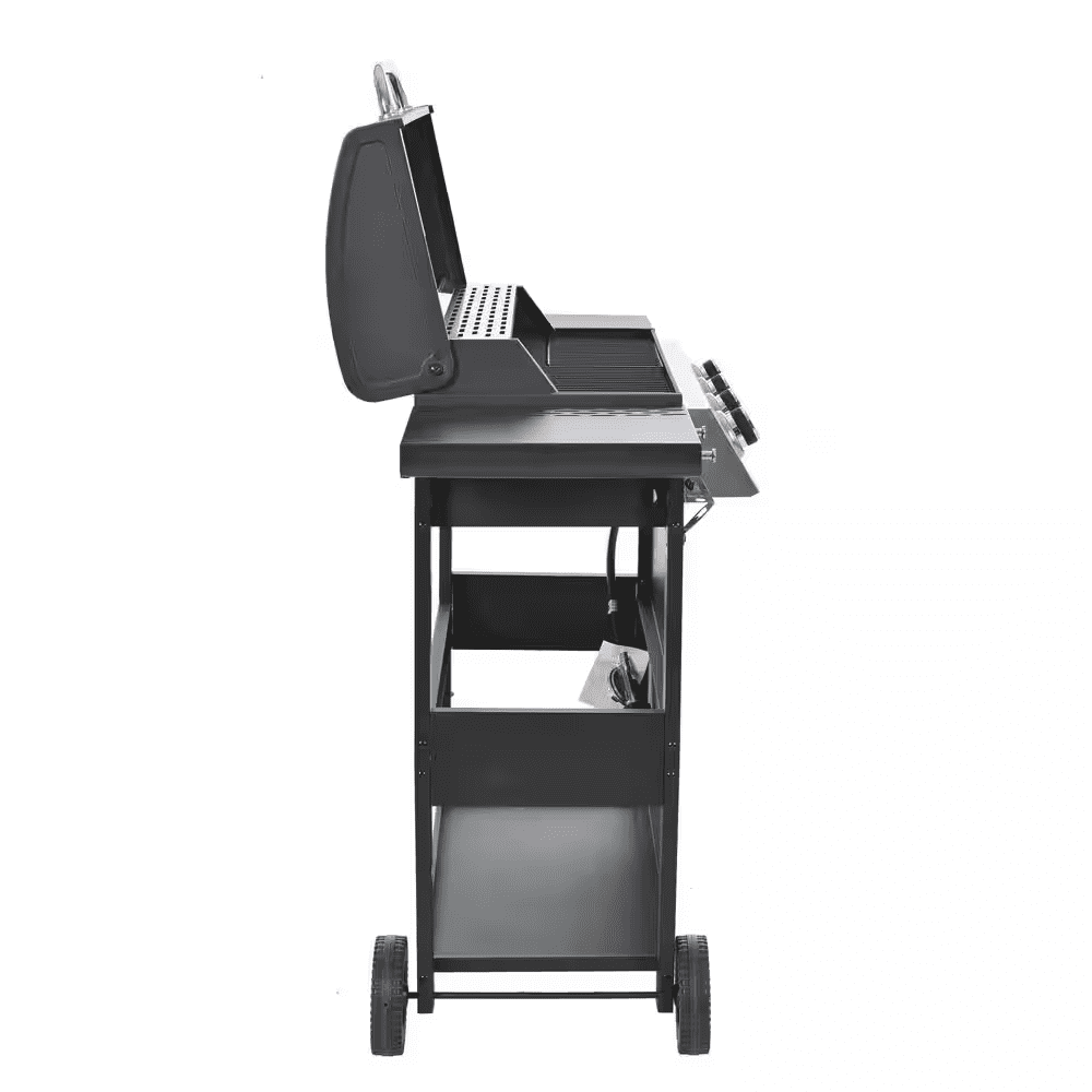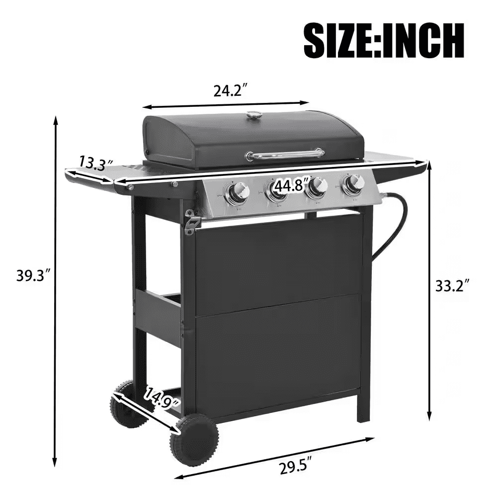 STAINLESS STEEL BURNERS: This propane gas grill has 4 Stainless Steel burners, can put out 34,200 BTU-per-hour with integrated piezoelectric ignition system, quick start up with the push andturn of a control knob. The whole Stainless steel control panel with chromium plating control knob makes this propane gas grill more study and delicate. A stainless steel handle and a built-in stainless steel thermometer on the cover lid, 2-tables and 2-wheel casters for storage and moving.