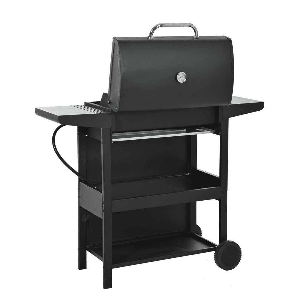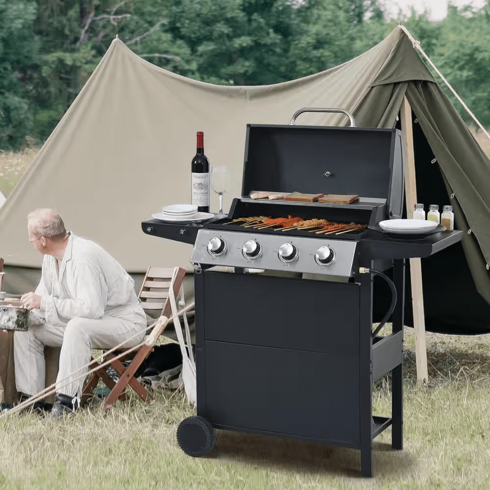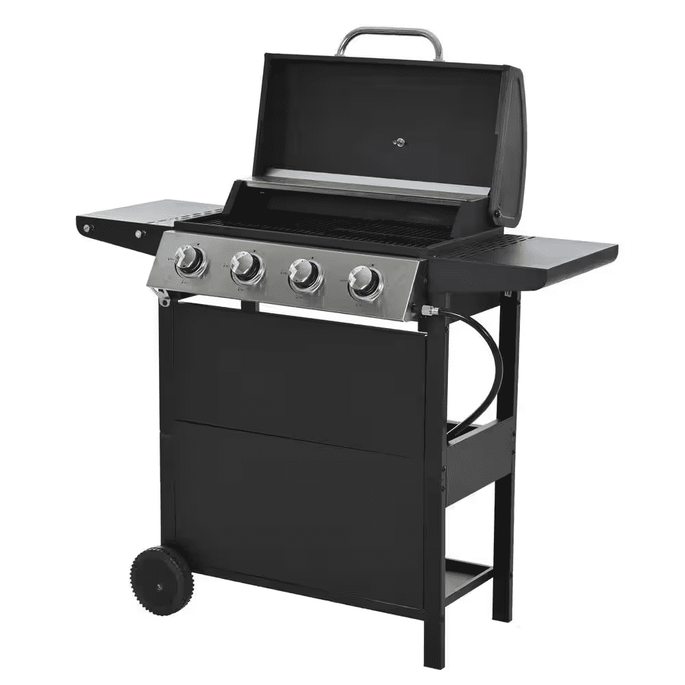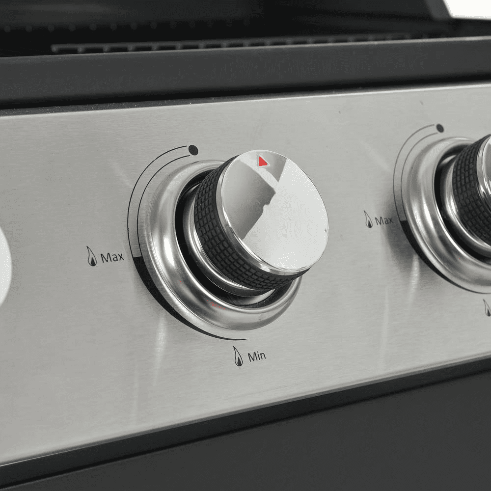 STAINLESS STEEL BURNERS: This propane gas grill has 4 Stainless Steel burners, can put out 34,200 BTU-per-hour with integrated piezoelectric ignition system, quick start up with the push andturn of a control knob. The whole Stainless steel control panel with chromium plating control knob makes this propane gas grill more study and delicate. A stainless steel handle and a built-in stainless steel thermometer on the cover lid, 2-tables and 2-wheel casters for storage and moving.