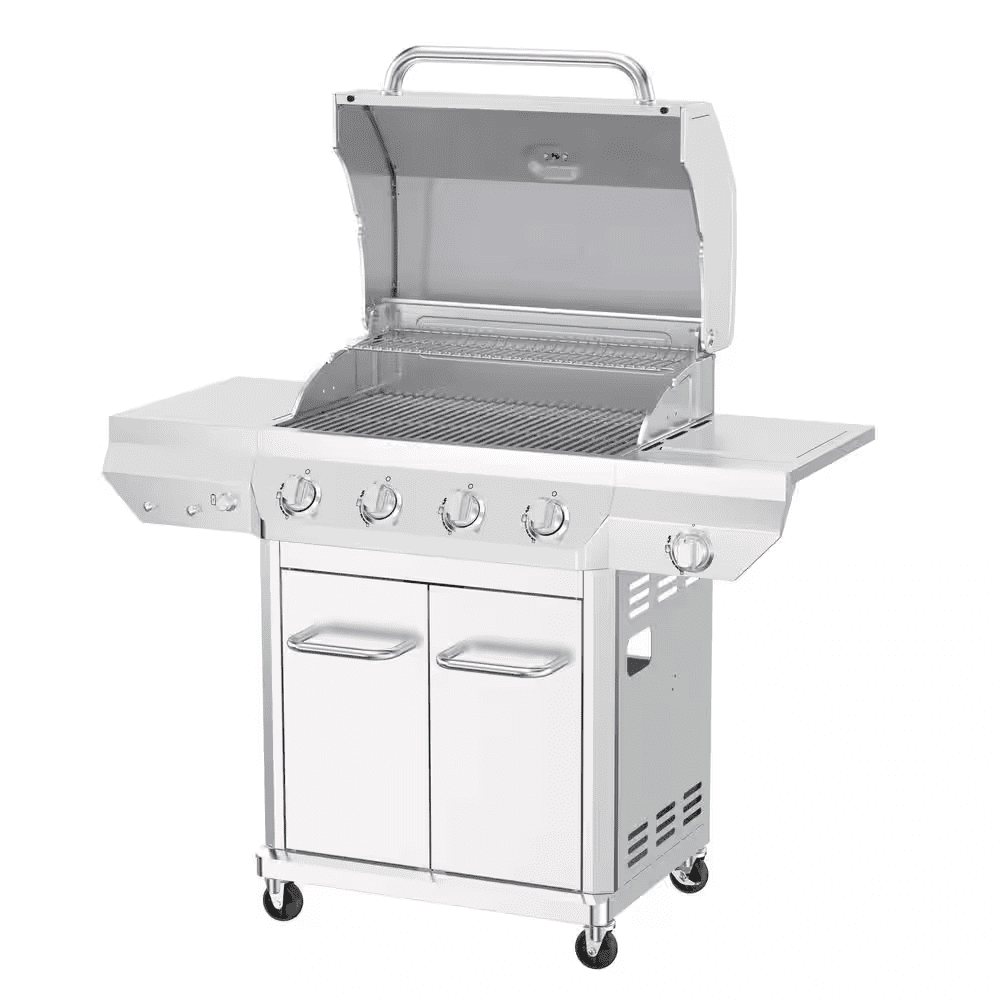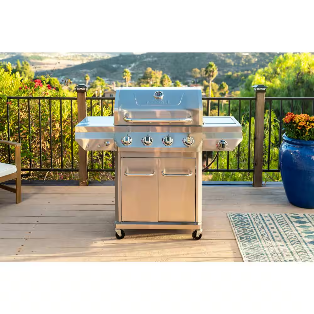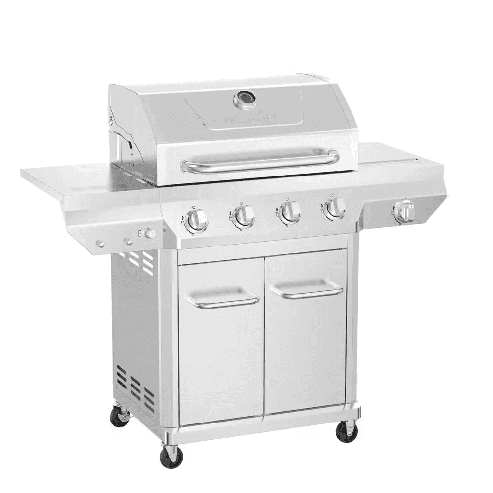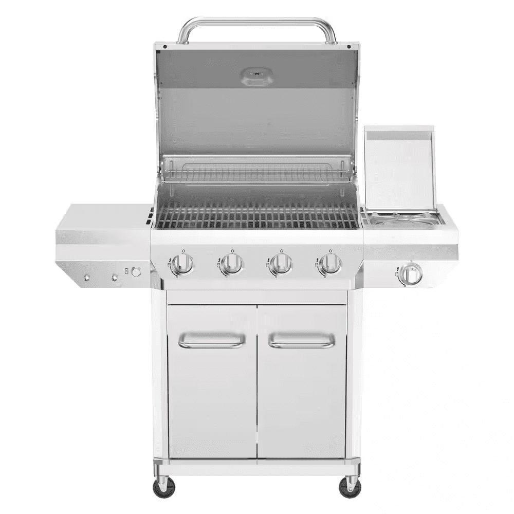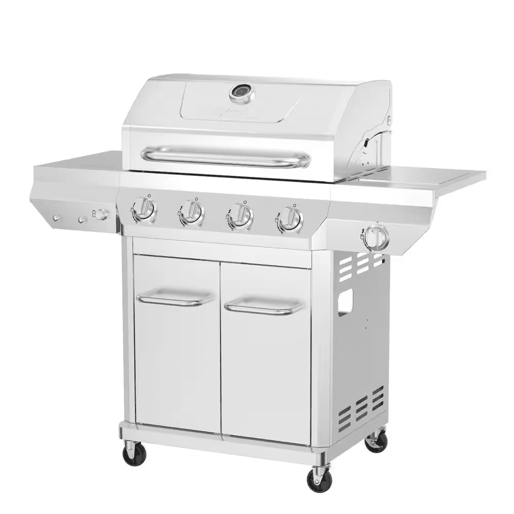 Experience grilling like never before With the Nexgrill 4-Burner Propane Gas Grill in Stainless Steel With Side Burner. With 621 sq. in. of total cooking space, 4 main burners and 1 side burner supplying 60,000 BTU of flame-roasting energy, this unit is sure to meet your grilling expectations. The even heat cooking system, With stainless steel burners, angled flame tamers and stainless steel cooking grids, works together to distribute consistent heat across the entire grilling surface while reducing flare-ups. An electronic ignition allows it to fire up instantly and an upper-level warming rack provides a place to heat buns and keep foods toasty. Casters make it easily mobile and the built-in thermometer enables precise temperature regulation. Make your next grilling experience extraordinary With the Nexgrill 4-Burner Propane Gas Grill in Stainless Steel With Side Burner.
