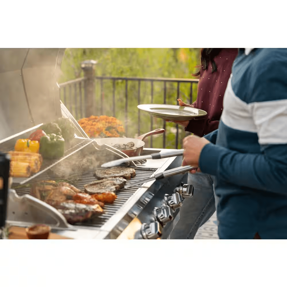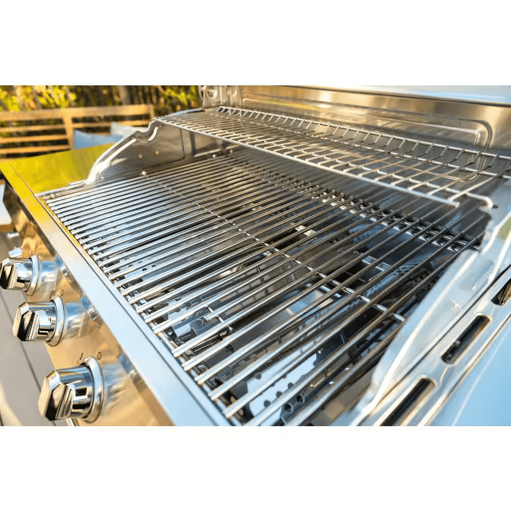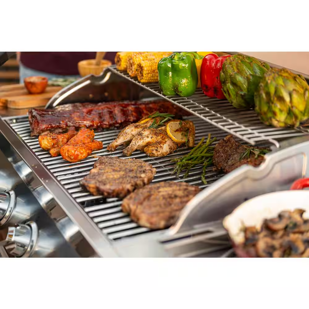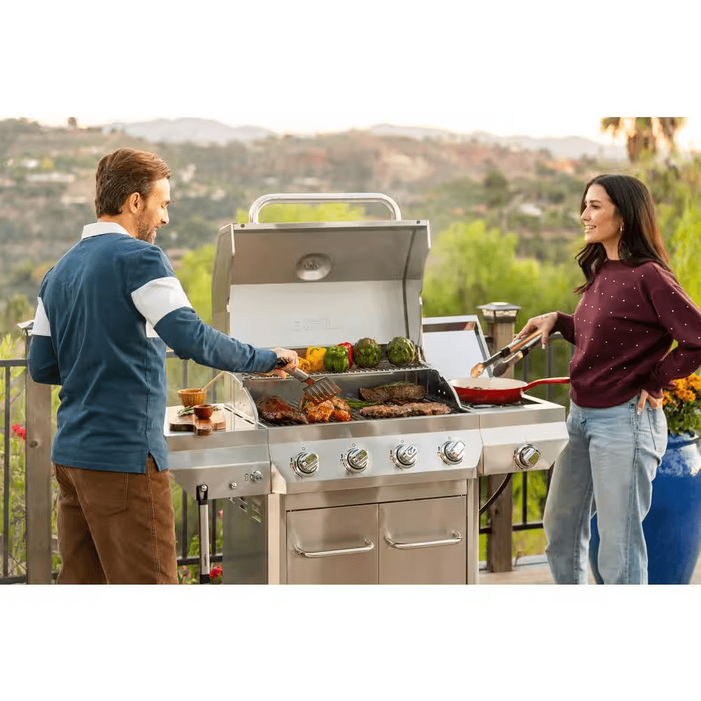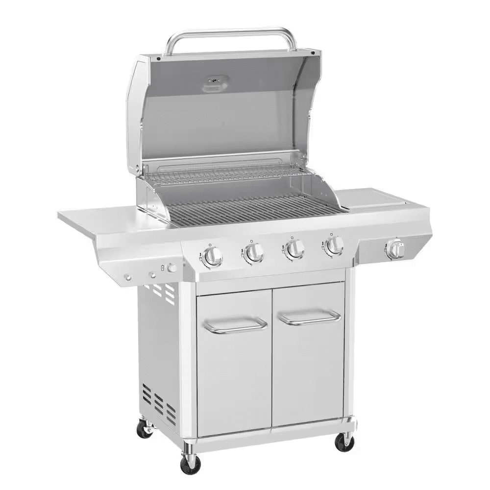Experience grilling like never before With the Nexgrill 4-Burner Propane Gas Grill in Stainless Steel With Side Burner. With 621 sq. in. of total cooking space, 4 main burners and 1 side burner supplying 60,000 BTU of flame-roasting energy, this unit is sure to meet your grilling expectations. The even heat cooking system, With stainless steel burners, angled flame tamers and stainless steel cooking grids, works together to distribute consistent heat across the entire grilling surface while reducing flare-ups. An electronic ignition allows it to fire up instantly and an upper-level warming rack provides a place to heat buns and keep foods toasty. Casters make it easily mobile and the built-in thermometer enables precise temperature regulation. Make your next grilling experience extraordinary With the Nexgrill 4-Burner Propane Gas Grill in Stainless Steel With Side Burner.