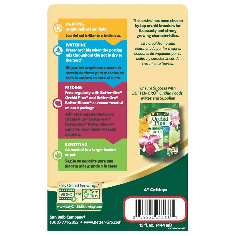 The Better-Gro Orange Cattleya Packaged Orchid allows you to grow a large 4 in. blooming orchid within your own home. The Cattleya is an ideal type of orchid for novices and can be transplanted into a larger pot. The orchid should be re-planted annually for best results and provided with bright light but protected from direct sunlight.