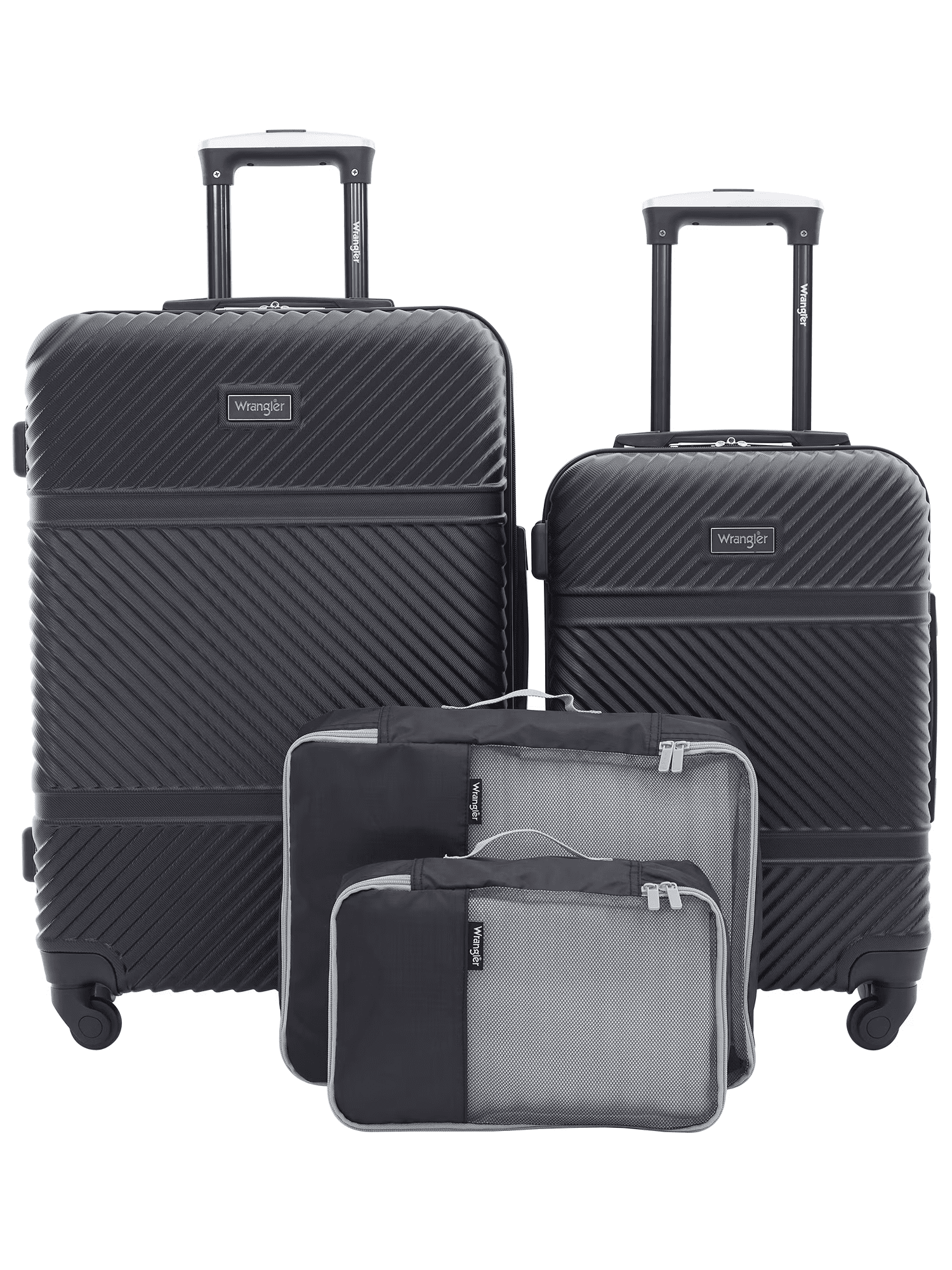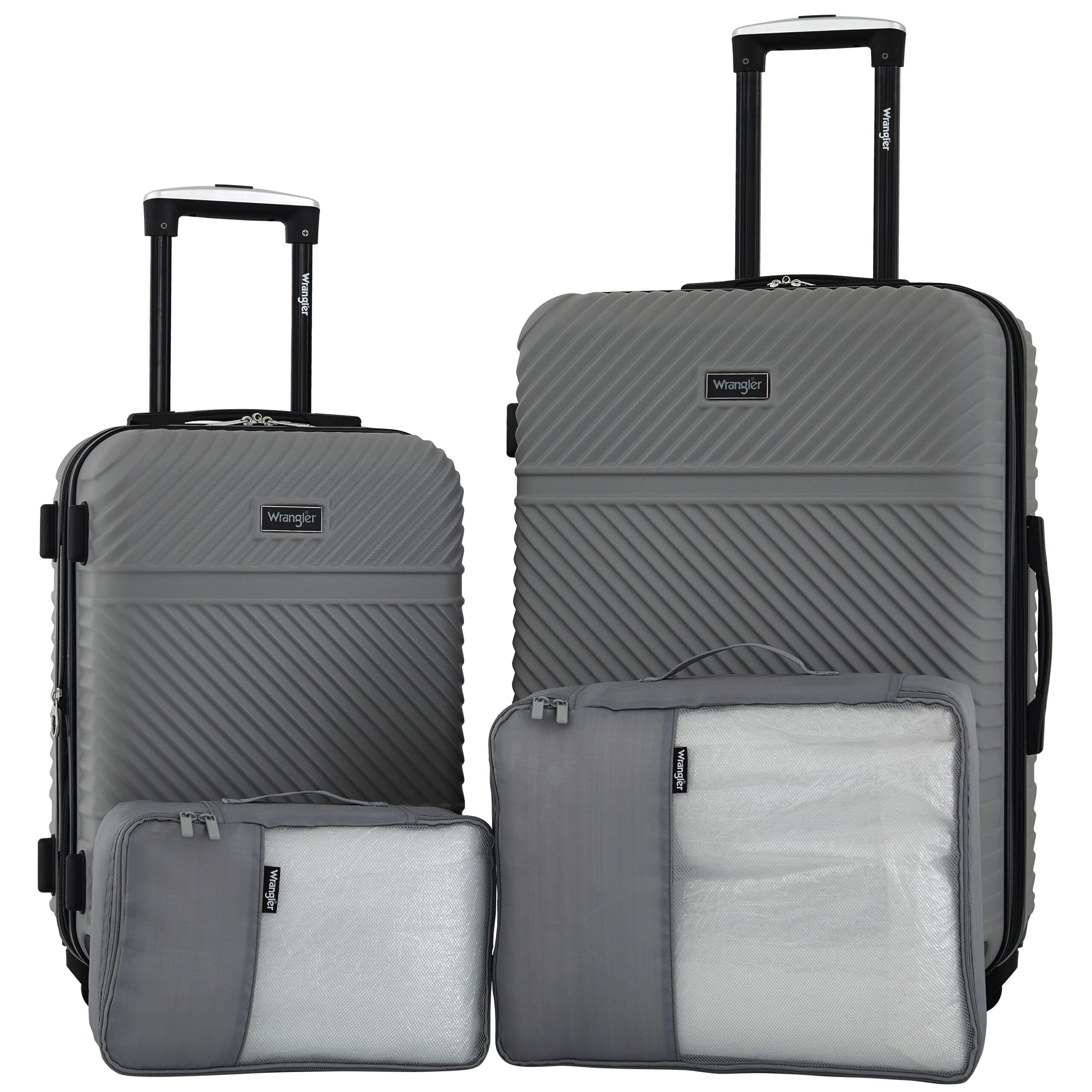 Travel in riveting style with Wrangler’s 4-piece Hard side Spinner Luggage Set. Well-equipped, durable, and robust, this 4-piece set includes a 25” checked suitcase, 20” rolling carry-on, and a 12” packing cube on top of a 15” larger packing cube to suit your organizational needs. The hard side is 100% ABS, a durable and flexible material that is made to absorb shocks and impacts on contact and ‘flex’ back into its original shape. In addition, this set comes loaded with more quality features. The push-button telescopic handle with a contoured grip paired with the 360-degree multi-directional spinner wheels create a completely weightless and smooth rolling experience that relieves any pressure from your arms, especially if the suitcase is packed to the brim. The fully lined interior is spacious and comes with a divider panel to separate and organize your packing essentials. This feature can be further utilized with packing cubes to help compartmentalize your packing needs. Measured at 25” x 16.5” x 11” and 20” x 13.5” x 9”, this set has excellent value and is available only on Walmart. Com and selected stores.