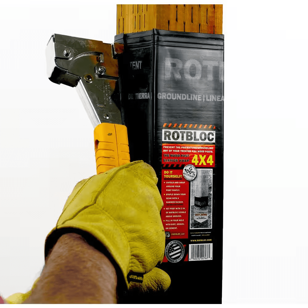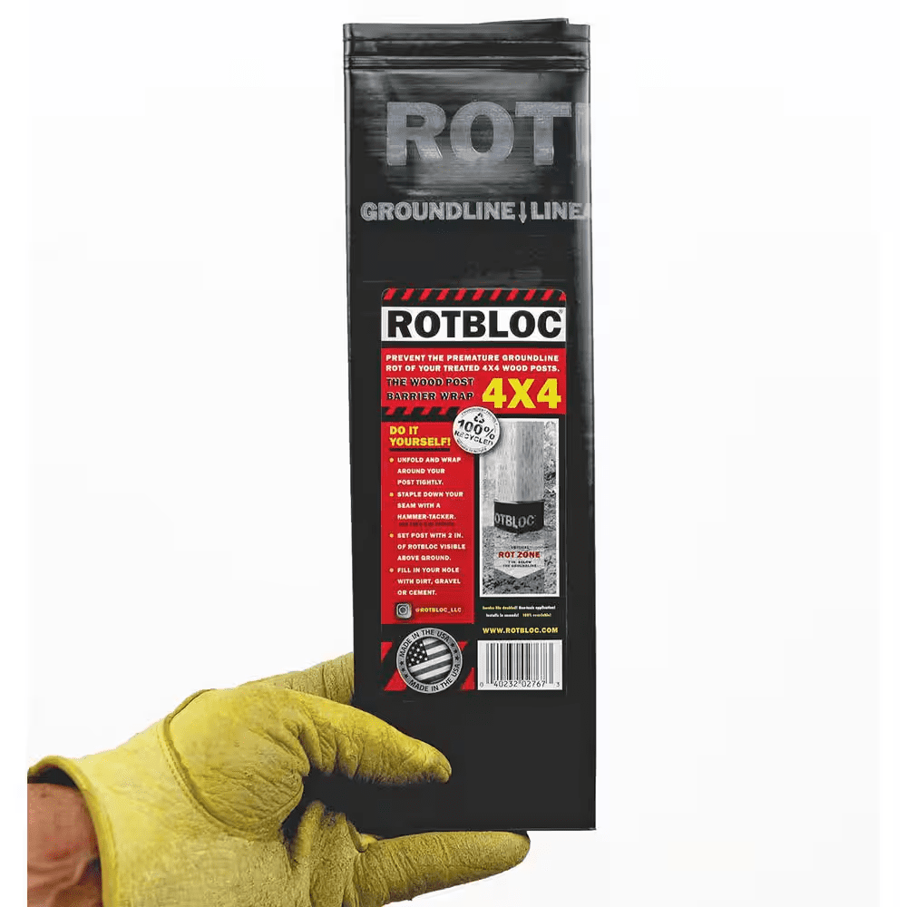 Block the rot and maximize the service life of your wood posts. ROTBLOC 4 x 4 Post Wraps target premature groundline rot of chemically treated wood posts. Groundline rot is the leading cause of 4 x 4 post failures. ROTBLOC is a durable barrier wrap that prevents the natural elements of decay from breaking down your posts prematurely. ROTBLOC is designed for a quick and intuitive installation that you can do yourself in-seconds with a tack-hammer. ROTBLOC patented products are made from 100% recycled material and are 100% recyclable. ROTBLOC LLC invents and manufactures 100% of all of our products in the USA. ROTBLOC LLC has successfully upcycled and converted over half a million pounds of plastic into our zero-waste family of products. Visit us at website for more information.