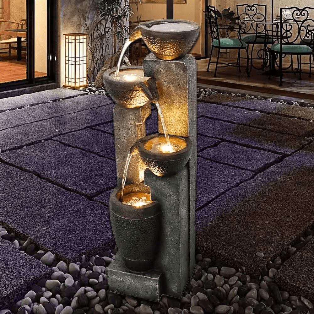 Relax and enjoy the sounds of nature with this outdoor waterfall fountain With the high-quality resin fountain, you will create a meditative, relaxing atmosphere, even in an urban jungle. The waterfall feature looks great in your garden, patio, deck, porch, or yard space, etc. Take in the tranquil sounds of the water gently cascading over the natural-looking fountain tiers. The resin, stone powder, and fiberglass construction are weatherproof, rust-resistant, and durable for years of quality use. When start using, simply plug into an outdoor outlet, fill the lower level with enough water, and watch as the interior pump creates a lovely water flow reminiscent of a lush rainforest. LED lights embedded in the tiers will illuminate your space, drawing attention to the relaxing water pools day or night for added ambiance.