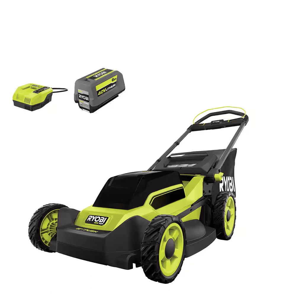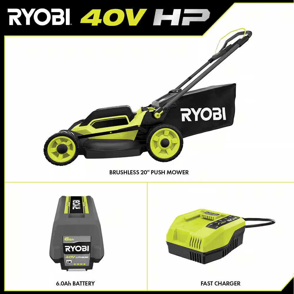 The RYOBI 40V HP Brushless 20″ Push Mower delivers more power than a 150cc gas mower, making it a true gas replacement. The included 40V 6Ah lithium battery provides up to 45 minutes of runtime, making it ideal for up to 1/2 acre. The brushless motor and advanced electronics automatically react to mowing conditions by increasing the blade speed to eliminate bogging down and powering through the toughest cut. This mower is equipped with a single-point height adjustment allowing you to easily select the perfect height for your lawn. When you’ve finished mowing, simply fold the handles and store vertically for compact storage in tight spaces. Best of all, it is part of the RYOBI 40V system where any 40V battery works with any 40V product. This mower is backed by the RYOBI 5-Year Manufacturer’s Tool Warranty, 3-Year Manufacturer’s Battery Warranty, and includes RY401017 40V HP Brushless 20 in. Push Mower, OP40605 40V 6Ah Lithium Battery, OP408 40V Fast Charger, Grass Catcher Bag, Start Key, Mulch Plug, Side Discharge Chute, and Operator’s Manuals.