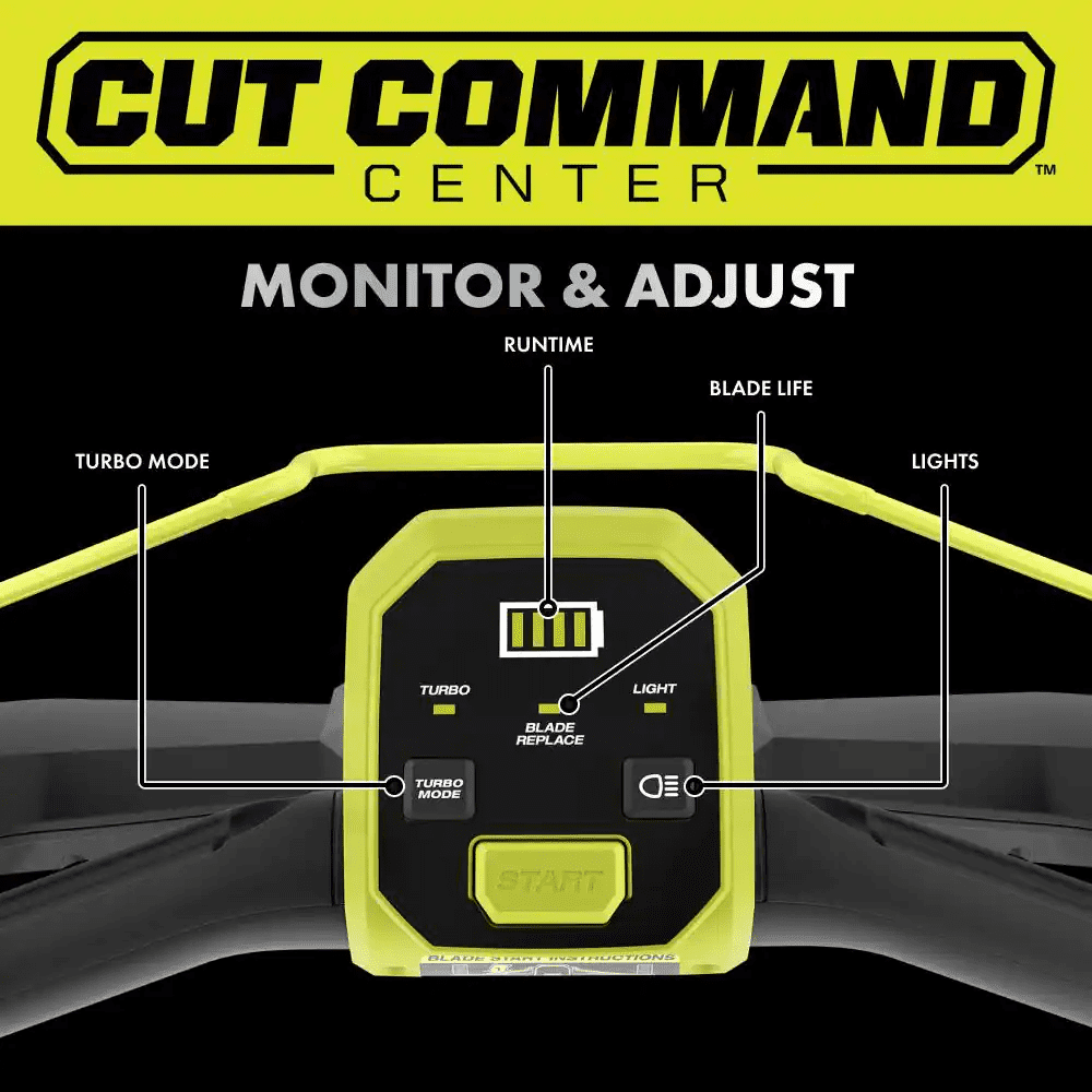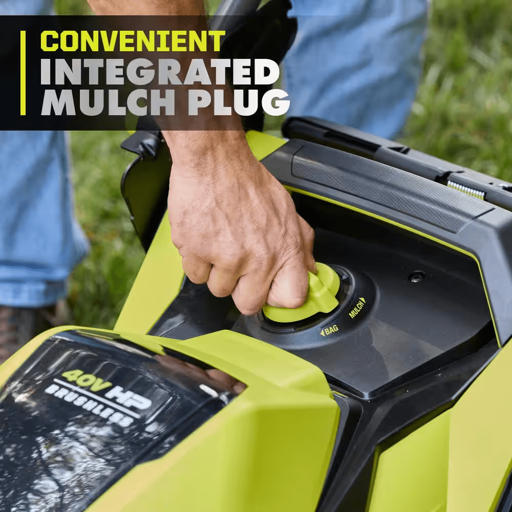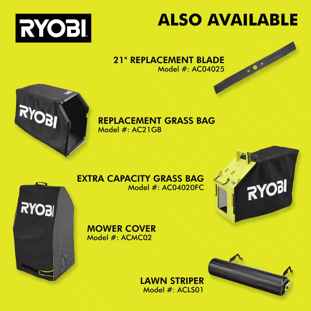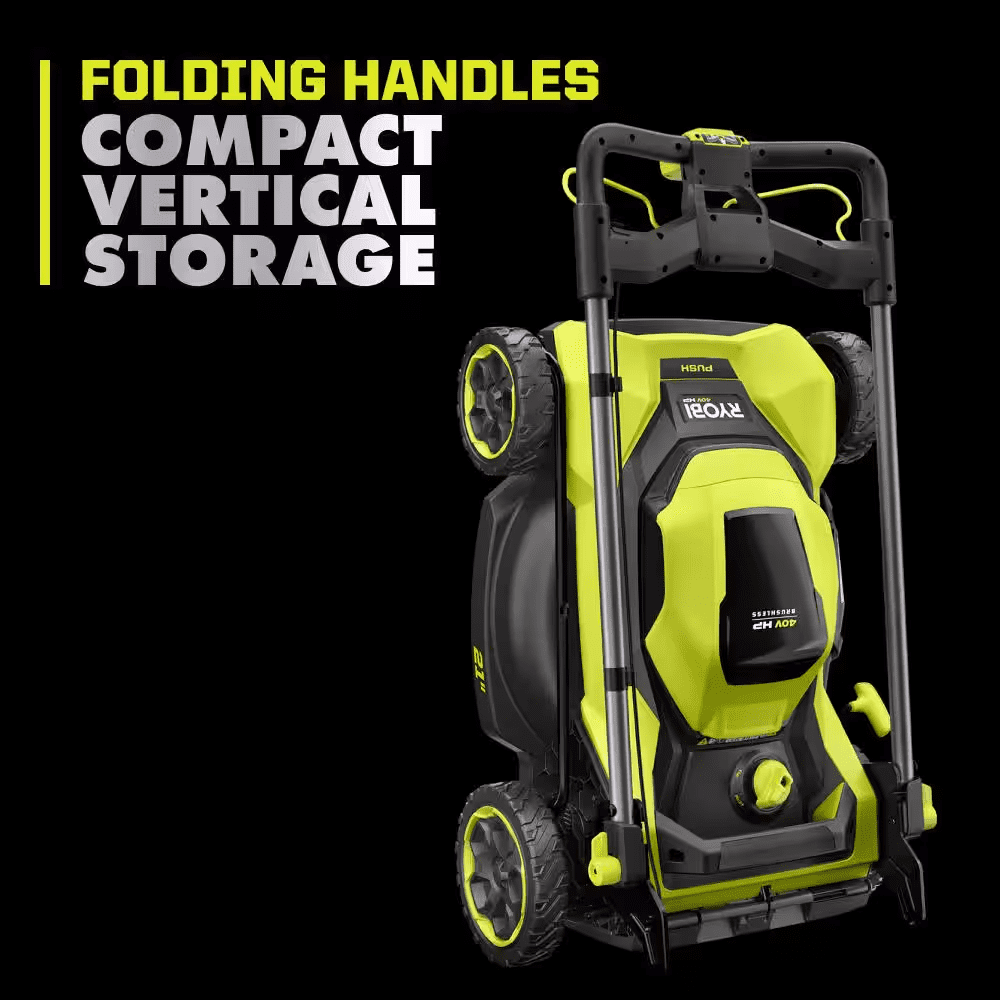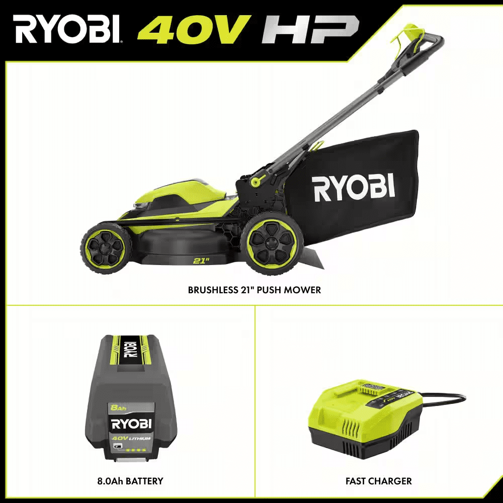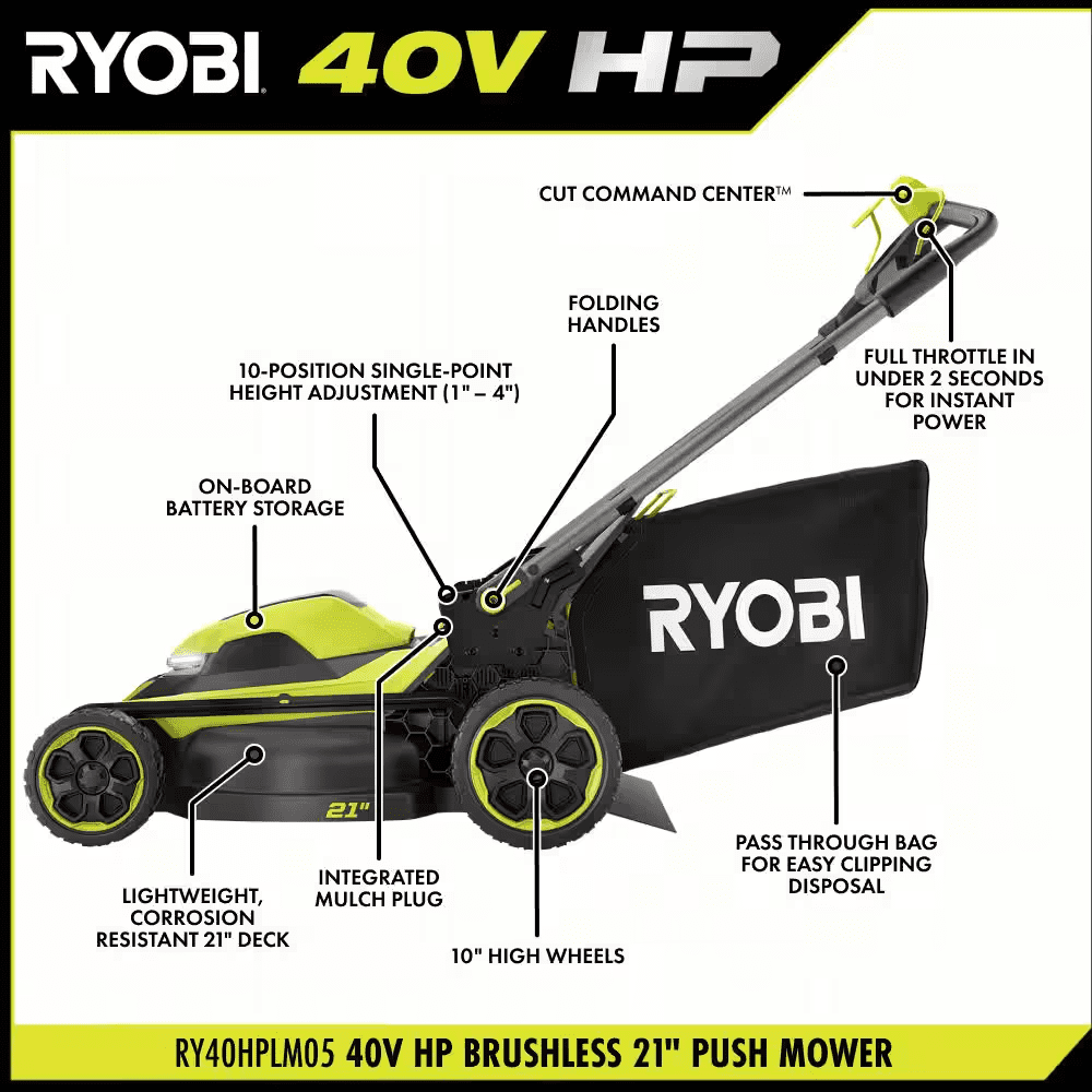The RYOBI 40V HP Brushless 21″ Push Mower Kit delivers more power than a 163cc gas mower, making it a true gas replacement. The included 40V 8Ah battery provides up to 55 minutes of runtime, making it ideal for up to 1/2 acre. The brushless motor and advanced electronics automatically react to mowing conditions by increasing the blade speed to eliminate bogging down and powering through the toughest cut. The CUT COMMAND CENTER helps you monitor runtime and blade life & activate turbo mode and lights right at your fingertips. Achieve an extra boost to power through tough grass with the turbo mode. This mower is equipped with a single-point height adjustment allowing you to easily select the perfect height for your lawn. When you’ve finished mowing, simply fold the handles and store vertically for compact storage in tight spaces. The 21″ durable composite deck is lightweight, resists corrosion, and is covered by a lifetime warranty. Best of all, it is part of the RYOBI 40V system where any 40V battery works with any 40V product. This mower is backed by the RYOBI 5-Year Manufacturer’s Tool Warranty, 3-Year Manufacturer’s Battery Warranty, and includes RY40HPLM05 40V HP Brushless 21″ Push Mower, OP4080A 40V 8Ah Battery, OP408 40V Fast Charger, Grass Catcher Bag, Start Key, Side Discharge Chute, and Operator’s Manuals.