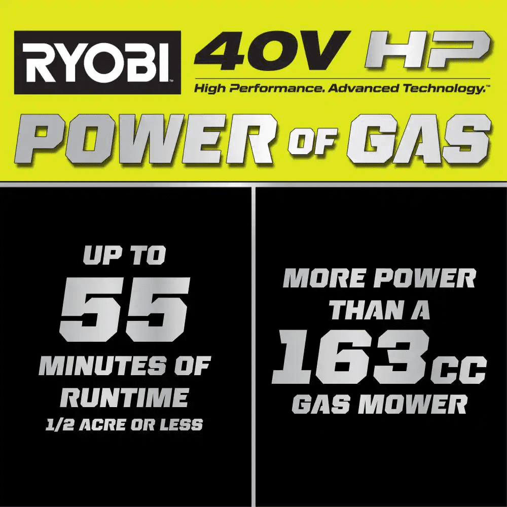 • 40V HP Technology Delivers More Power Than a 163cc Gas Mower