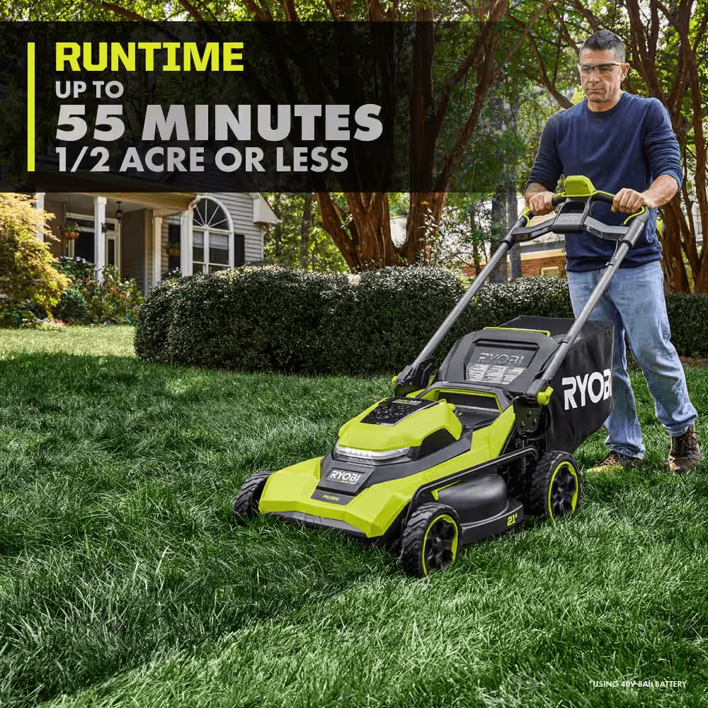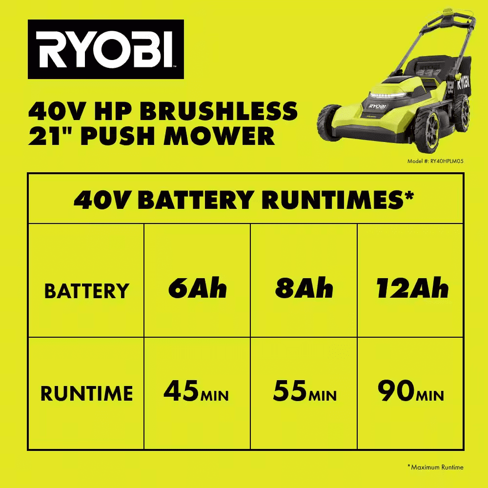 • Lawn Mower is Ideal for 1/2 Acre With up to 55 Min. Runtime