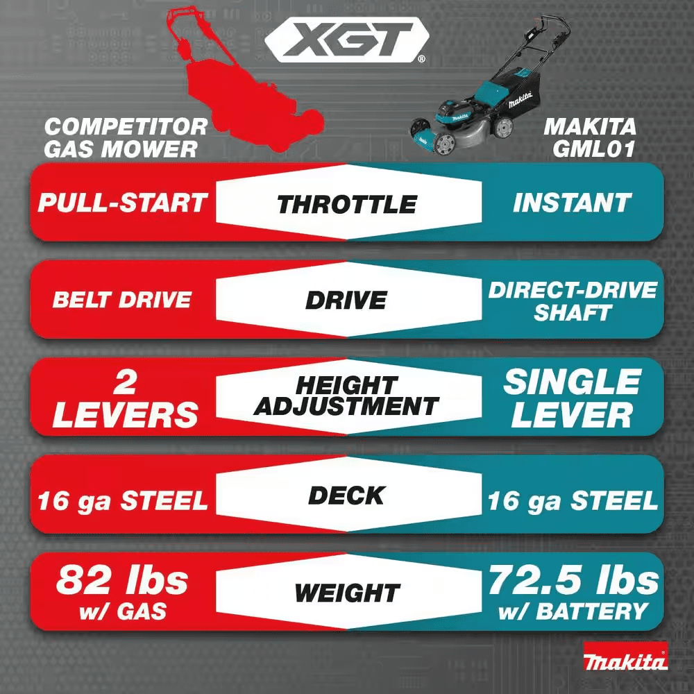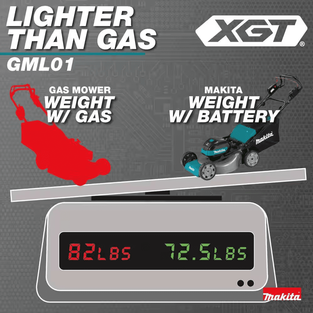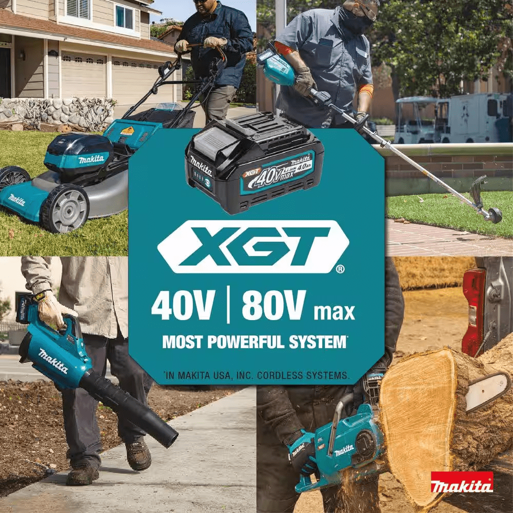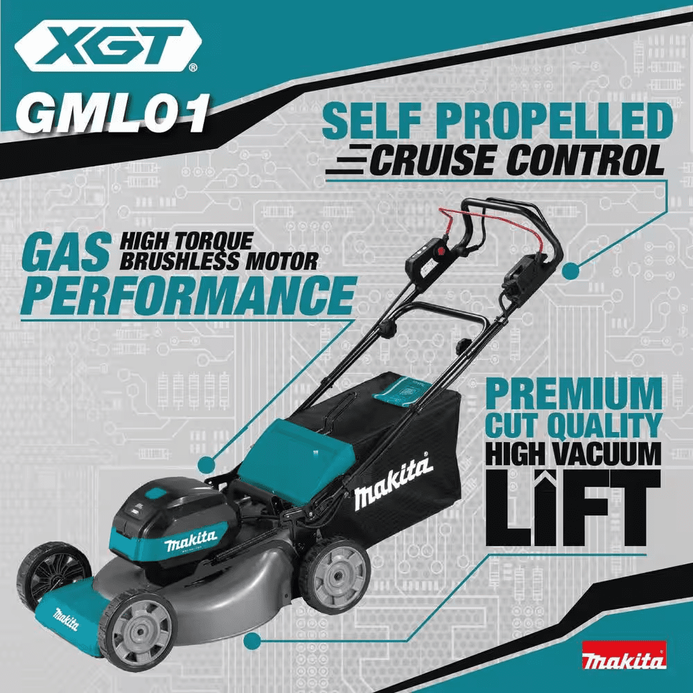 Landscapers are demanding more cordless alternatives to gas-powered outdoor power equipment. Makita is meeting demand with an expanding collection of cordless lawn mowers, 40V max XGT Brushless 21 in. Self-Propelled Commercial Lawn Mower (GML01PL). With zero emissions, lower noise, and considerably less maintenance than gas-powered mowers, this lawn mower is a welcome solution for landscapers. The 21 in. Self-Propelled Commercial Lawn Mower features a high torque motor that delivers gas performance, with high vacuum lift for premium cut quality. The Makita-built brushless motor delivers up to 2, 800 RPM. It can cut up to 1-1/5 acre with (2) 40V XGT 8.0Ah batteries. Quiet mode reduces noise by providing constant speed control at 2, 300 RPM. The GML01P features self-propelled cruise control technology with variable speed (1 MPH – 3 MPH) and features a commercial grade steel deck. A 3-in-1 design allows for mulching, bagging, or side discharge. The mower features large, 9 in. wheels for rough terrain, while steel ball bearings in the wheels provide a smoother drive with better maneuverability and increased durability. A single lever quickly adjusts the cutting height (1-1/4 in. – 4 in. ). The lawn mower features IPX4 weather-resistant construction and exclusive Extreme Protection Technology (XPT). XPT is a protective seal inside the tool and is engineered for improved operation in harsh conditions by channeling water and dust from key internal components.
