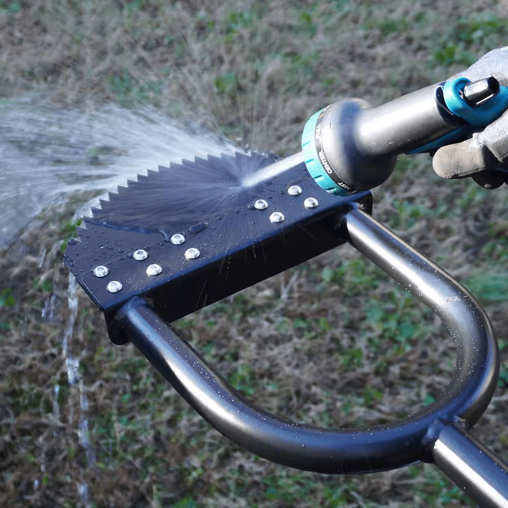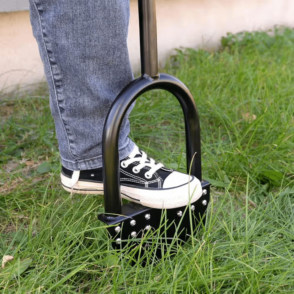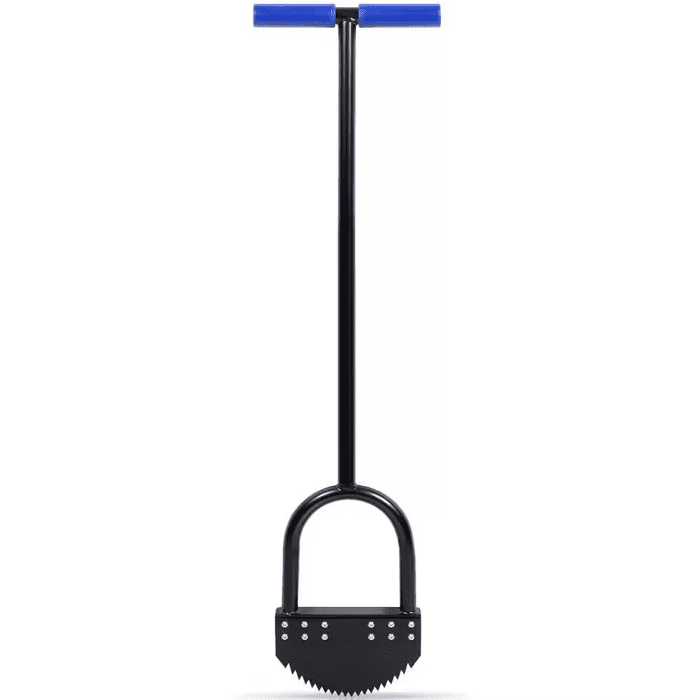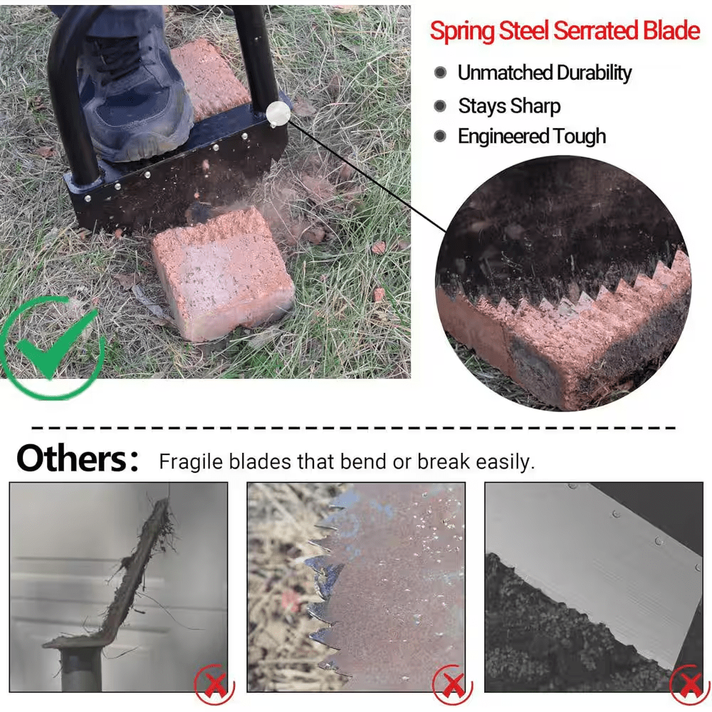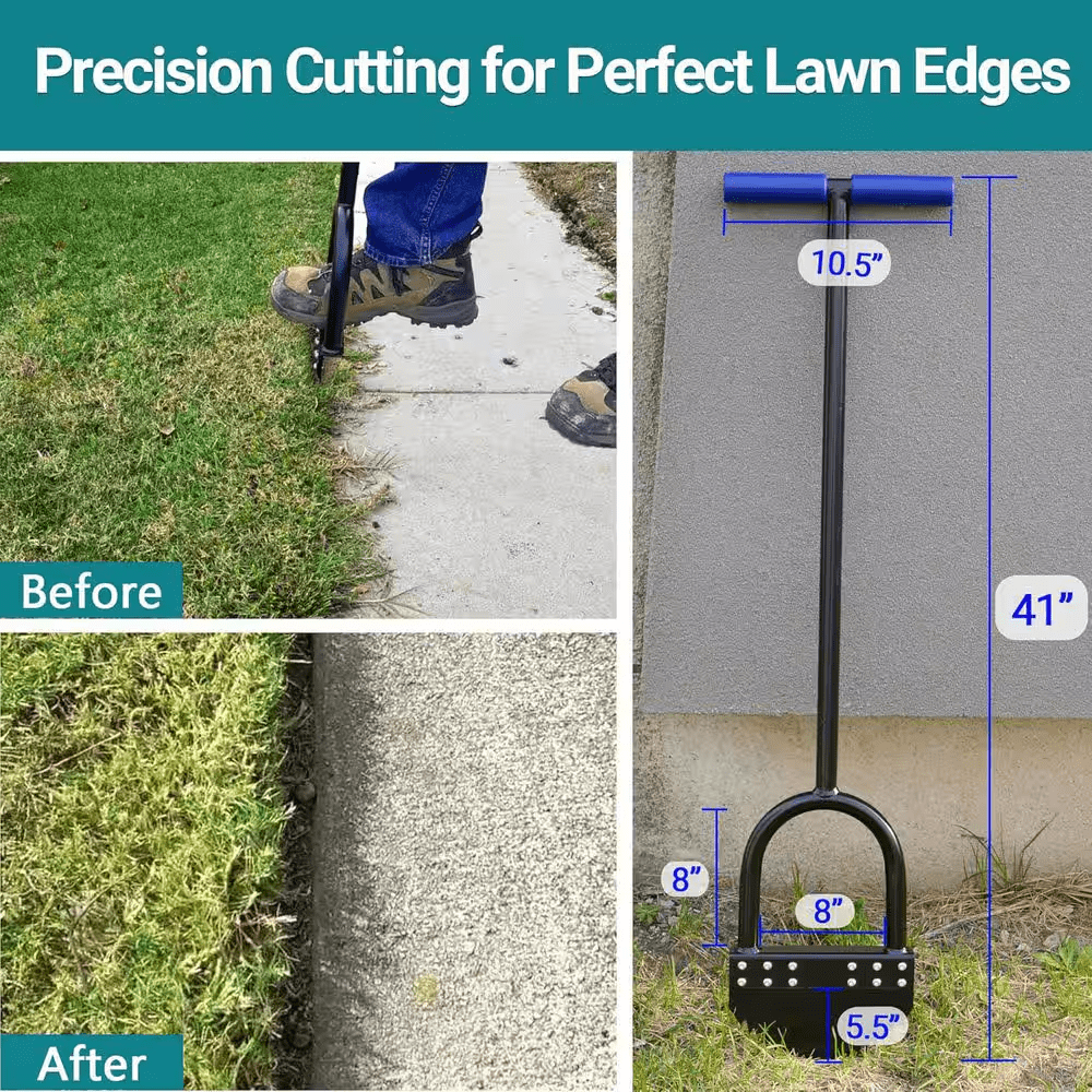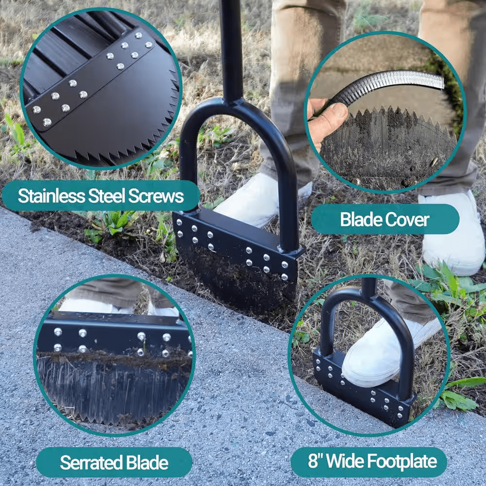 This 41 in. manual edger lawn tool offers exceptional strength with its 1-Piece construction, eliminating the need for assembly and ensuring long-lasting durability without bending or breaking. The serrated spring steel blade delivers precise, clean cuts while maintaining its sharpness, even under heavy use or in tough soil conditions. Made from rustproof manganese steel, it withstands outdoor elements and remains easy to clean and low maintenance over time. An 8 in. wide footplate provides enhanced leverage, allowing users to apply consistent pressure comfortably and efficiently, regardless of shoe size. Designed for versatility, this edger handles various lawn and garden tasks, from shaping borders along sidewalks and flower beds to creating planting grooves and trimming overgrown grass. The comfortable rubber handle ensures a secure, non-slip grip for better control during extended use. With its patent pending design and combination of strength, cutting efficiency, and ergonomic comfort, this half moon edger is a reliable and practical solution for keeping any lawn or garden looking sharp and well-maintained.