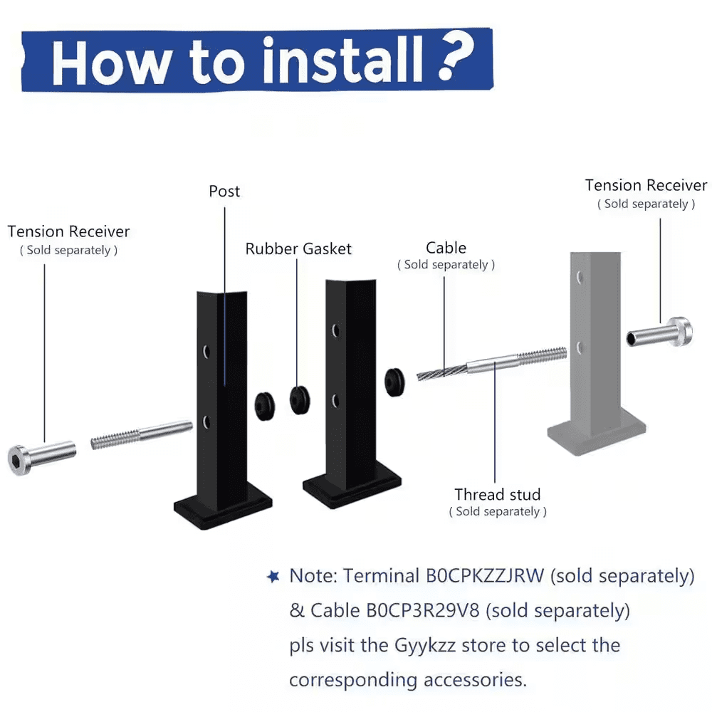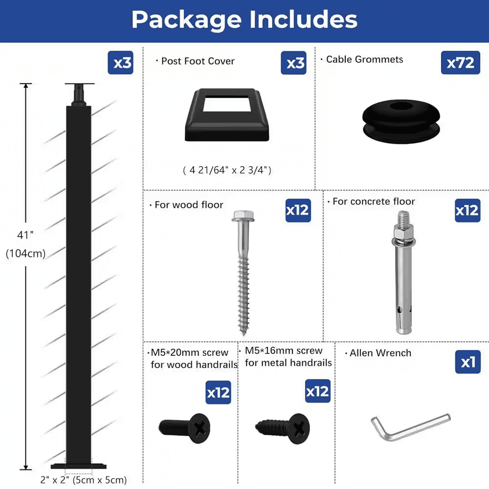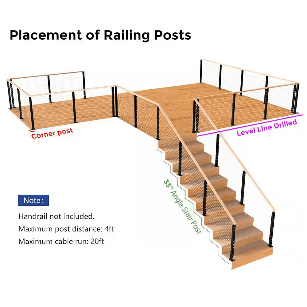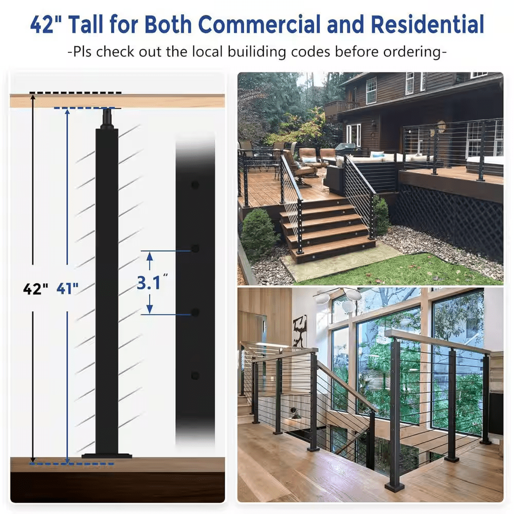 Upgrade your staircase with these 42 in. adjustable cable railing stair posts, designed to fit stair angles between 25-35 degrees for a secure and stylish installation.Made from durable stainless steel with a sleek black finish, these posts provide long-lasting strength and modern elegance for decks, stairs, and balconies.Pre-drilled for easy cable installation, each post includes cable grommets to prevent wear and ensure a clean, professional look.