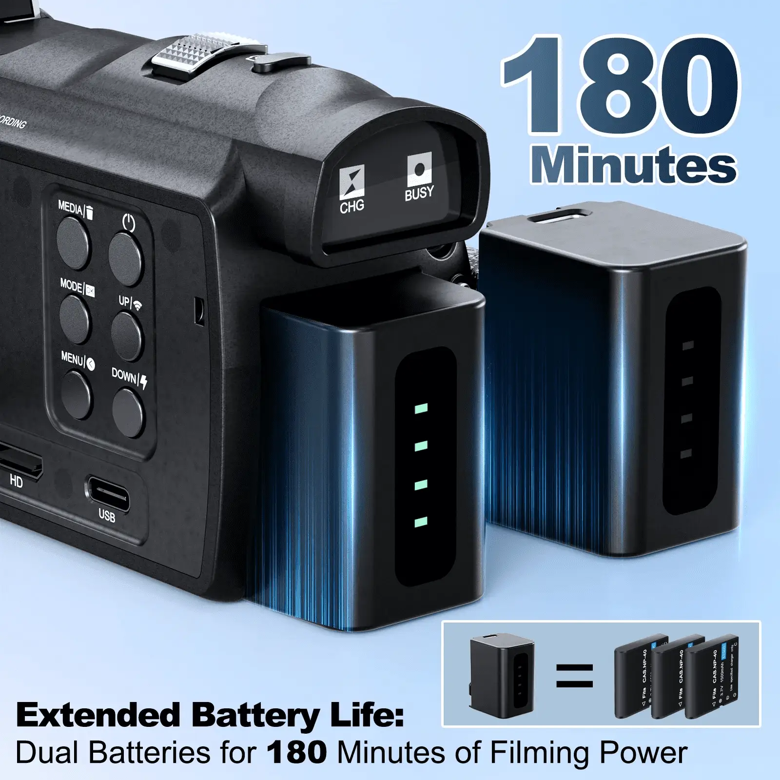 Multi-Functional Video Camera: NBD versatile camcorder offers features like anti-shake technology, pause and slow-motion functions, continuous shooting, time-lapse, HDMI output, and more. With two rechargeable batteries included, users can shoot continuously without power interruptions.