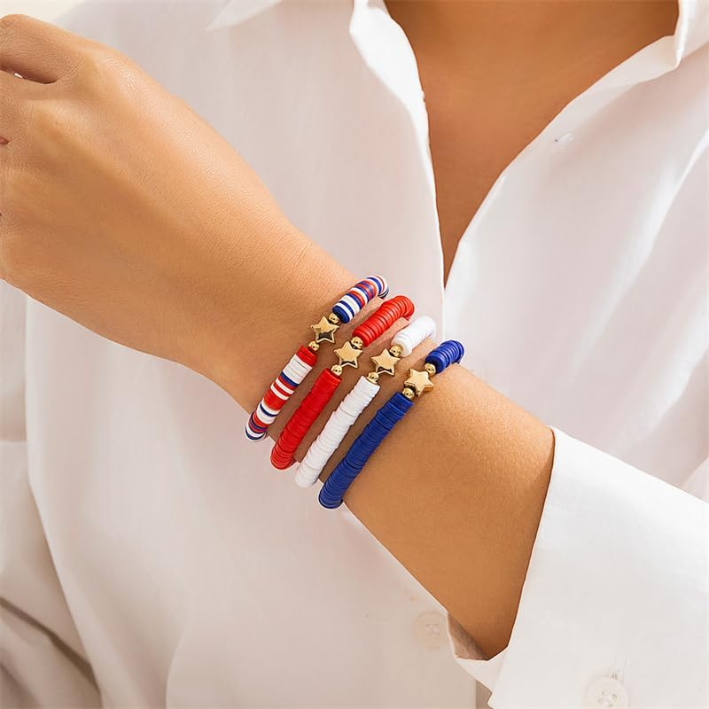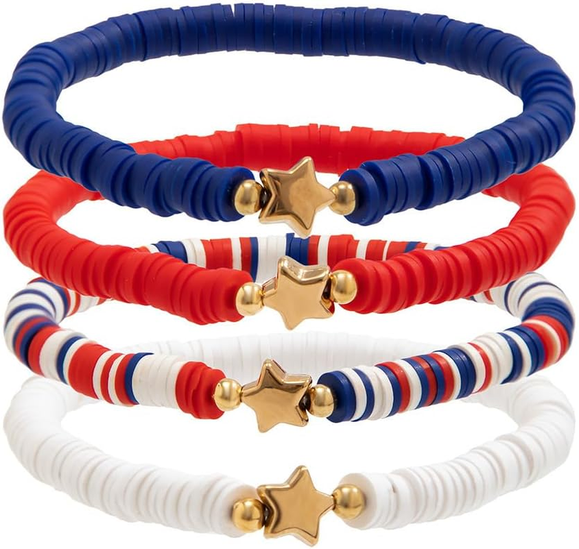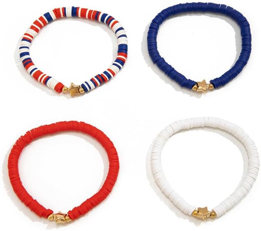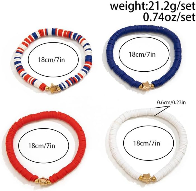 4Th of July Summer Beach Heishi Surfer Bracelets Set for Women America Patriotic Flag Clay Beaded Stretch Bracelet Red White Blue Star Stackable Charm Bangle Independence Day Gifts