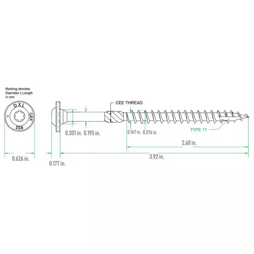 GRK RSS Rugged Structural Screw has a patented design and made of specially hardened steel to provide customers with high tensile, torque and shear strength. The sharp threads and points bite instantly into material, including hardwood, reducing the splitting effect due to smaller shanks. The GRK RSS series screws that are 3-1/8 in. and longer have 6 CEE threads which enlarge the screw hole for the non-threaded portion of the fastener, allowing the wood to settle easily and increases the screw’s drawing strength.