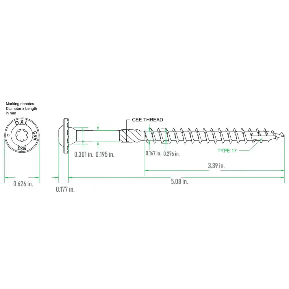 GRK RSS Rugged Structural Screw has a patented design and made of specially hardened steel to provide customers with high tensile, torque and shear strength. The sharp threads and points bite instantly into material, including hardwood, reducing the splitting effect due to smaller shanks. The GRK RSS series screws that are 3-1/8 in. and longer have 6 CEE threads which enlarge the screw hole for the non-threaded portion of the fastener, allowing the wood to settle easily and increases the screw’s drawing strength.