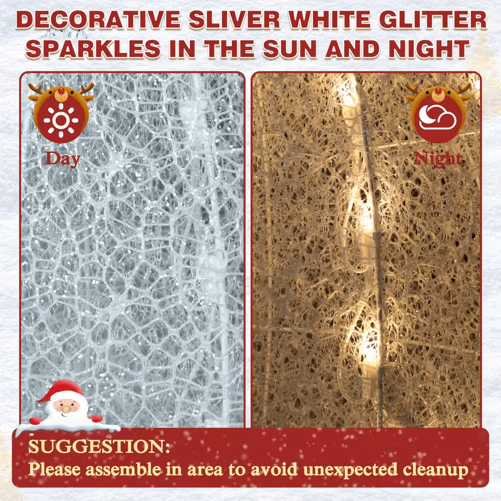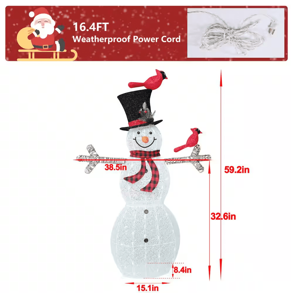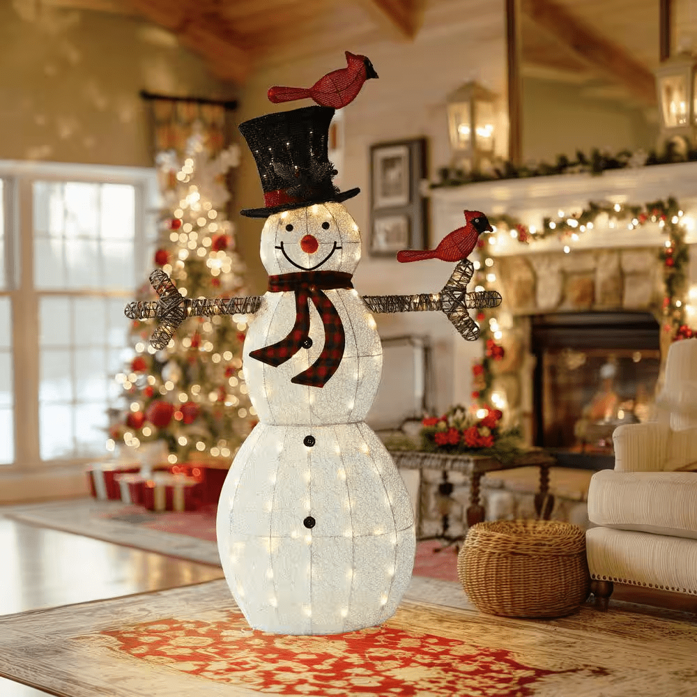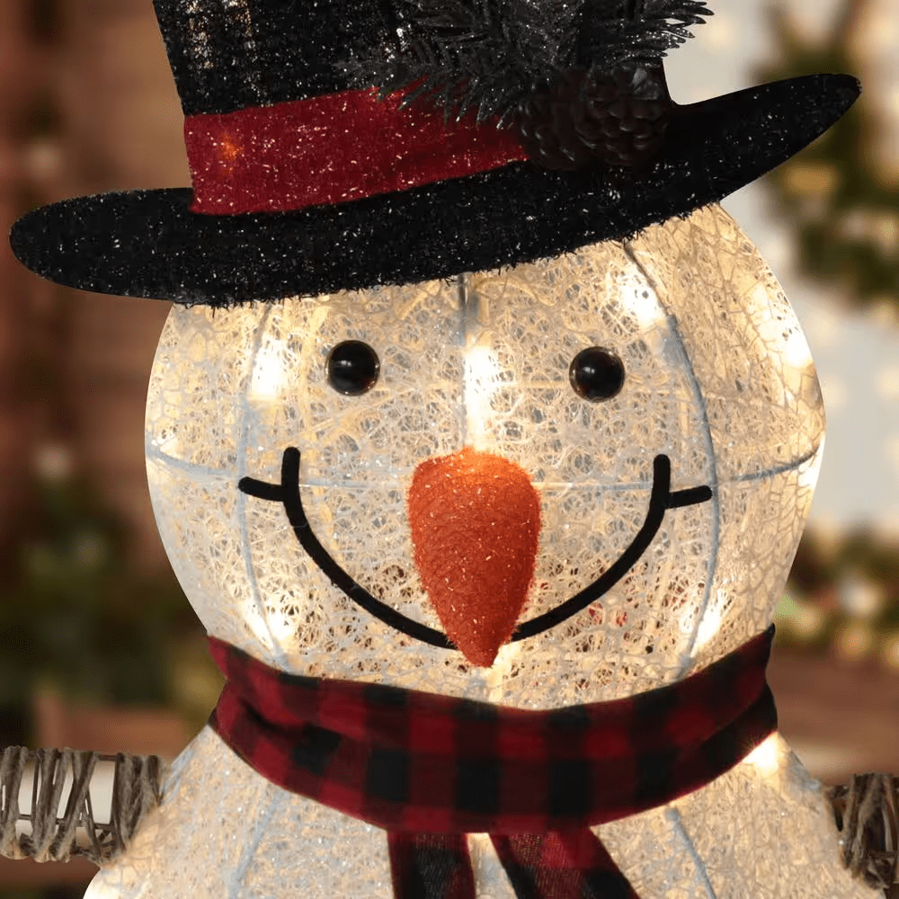 The 3D design snowman holiday yard decoration with 90 warm white LEDs is adorable and lifelike. The frame of the lighted snowman is metal, wrapped with double mesh fabric, which is weather-resistant and durable. The product is equipped with robust metal stakes and zip ties to make the Christmas snowman fully fasten and secure on the ground. Elaborate festive details like the red & black scarf, birds, and the hat are added to the lighted snowman, making it much prettier. Seeing such a charming lit-up snowman on a cold winter day, both you and passers-by will be warmed.