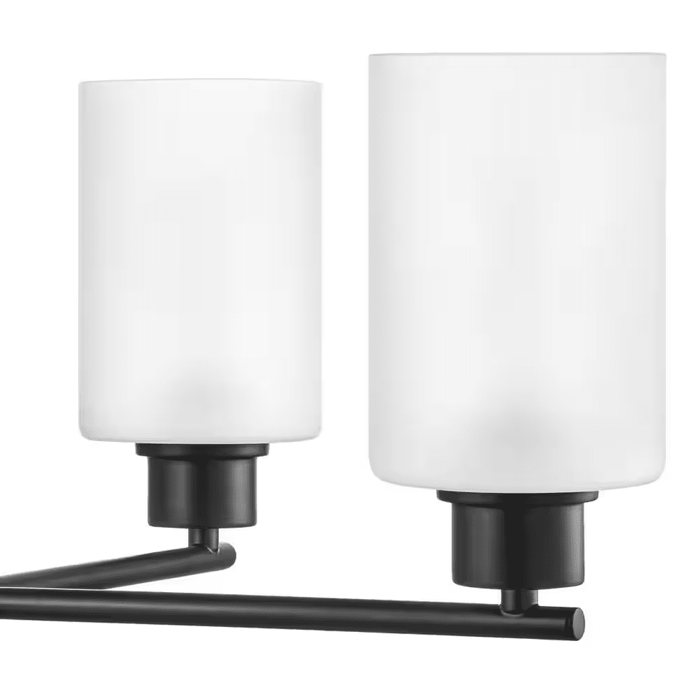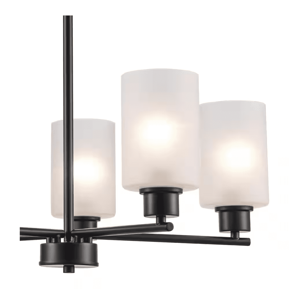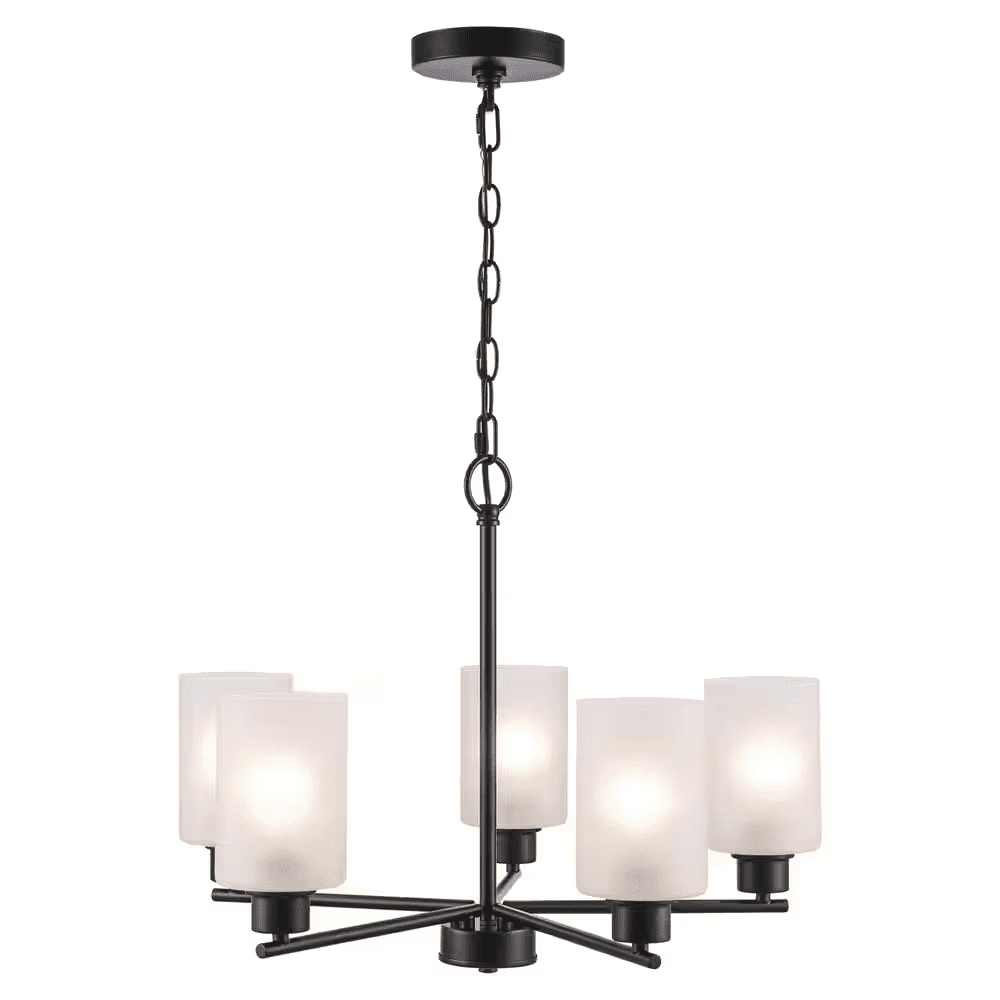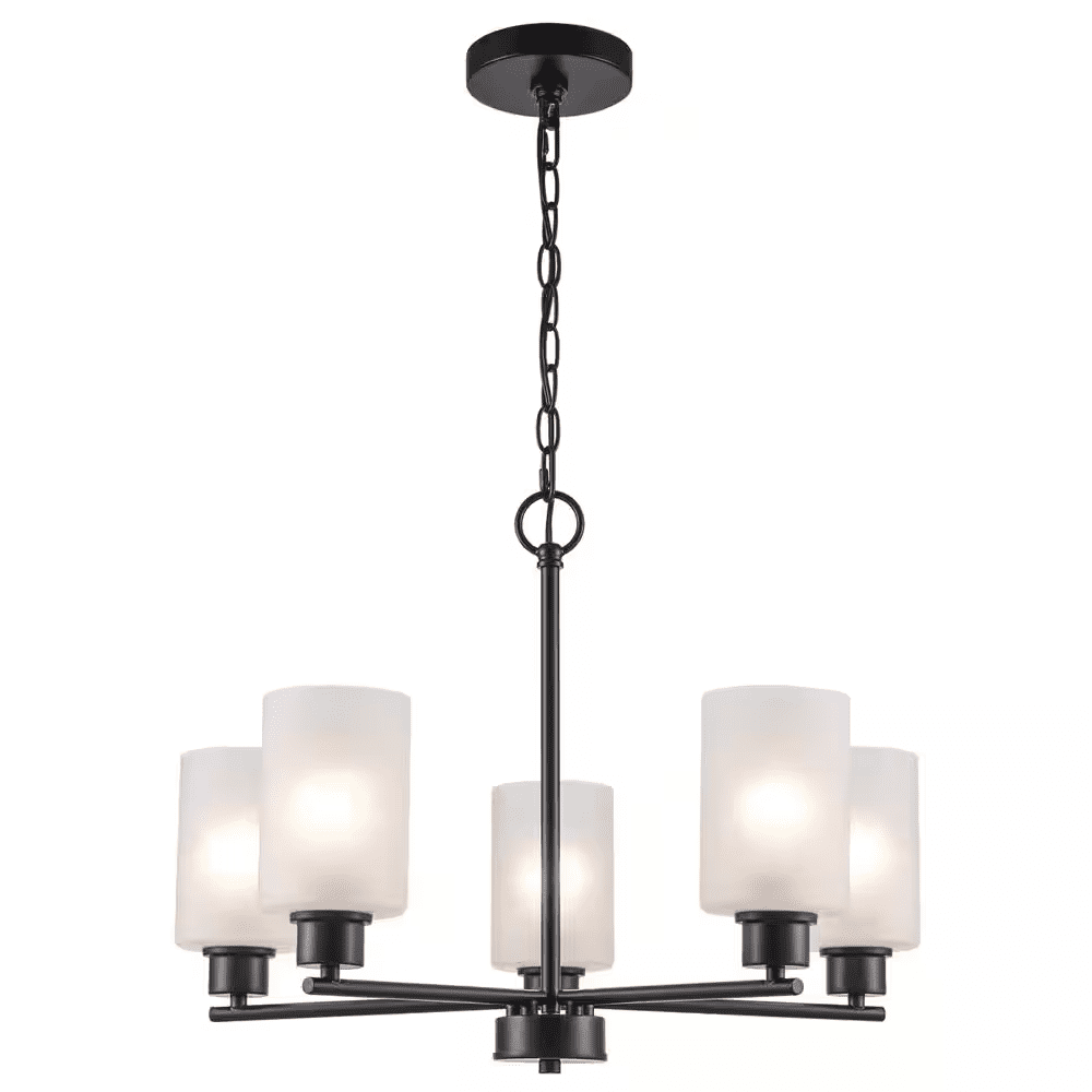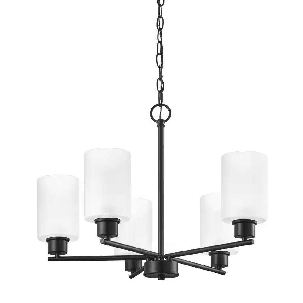 This black chandelier is a contemporary indoor light fixture, designed to suit a variety of home decor styles from transitional to modern farmhouse. The decorative hanging ceiling light will work well as a kitchen light fixture, dining room light, foyer chandelier and more. The light is constructed of black-finished metal and includes a circular ceiling plate and a traditional chandelier shape with 5 arms that extend from a central support rod and hold the glass shades in place. The white opal glass shades have a cylinder shape, house a single light bulb in each and are open at the top for easy access to change the bulbs. The chandelier body hangs from a matching black chain, allowing for an adjustable height and sloped ceiling compatibility.
