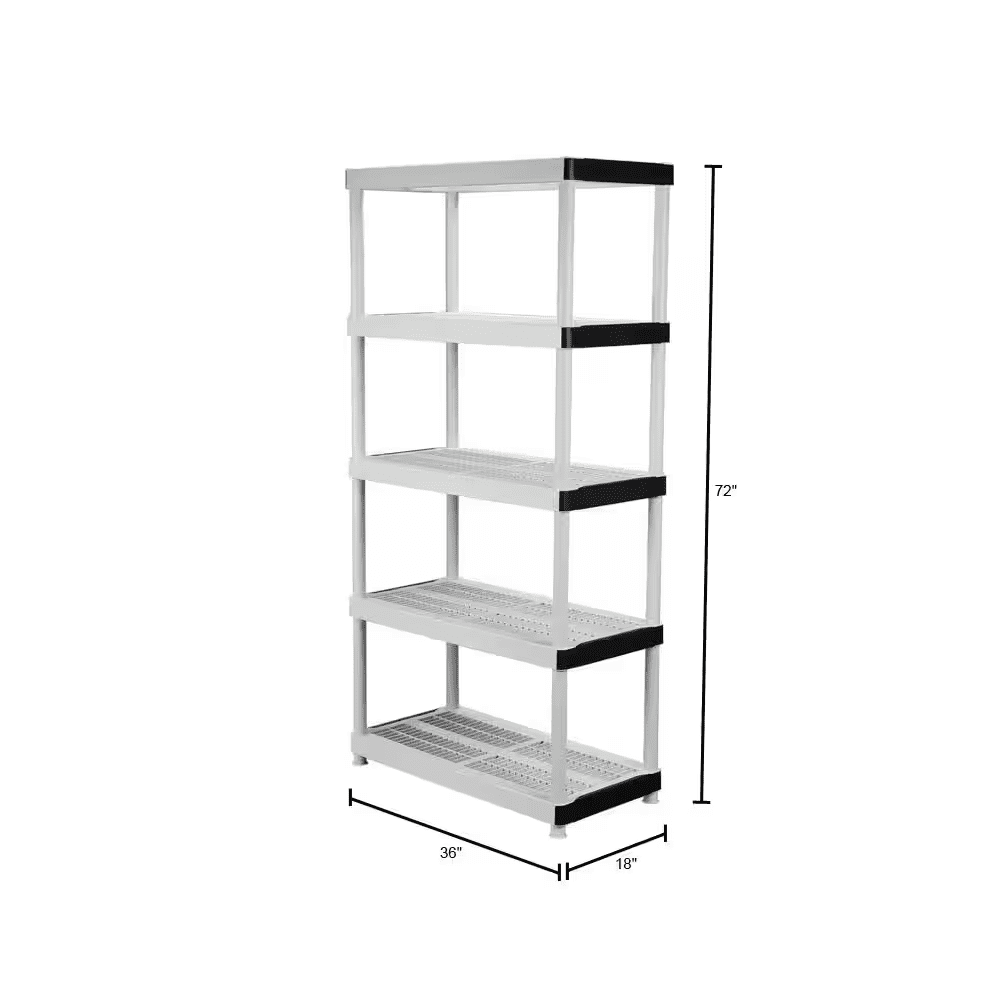 The HDX 5-tier shelving unit is 72 in. H x 36 in. W x 18 in. D. Use this multi-purpose storage organizer in your home, garage, basement or utility area to keep your space neat and manageable. HDX designed it to hold most storage tote sizes, providing you with options for every room.