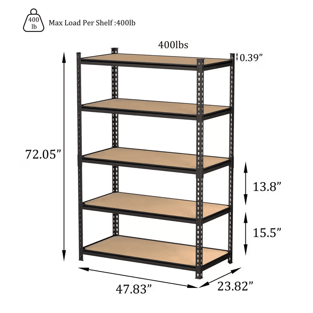 - Heavy duty garage shelving holds up to 400 lbs. per level
