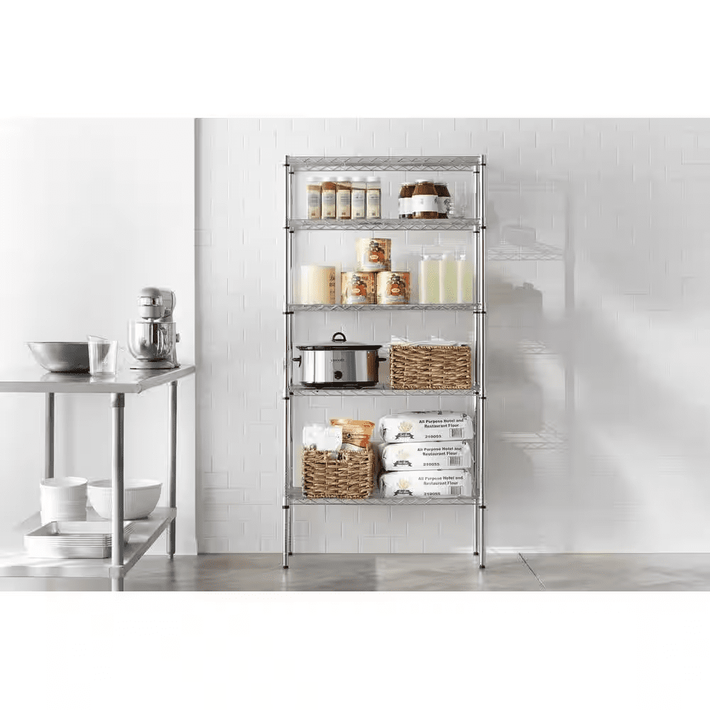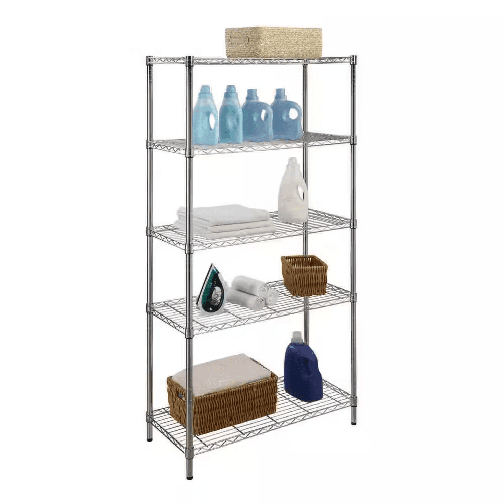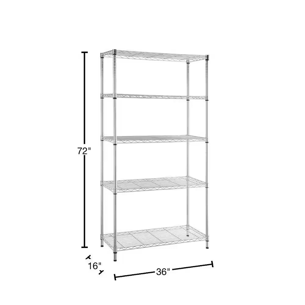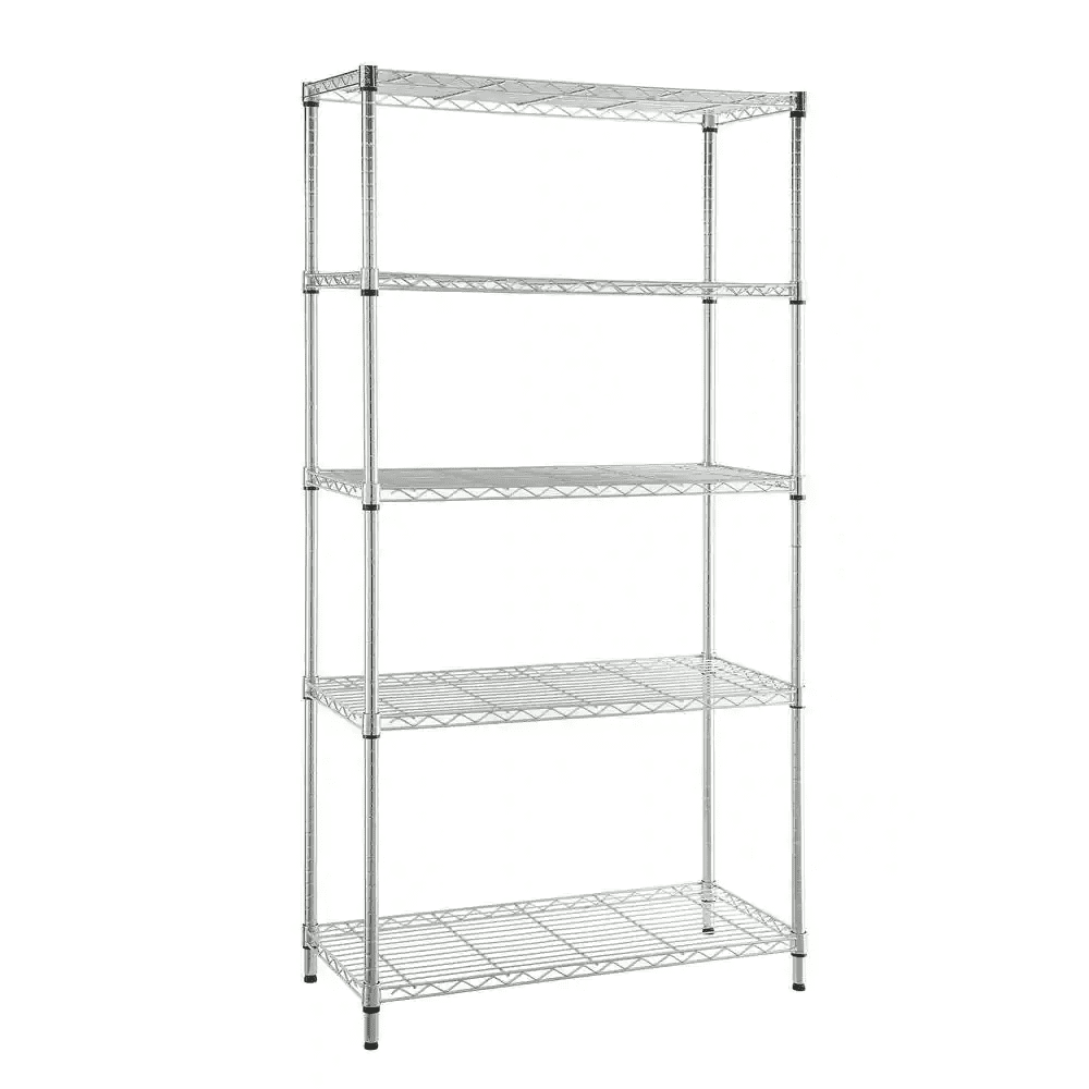 This easy-to-assemble 5-Shelf Decorative Wire Chrome Finish Shelving Unit for any room and purpose. The 5-tier shelving unit is made of tubular steel and wires coated with a durable chrome finish. All shelf heights are easily adjustable and the unit can be assembled without any tools.