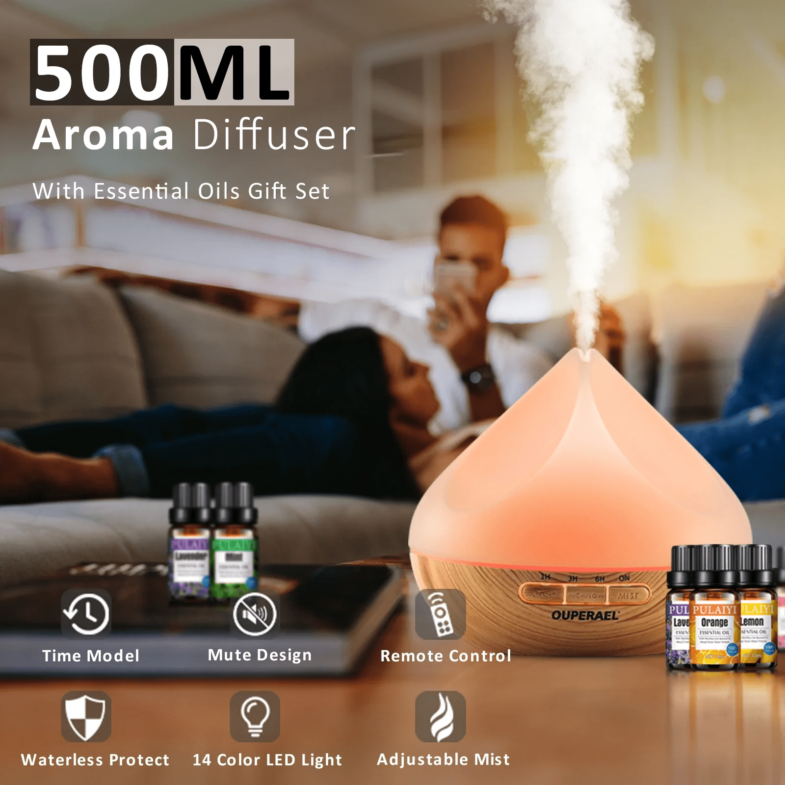 - Applicable Occasions & Gifts: Our essential oil diffuser is equipped with a 500ml large-capacity water tank, which is perfectly suitable for large rooms, bedrooms, etc., and the bottle mouth design is large and easy to clean. The aroma diffuser is made of high-quality PP material, with a wood grain base, elegant and rich in connotation. Our aromatherapy oil diffuser is a beautiful gift for family, friends, colleagues, or lovers.