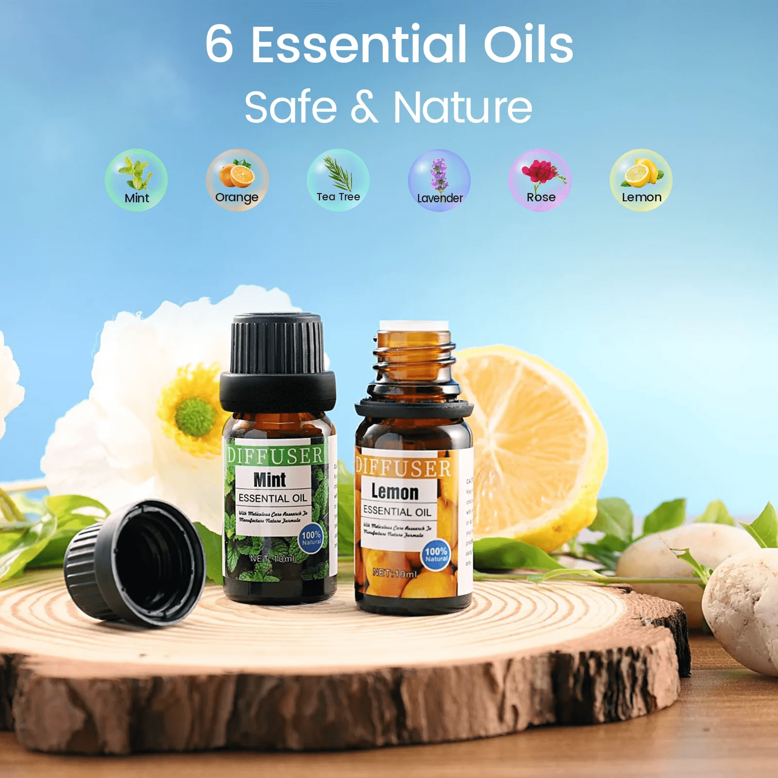 - 6 Essential Oils & Aromatherapy: Our diffuser kit contains 6 bottles of 100% natural pure organic essential oils, including lemon, lavender, mint, rose, orange, and tea tree. With the help of the essential oil diffuser’s advanced ultrasonic technology, the fragrance of the essential oil can be better volatilized to relieve your anxiety and stress.
