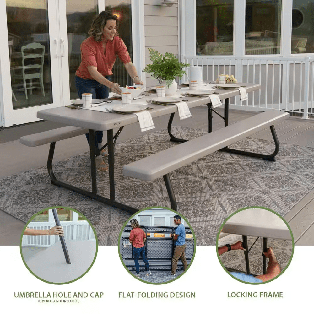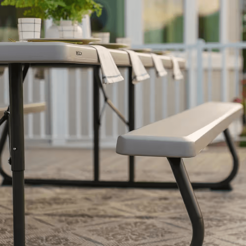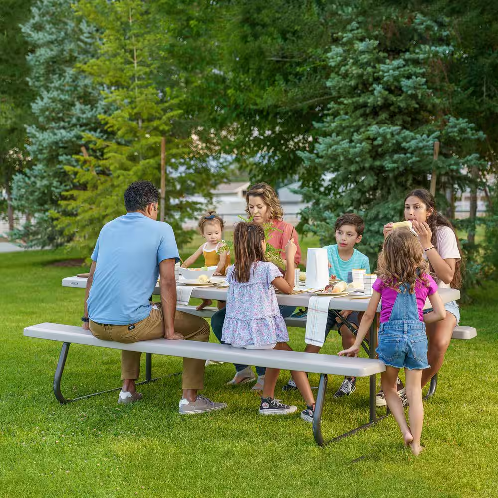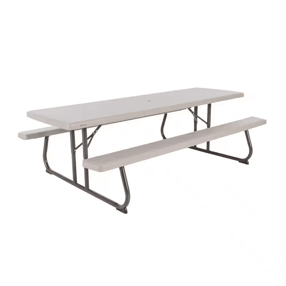 The Lifetime 8 ft. Commercial Grade Picnic Table gives you that perfect extra outdoor eating space you’ve always wanted. Constructed of UV-protected, high-density polyethylene and powder-coated steel, Lifetime’s picnic tables are weather and rust resistant and will not fade, crack, chip or peel. Stronger and more durable than wood, they are low maintenance, stain resistant and easy to clean. Best of all, Lifetime picnic tables fold completely flat for convenient, space-saving storage.