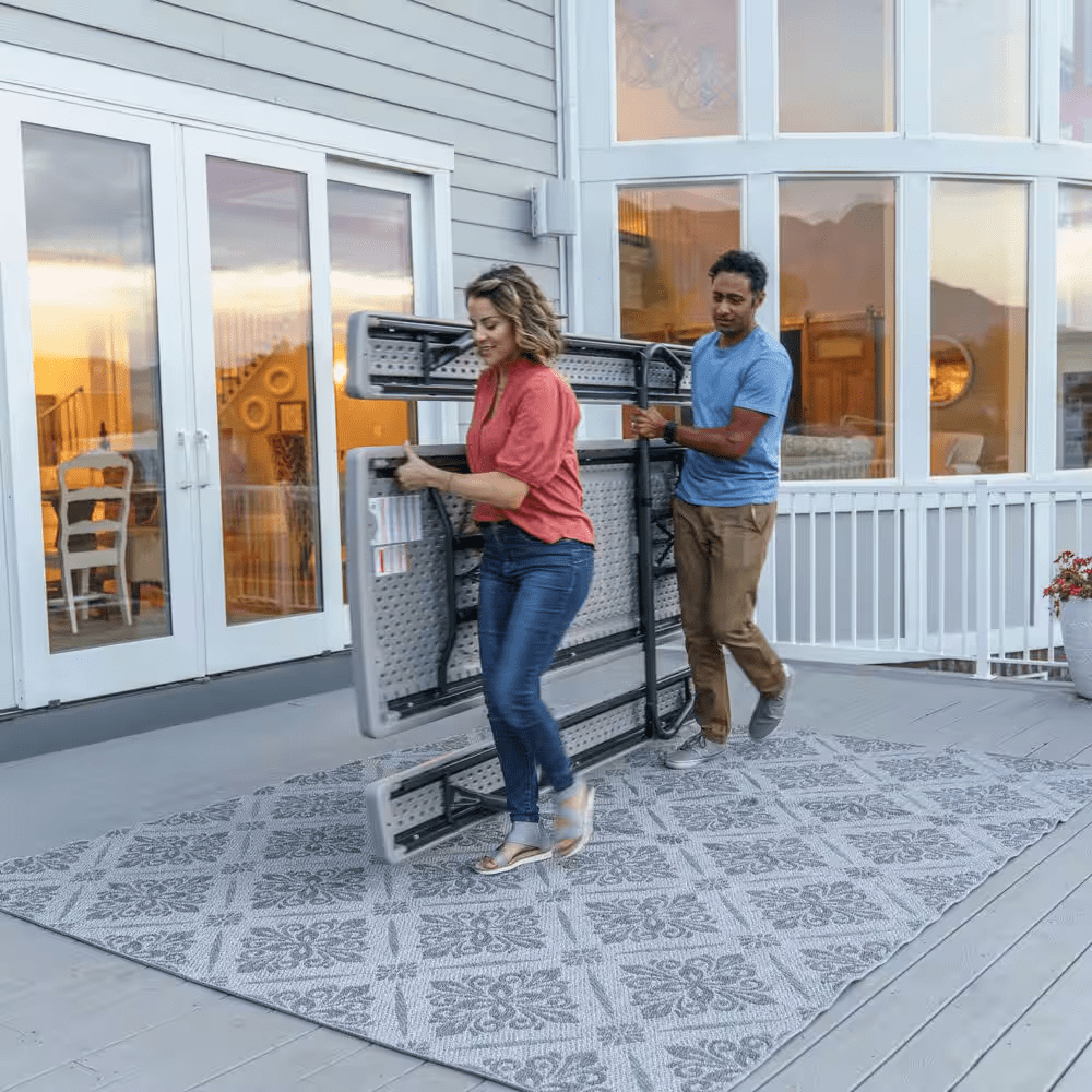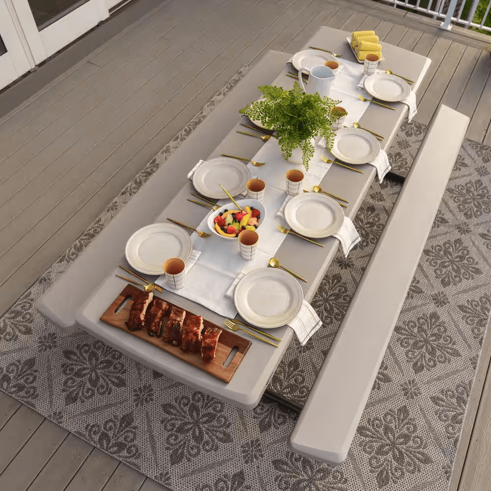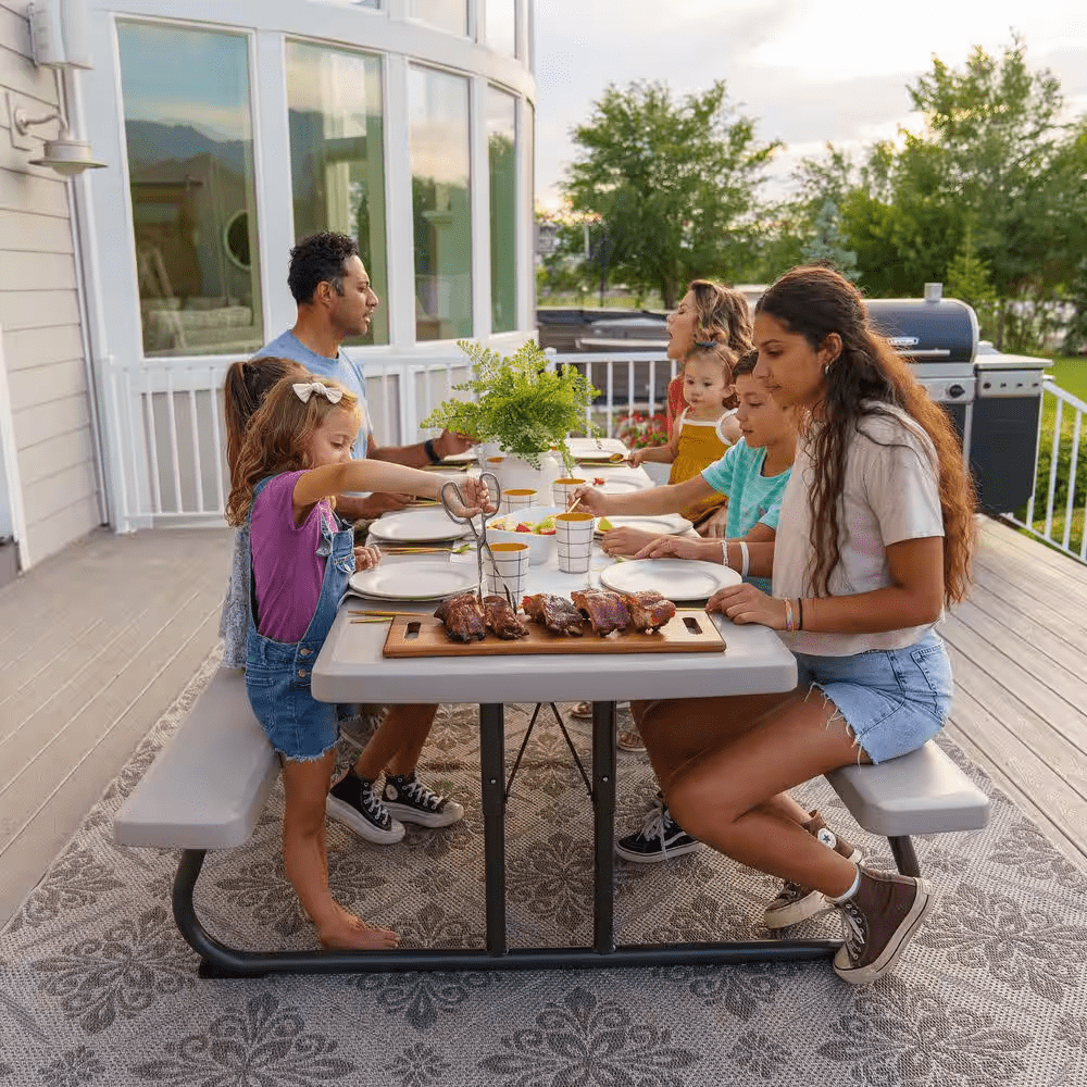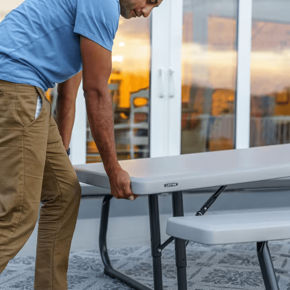 The Lifetime 8 ft. Commercial Grade Picnic Table gives you that perfect extra outdoor eating space you’ve always wanted. Constructed of UV-protected, high-density polyethylene and powder-coated steel, Lifetime’s picnic tables are weather and rust resistant and will not fade, crack, chip or peel. Stronger and more durable than wood, they are low maintenance, stain resistant and easy to clean. Best of all, Lifetime picnic tables fold completely flat for convenient, space-saving storage.