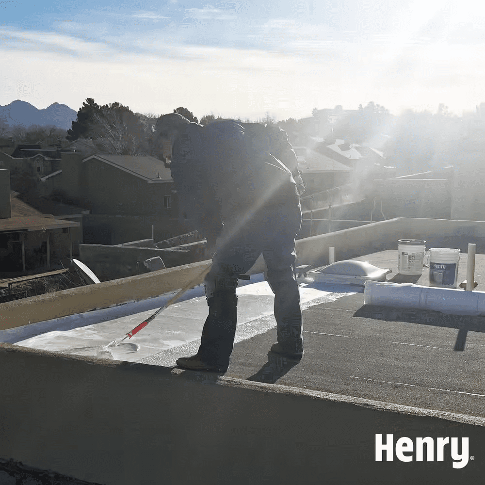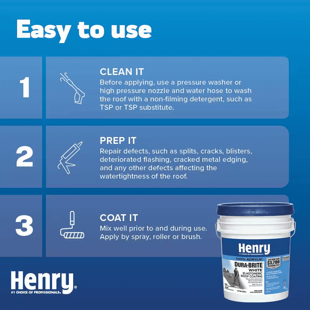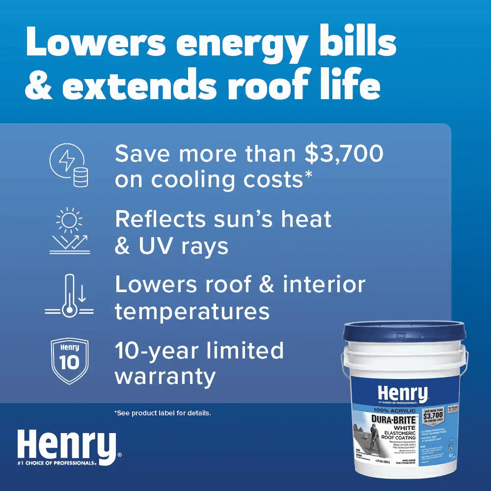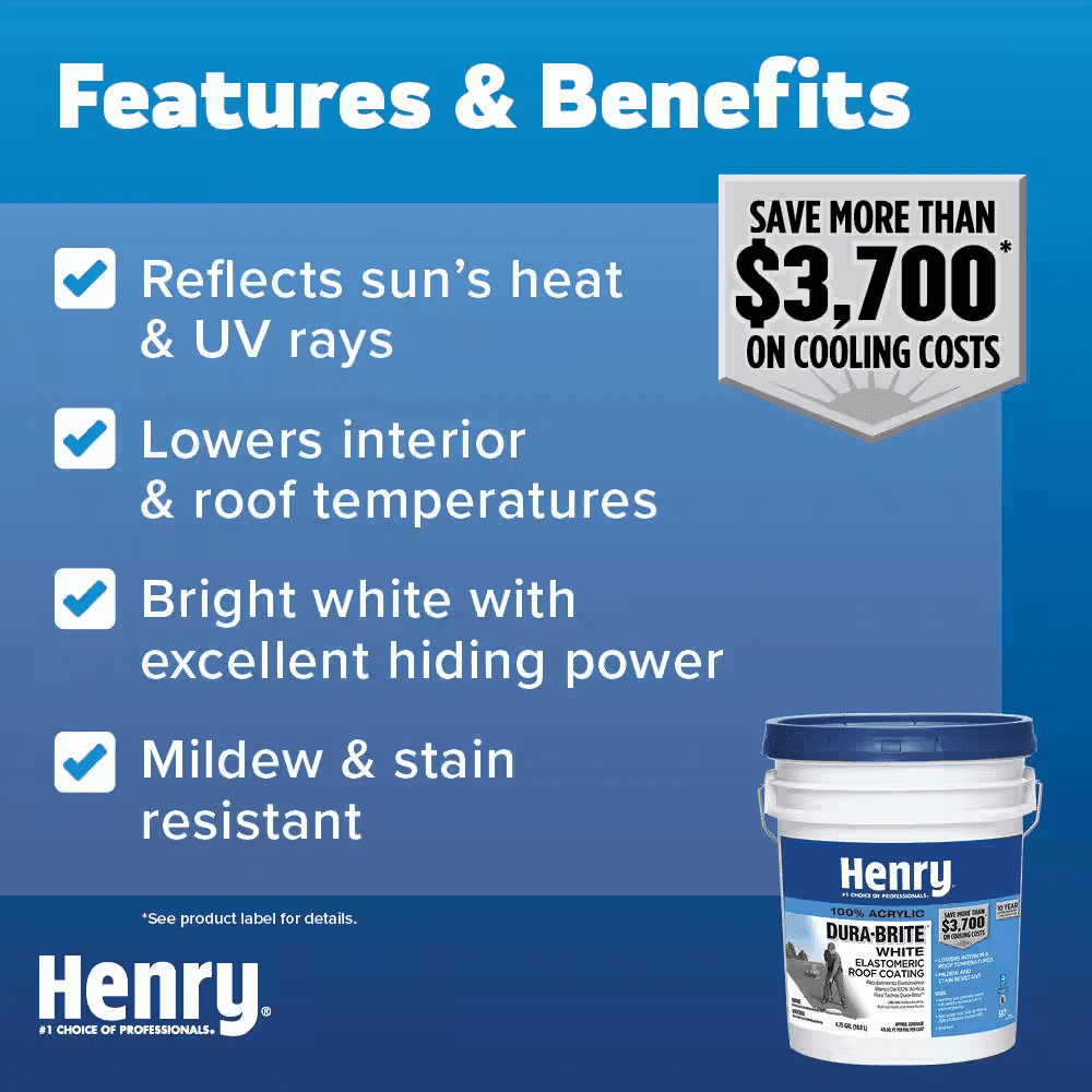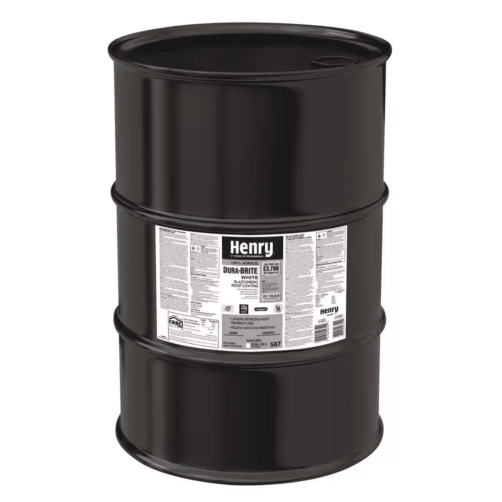 Henry 587 100% Acrylic Dura-Brite White Elastomeric Roof Coating is a premium, high solids, reflective roof coating. Its elongation, peel strength and solar reflectance values offer weather protection, high solar reflectivity and superior longevity when compared to economy grade reflective roof coatings. When cured, it allows moisture vapor to vent or breathe out of underlying substrate.