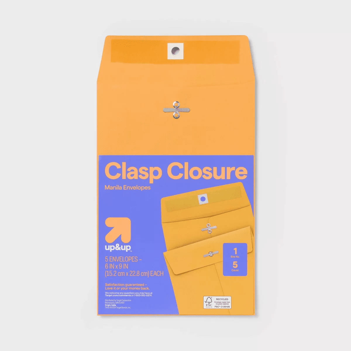 Keep small documents, cash, receipts, and other items safe and secure with these 5-Count Clasp Closure Manila Envelopes from up&up™. The envelopes have a 6-inch x 9-inch inner space for enclosing small sheets of paper without bending or folding, while the clasp closure keeps the contents secure without risk of accidental opening. Whether you need to mail a document or want to keep cash or small papers together, these clasp closure manila envelopes make staying organized easier.