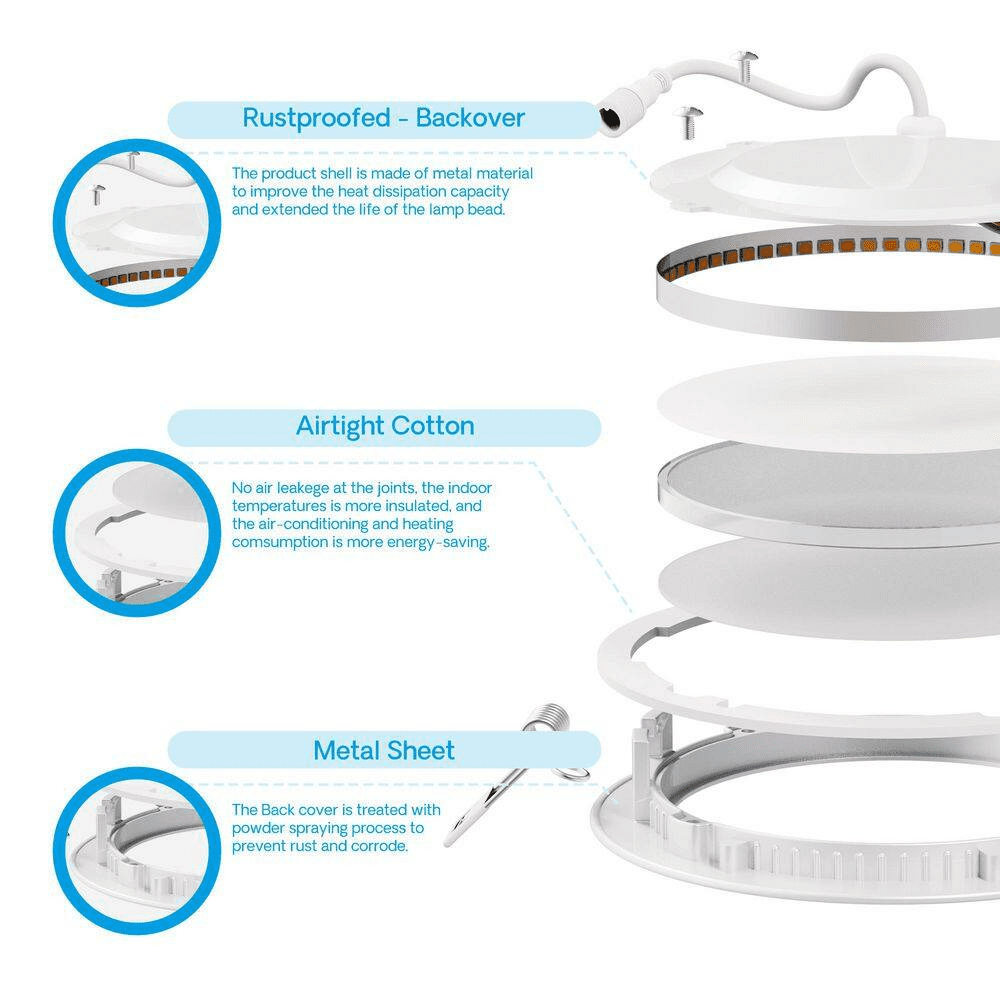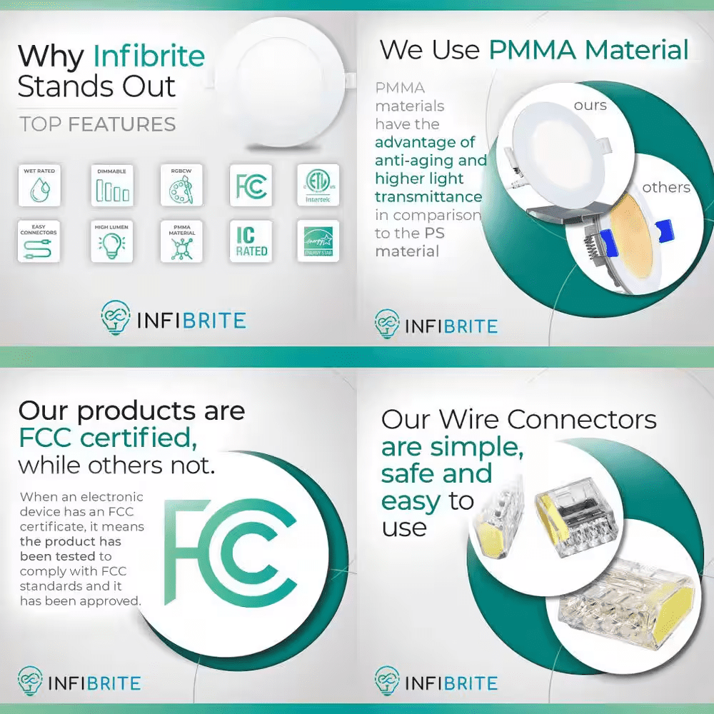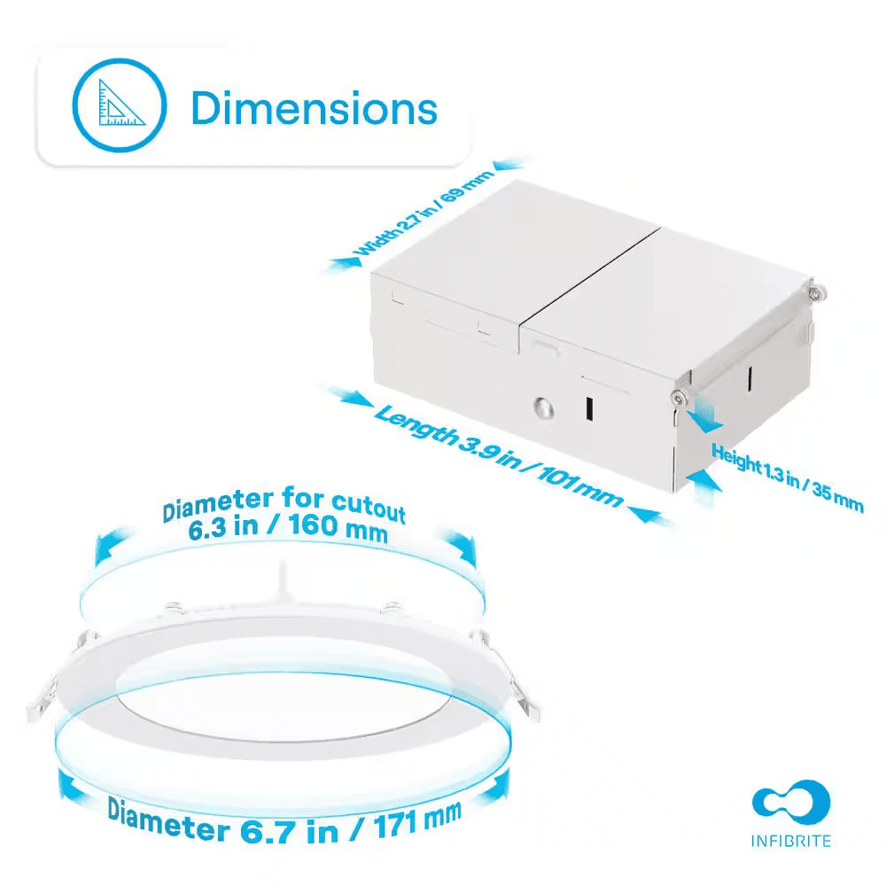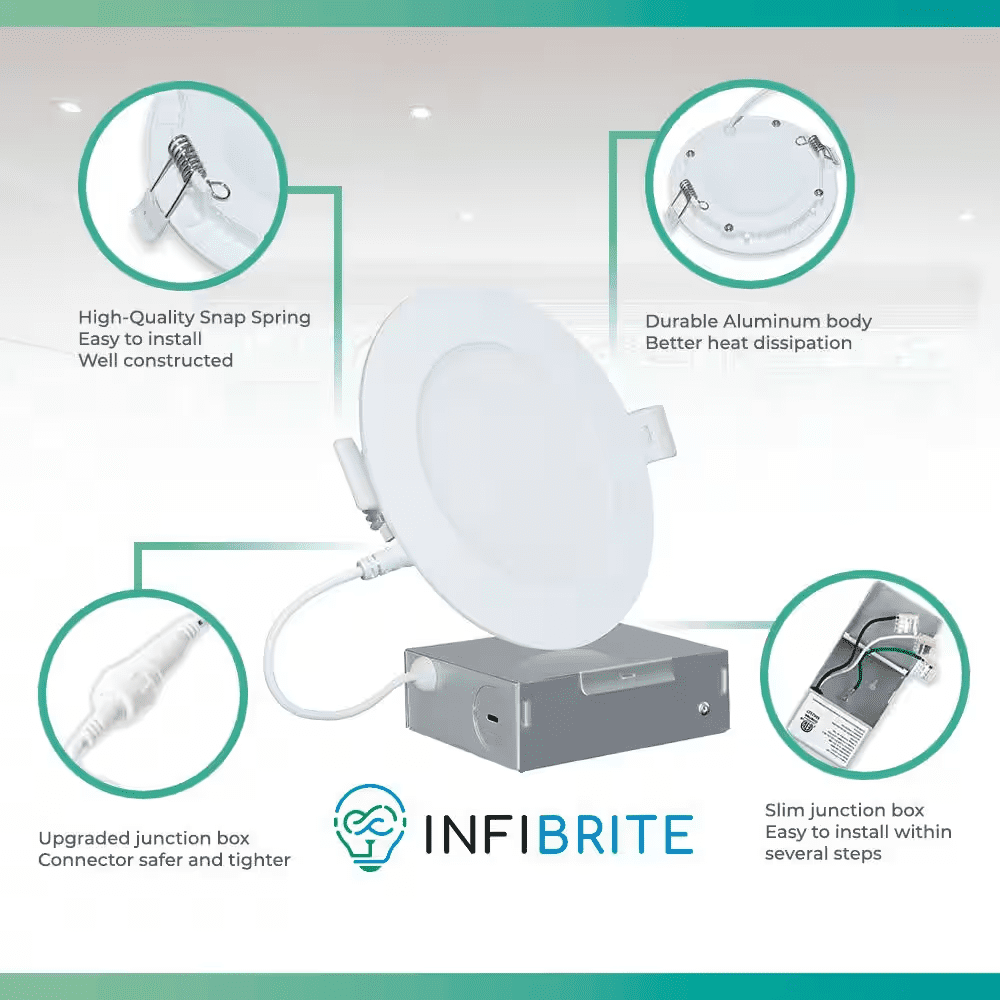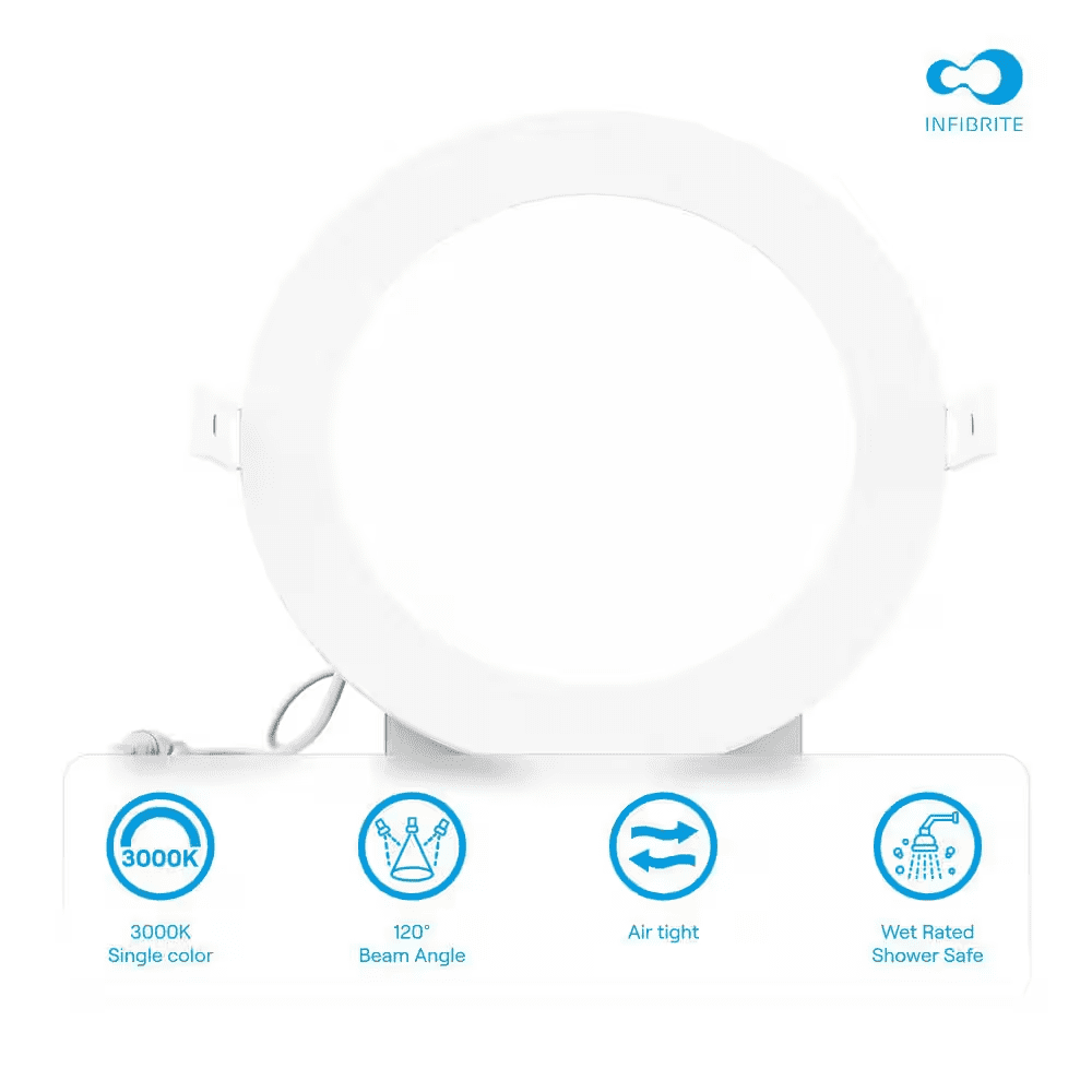 The InfiBrite Ultra-Slim Recessed Lighting Kits are the recessed lights you are looking for. Whether moving into a new space, remodeling or simply updating lights, proper lighting plays a huge role in elevating the appearance of your room. At InfiBrite, we make choosing the perfect light easy with our LED lights, each fixture is designed specifically for tight spaces where height clearance is limited such as below beams or ductwork. Our lights are available in 2700K (Soft White), 3000K (Warm White), 4000K (Cool White), 5000K (Daylight White) and 6000K (Clear White), find the perfect color to match any room. 2700K or 3000K is perfect for a relaxing soft color, 3500K or 4000K is the ideal choice for everyday tasks and 5000K is great for a hallway, work area or to simply keep a room brightly lit. ENERGY STAR certified and IC rated for direct contact with insulation, these lights won’t overheat, have a compact junction box and will last for-years to come, 50000-hours or approximately 34-years if used for 4-hours per day to be exact. Wet rated and certified airtight, Our lights are perfect for your bathroom, drop ceilings, outdoor soffits and all general lighting applications.