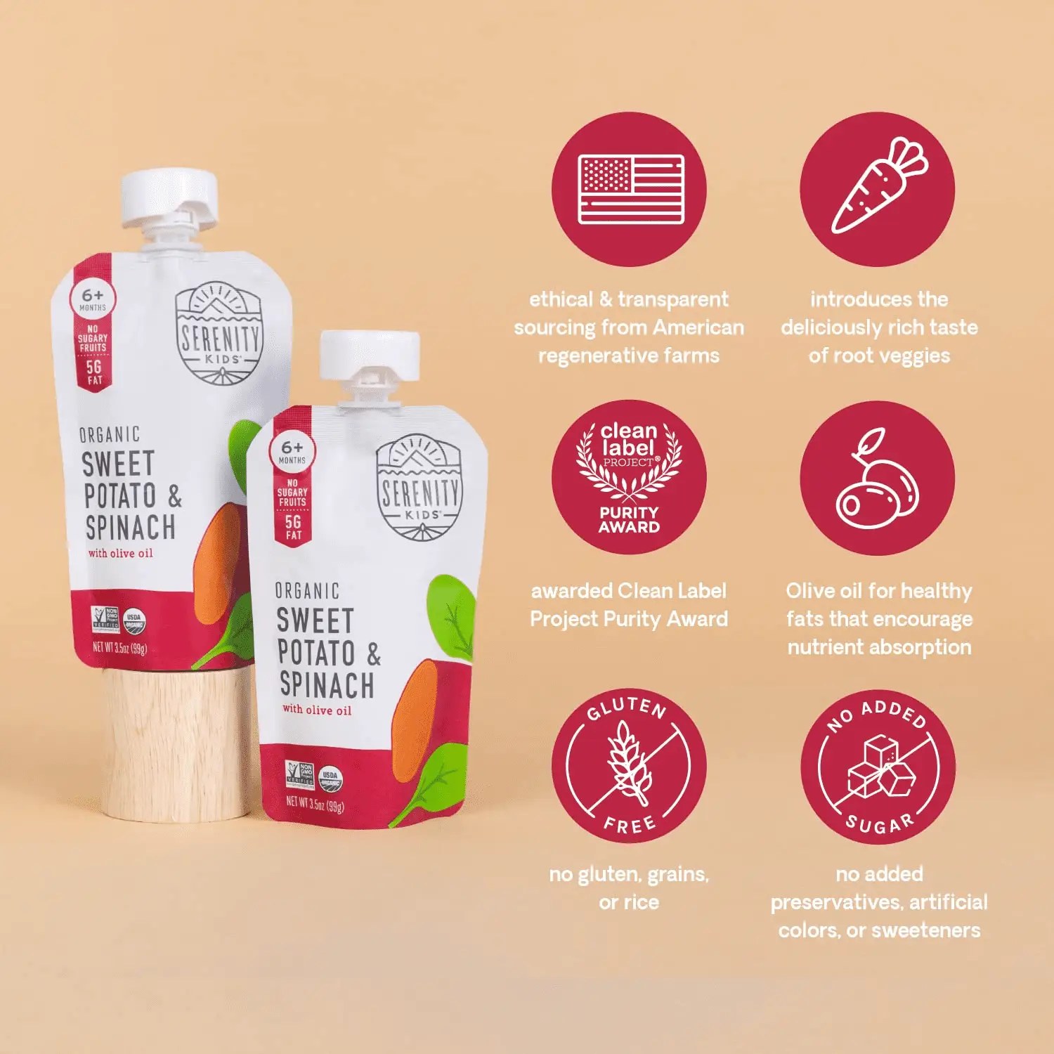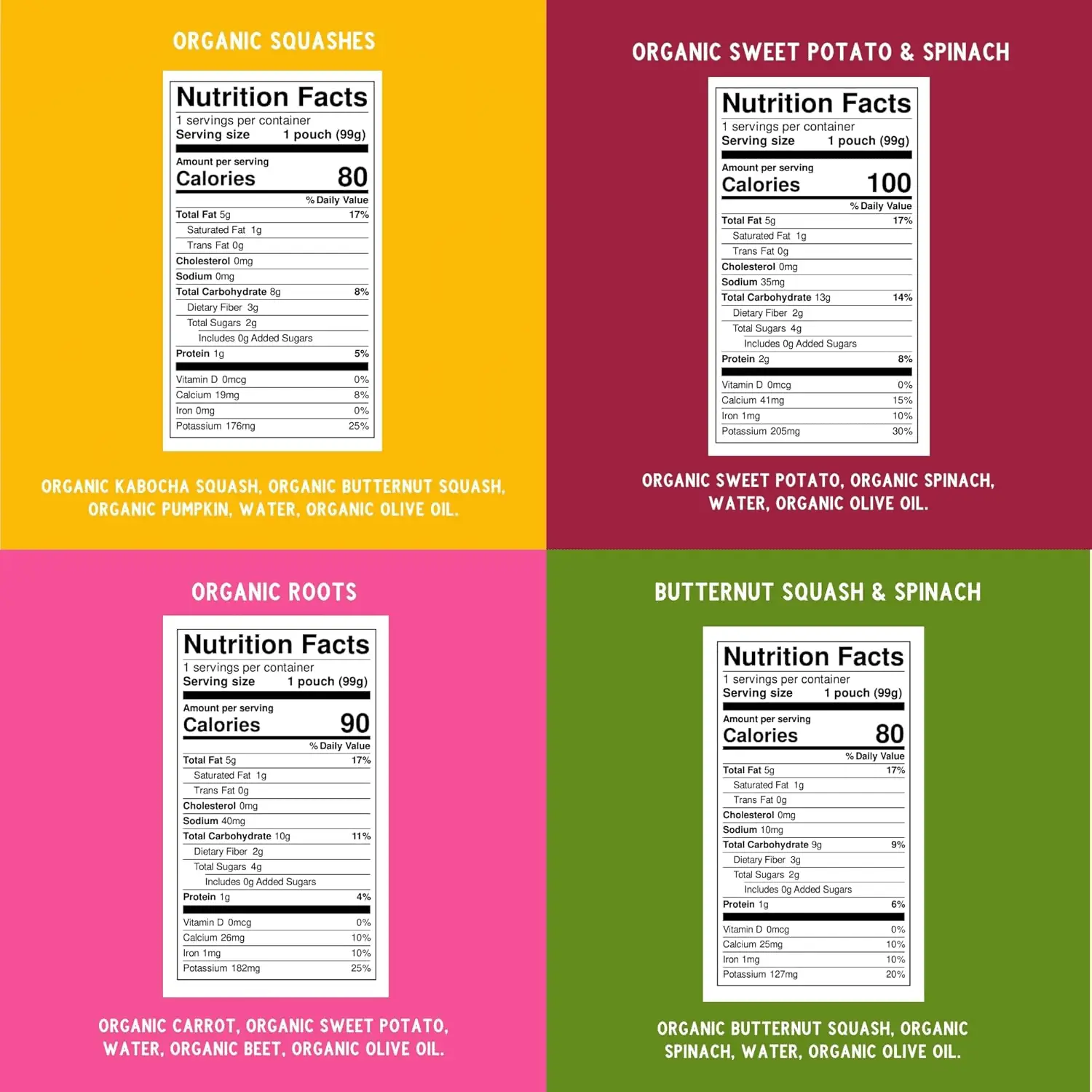 - SAVORY VEGGIES GOODNESS: Get 8 Serenity Kids certified organic veggie baby food pouches, packing a spicy punch with 2 each of squashes, roots, sweet potatoes, and butternut squash. The Serenity kids baby food is perfect for parents seeking top-notch organic baby food pouch options