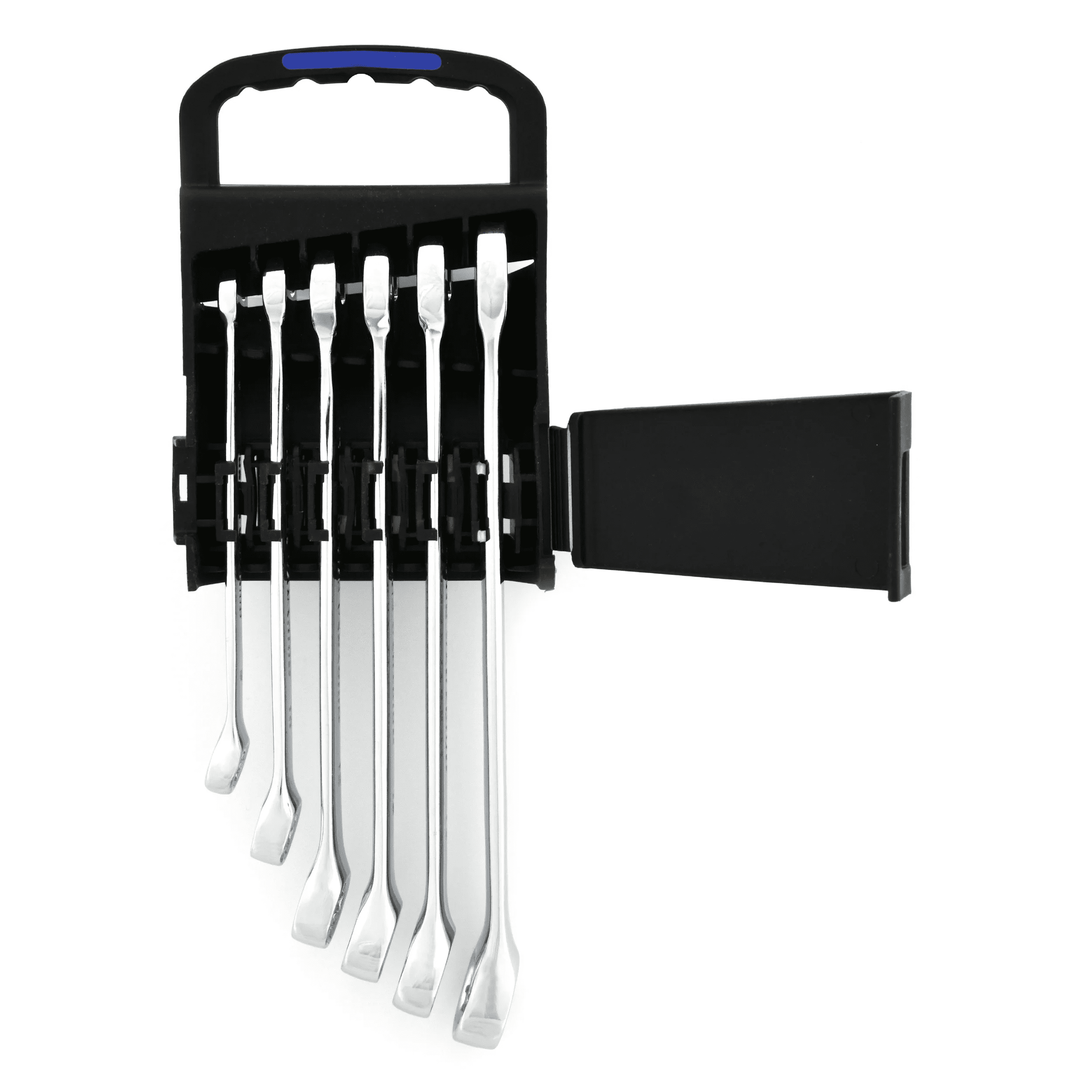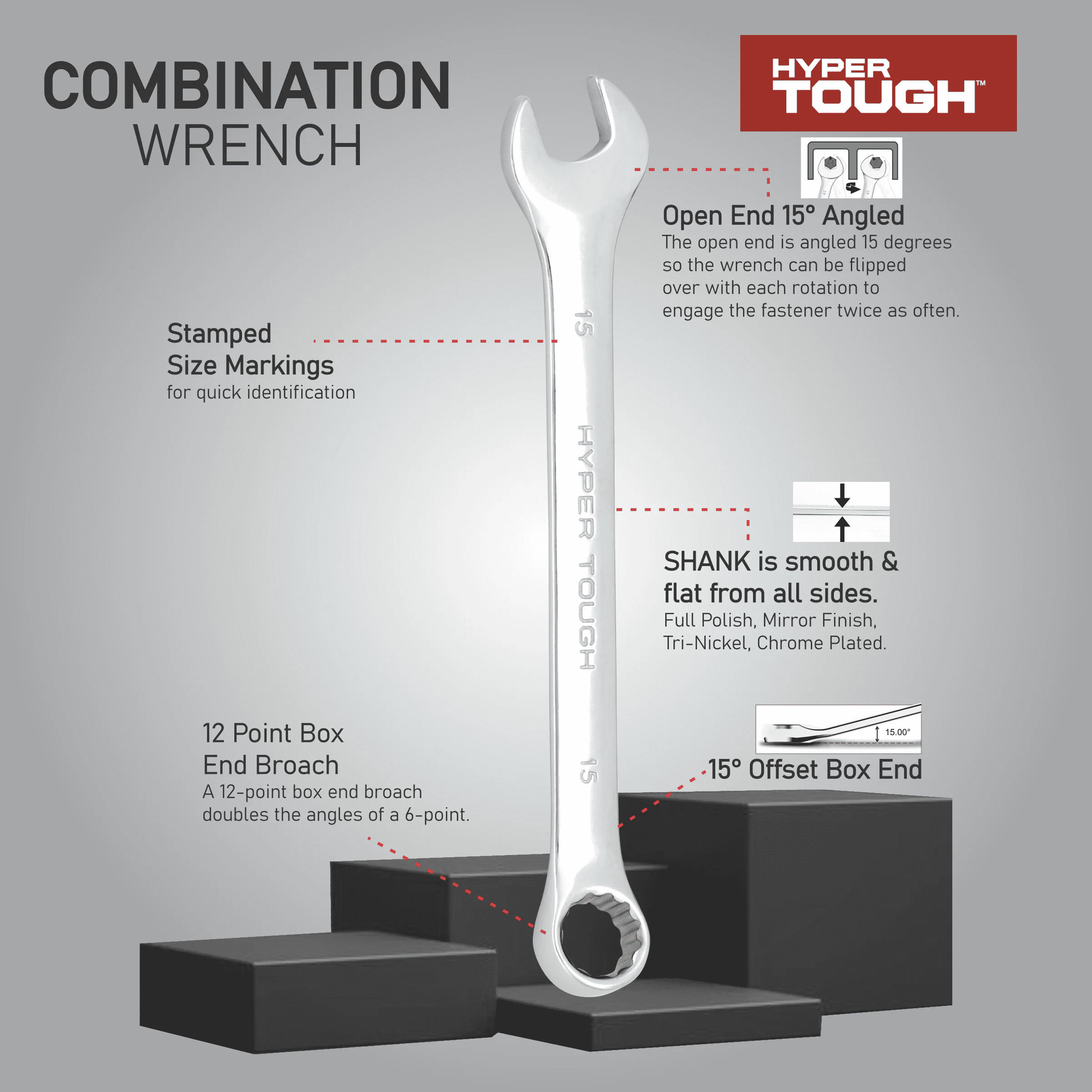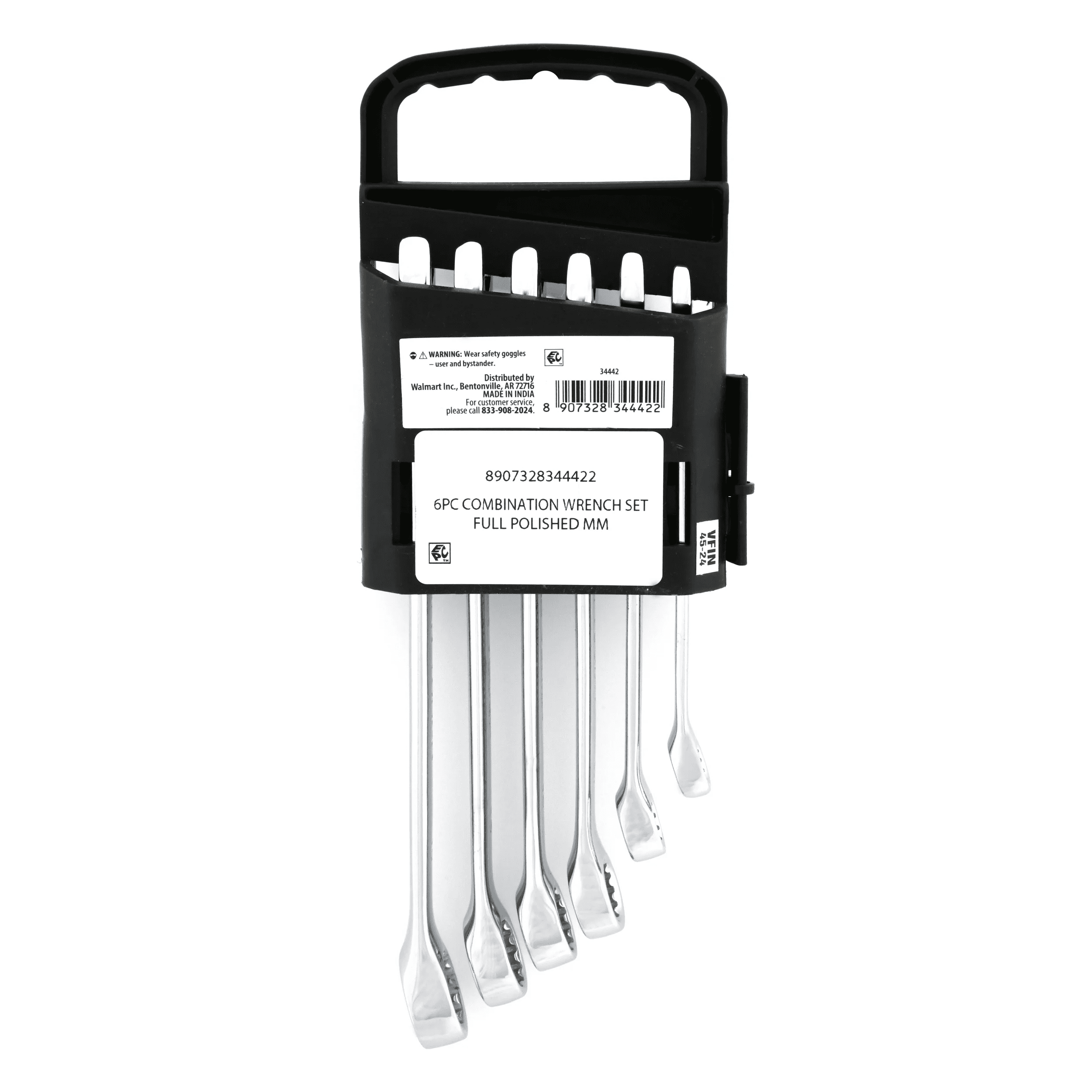 Hyper Tough 6 piece Metric Combination Wrench Set comes in handy for small automotive work, home repairs and other jobs. Each wrench is made of Chrome Vanadium Steel (CRV) with mirror polish finish and is nickel chrome plated for durability. It’s simple to work with for your convenience. The slim size makes the wrenches easy to handle for confident work. They come inside a conveniently portable carrying case with an attached handle. Sizes are etched on, making reading and identification easier, and all pieces meet ANSI/ASME standard of safety and quality.
