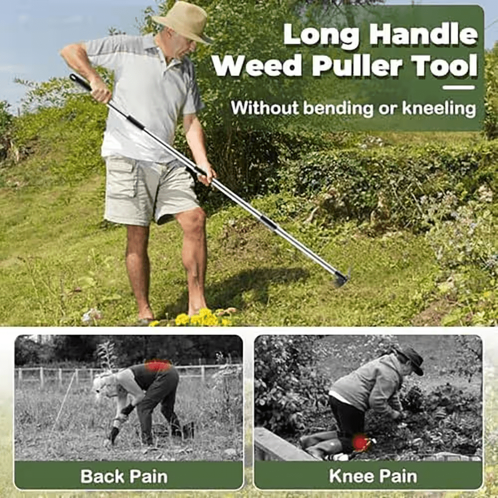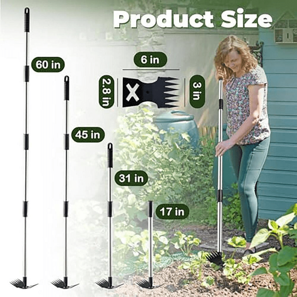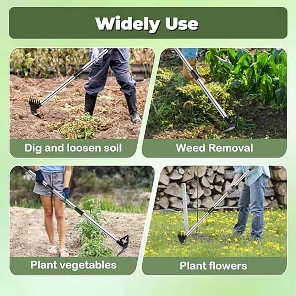 Make gardening easier with this 2-in-1 manual weed puller and hoe, designed with an adjustable long handle so you can work comfortably without bending or kneeling. Featuring a heavy-duty cast steel head with 6-sharp tines and a solid blade, it quickly uproots stubborn weeds and levels soil with ease. Perfect for gardens, lawns, patios, and farms, this versatile tool delivers durability and effortless installation for all your yard care needs.