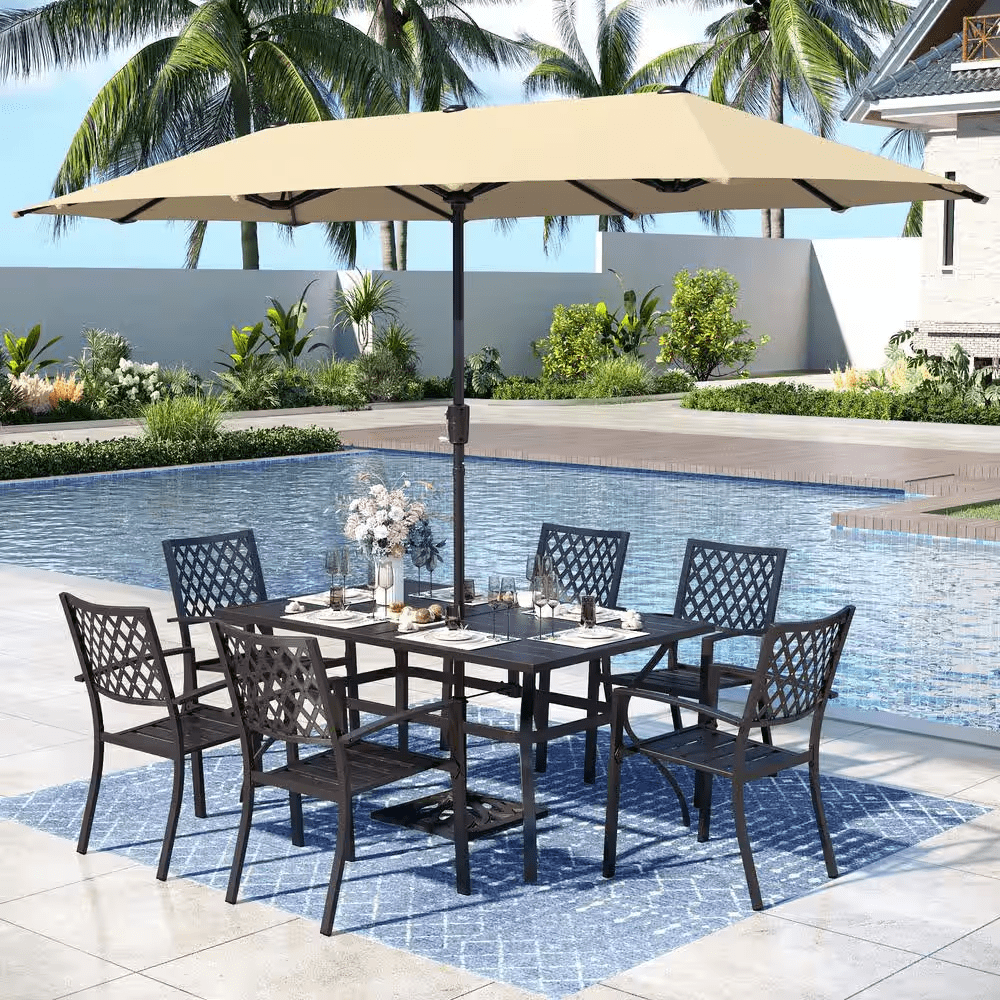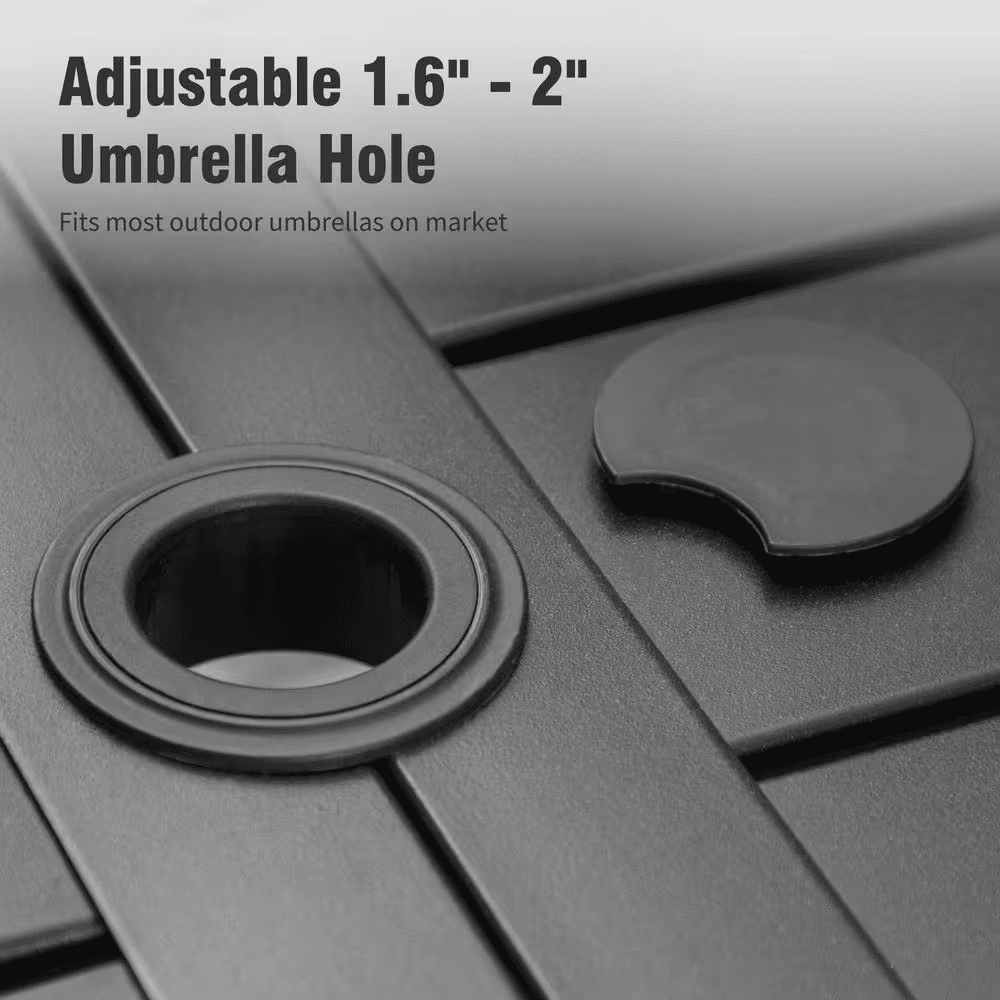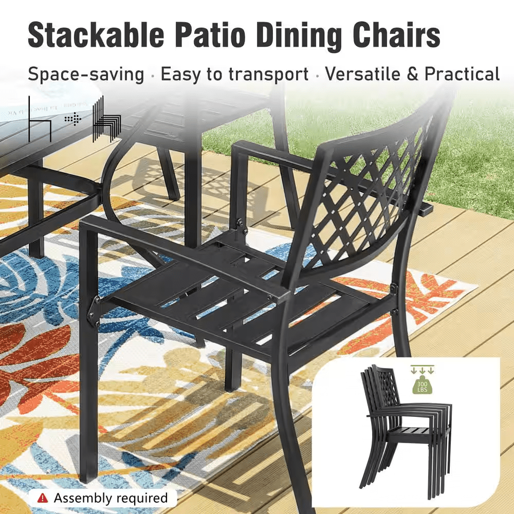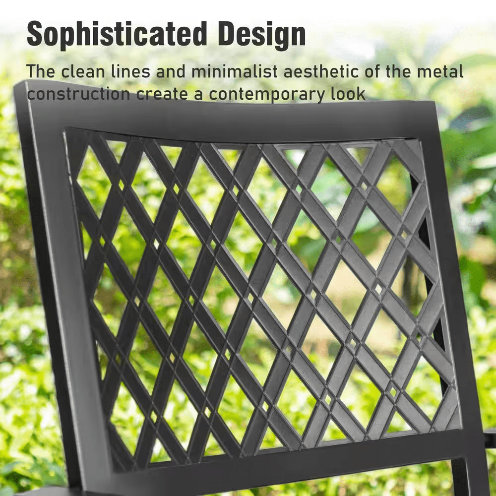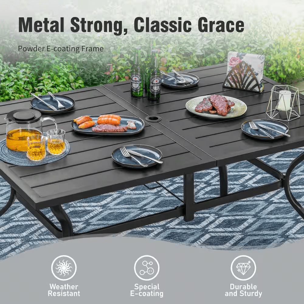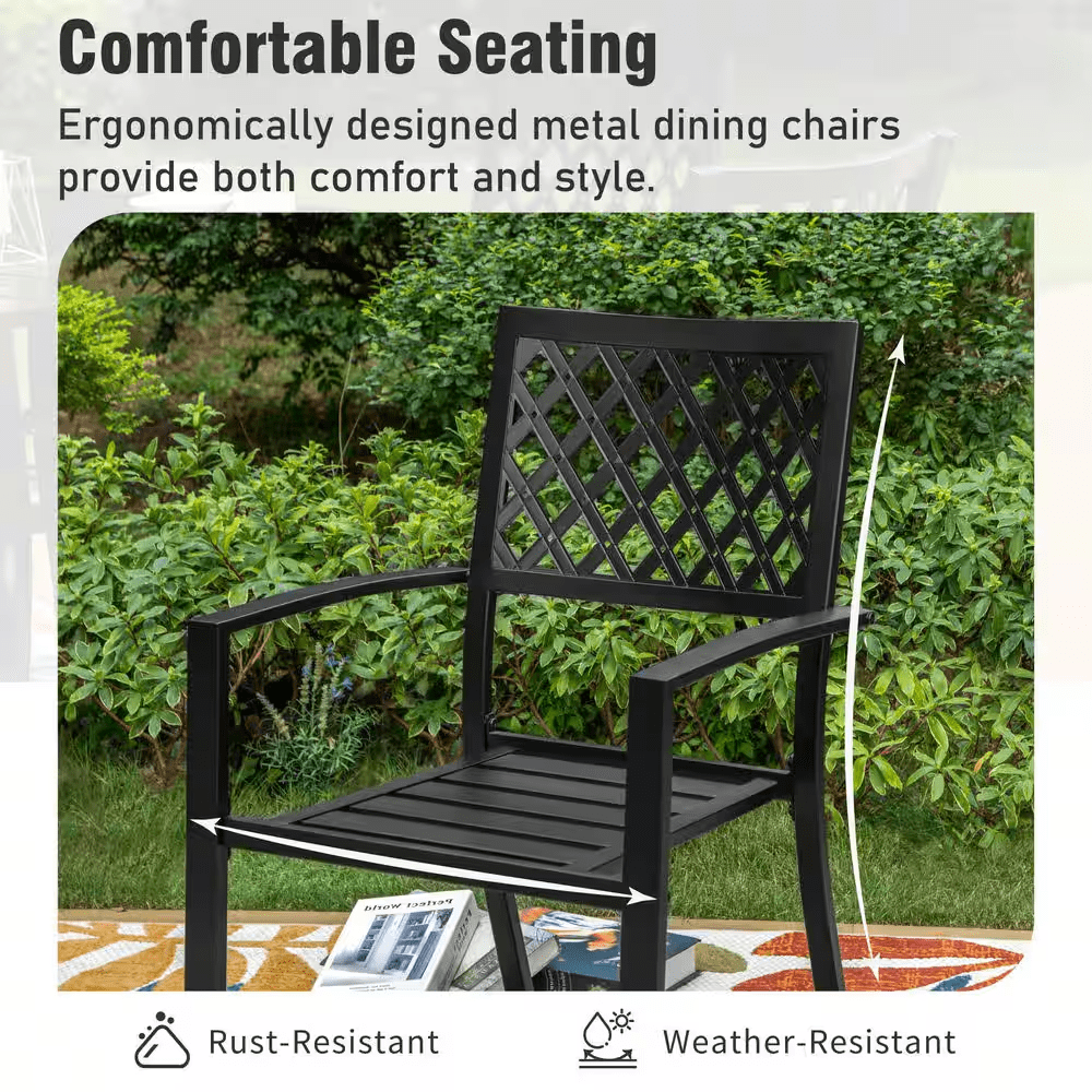 PHI VILLA Dining Set with elegant and classic black design brings unique aesthetic feeling to your patio, lawn, garden. Powder-coated heavy-duty steel frame and rust and weather resistant ensure long-lasting outdoor use. Ergonomic back support and curved smooth arms enables users to feel no fatigue after a long time sitting on these chairs. Stylish metal slat design makes the rectangular table sturdy and polished elegantly. Perfect for having dinner or party with your closest family and friends plus yourself.