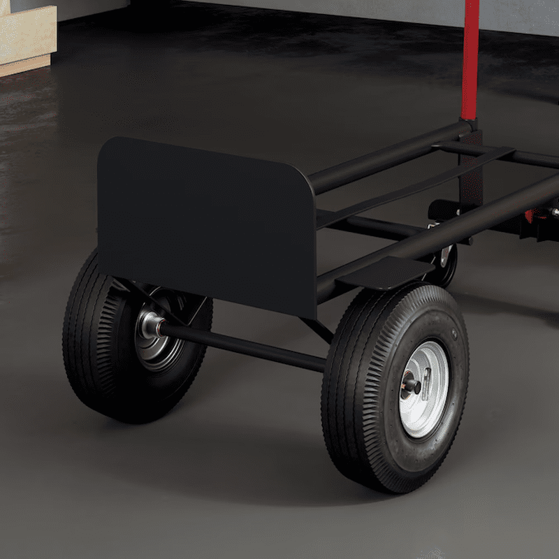 This Milwaukee heavy-duty convertible truck has a 800 lb. load capacity. It easily converts from 2 wheel vertical truck to a 4 wheel platform cart by pressing down with your foot on the handle release mechanism.. There are no pins to pull to adjust the handle position. Flow back handle allows for one or two hand operation. 10 in. pneumatic tires cushion the load and allow the truck to roll over uneven surfaces. 4 in. swivel casters give the truck increased maneuverability in cart position.