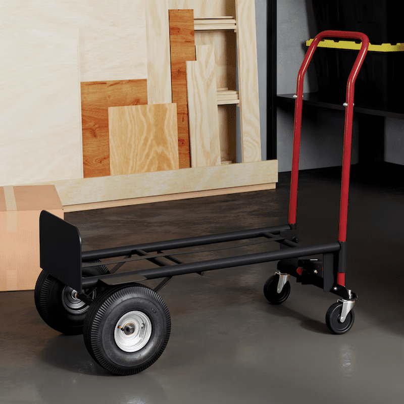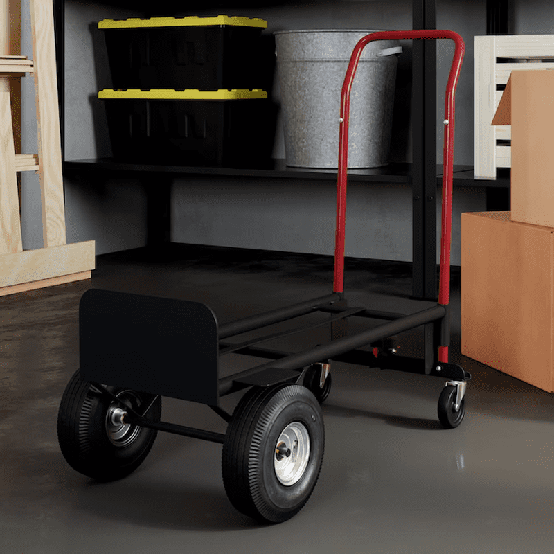 - Easily converts from vertical 2-wheel truck to 4-wheel platform position by pressing down with your foot on the handle release mechanism