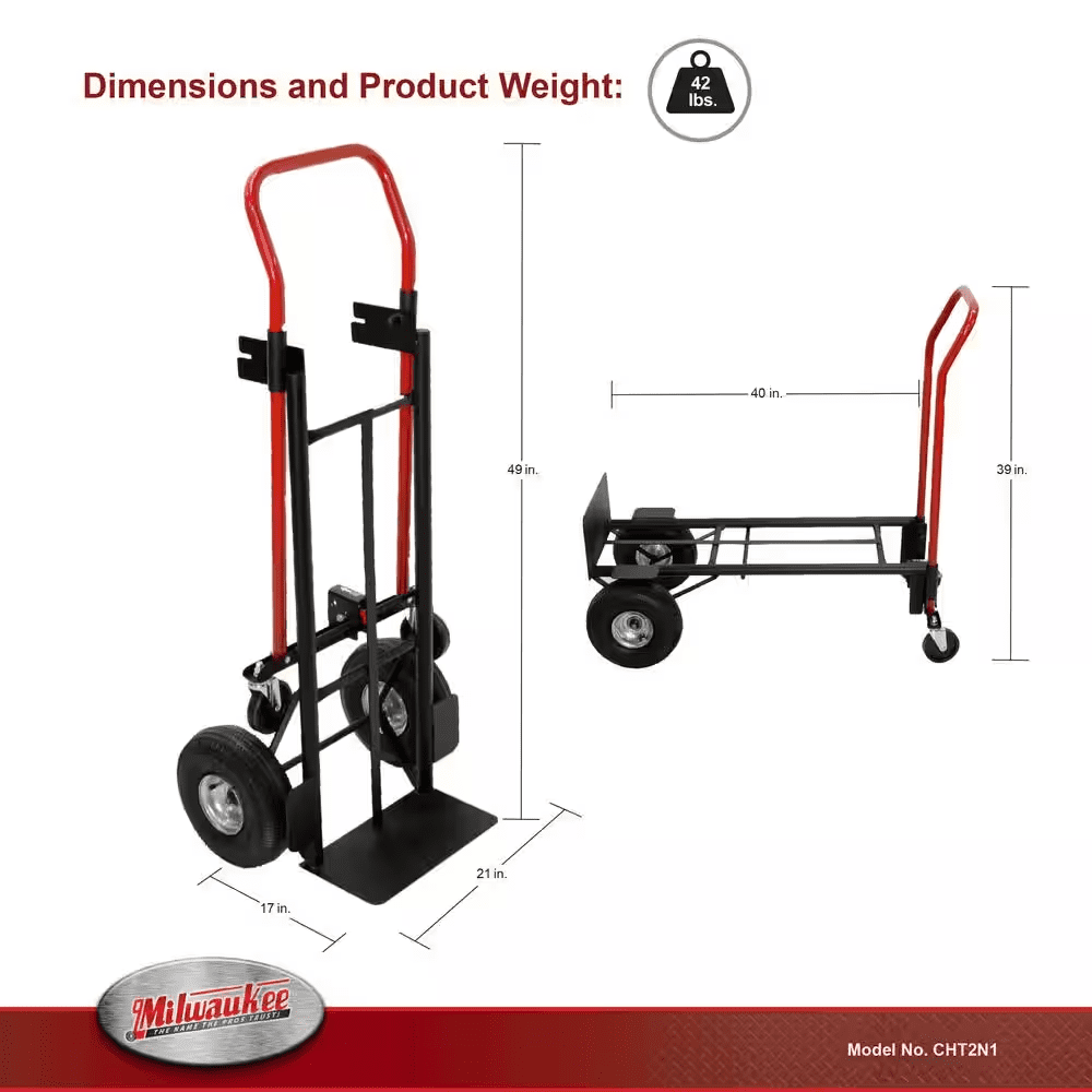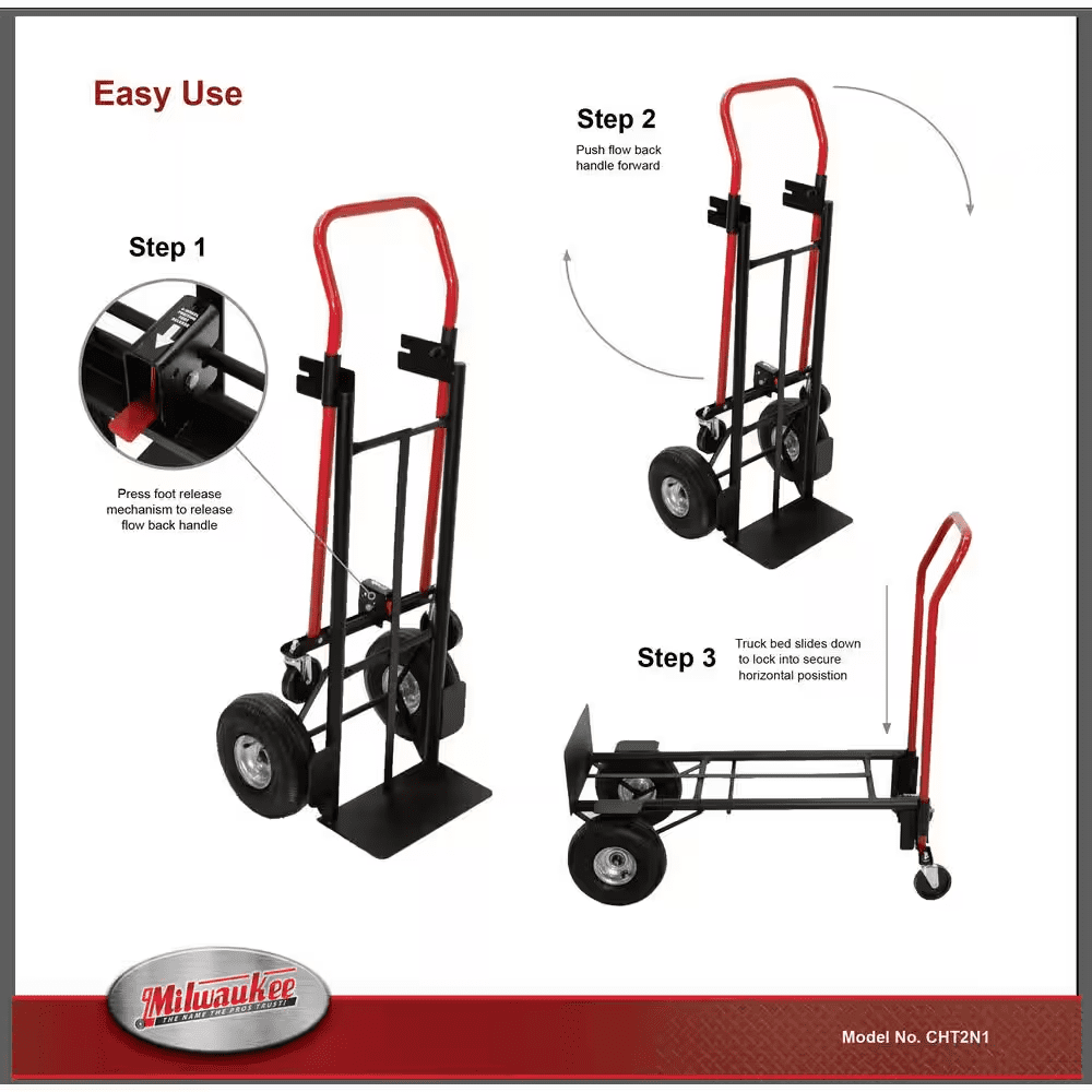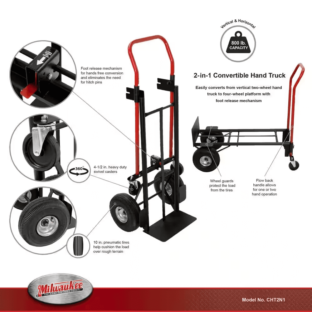 This Milwaukee Heavy-Duty Convertible Truck has an 800 lbs. load capacity. It easily converts from a 2-wheel vertical truck to a 4-wheel platform cart by pressing down with your foot on the handle release mechanism. There are no pins to pull to adjust the handle position. Flow back handle allows for one or two hand operation. The 10 in. pneumatic tires cushion the load and allow the truck to roll over uneven surfaces. The 4 in. swivel casters give the truck increased maneuverability in cart position.