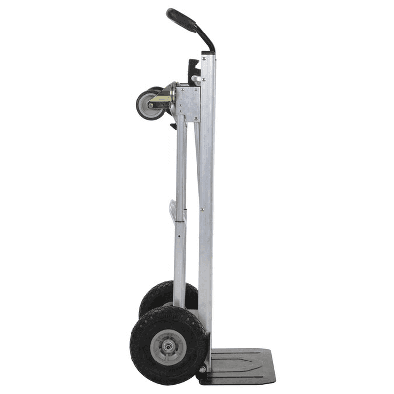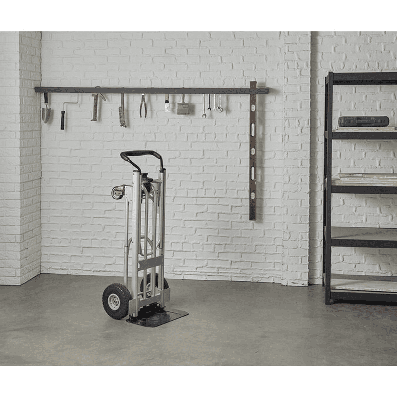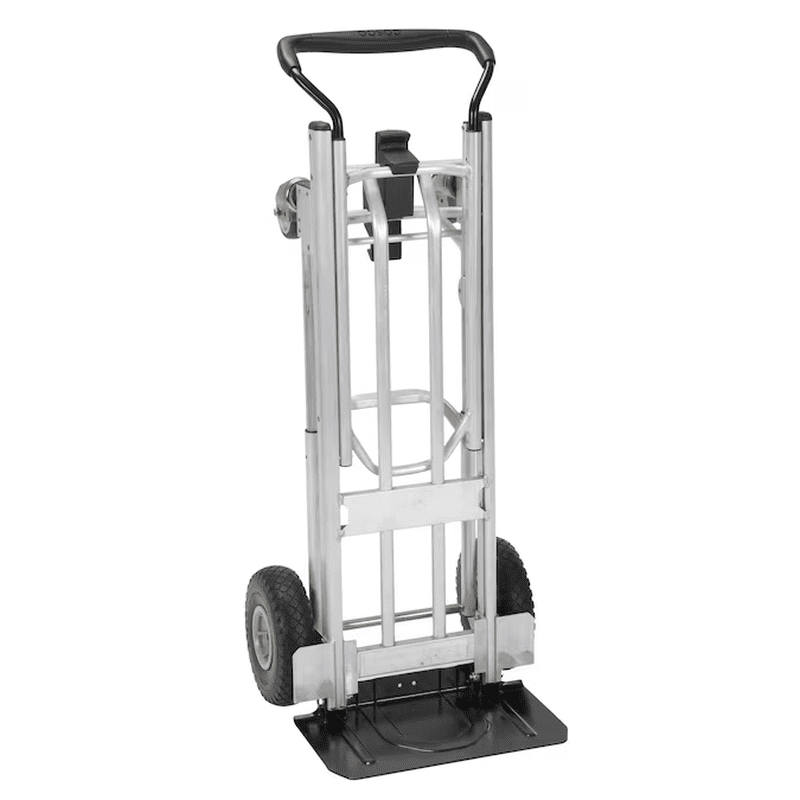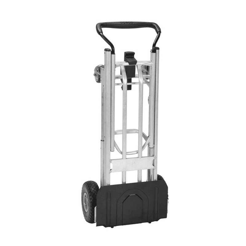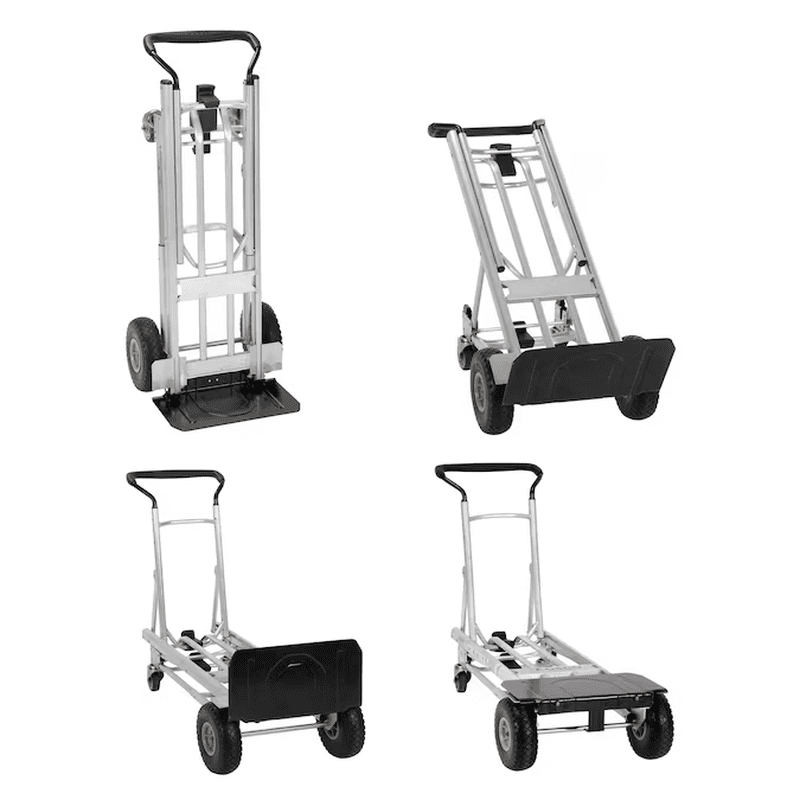 Let this multi-functional hand truck do all your heavy lifting. The ergonomic design makes it ideal for home or work. Easily converts to a 2-wheel upright, 4-wheel cart, 4-wheel platform cart or assisted 4-wheel hand truck —no tools, no pins, no kidding. The new folding toe plate allows for larger items to be easily transported. With this new 4-in-1 Folding Series Hand Truck, nothing gets left behind.