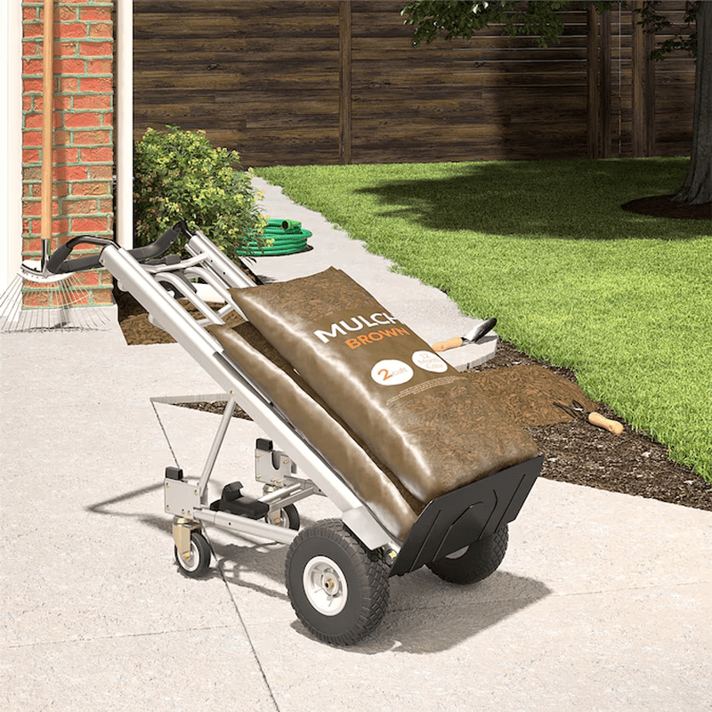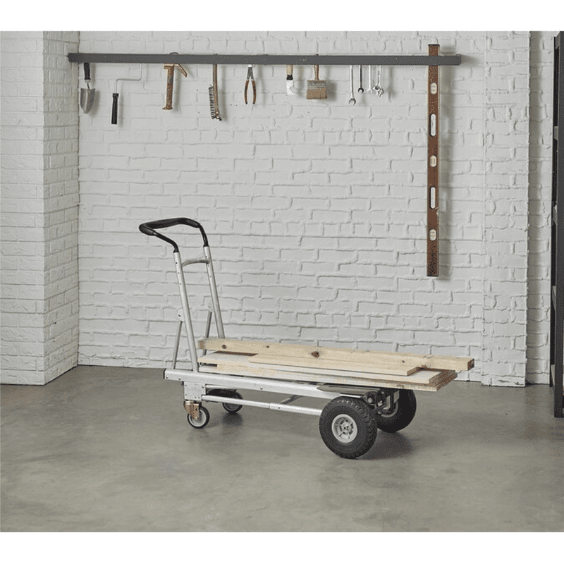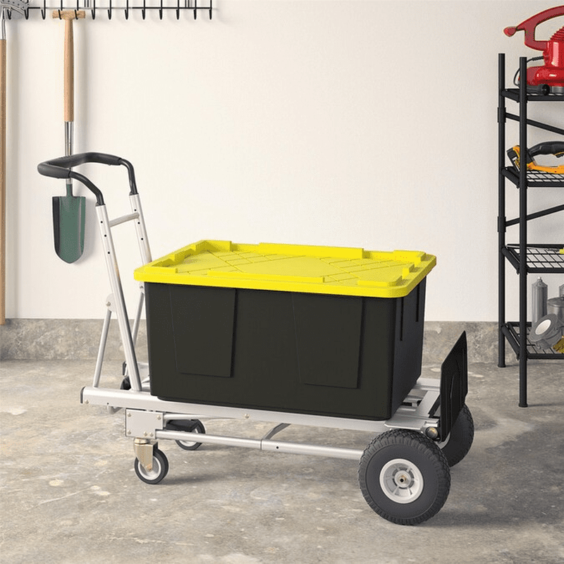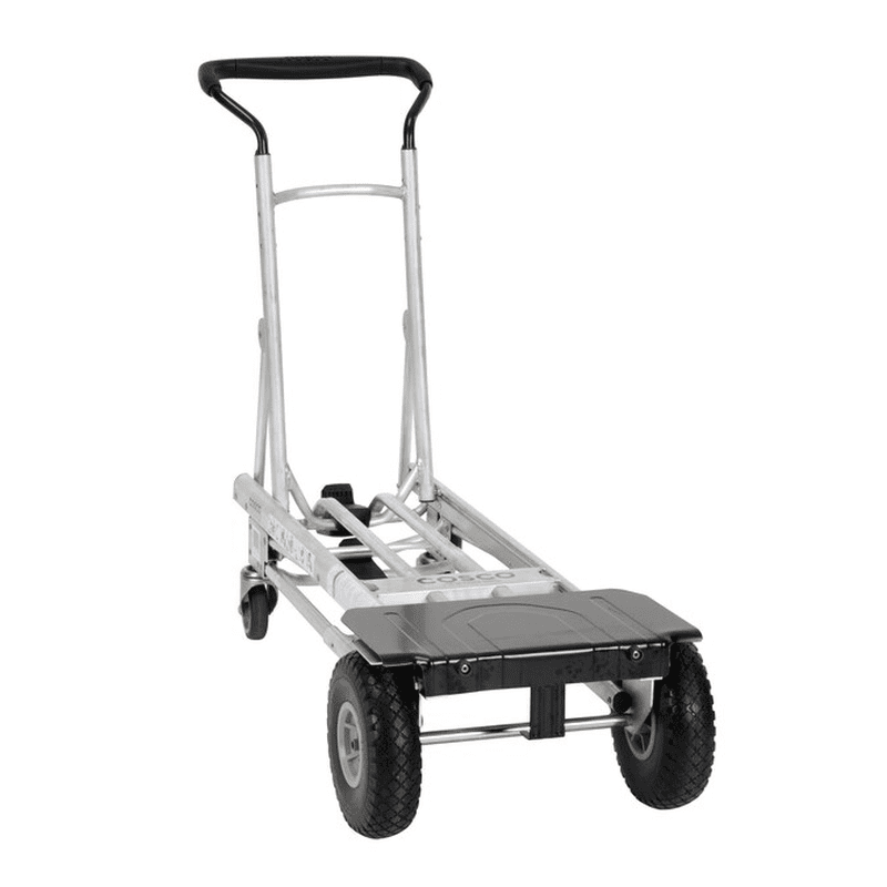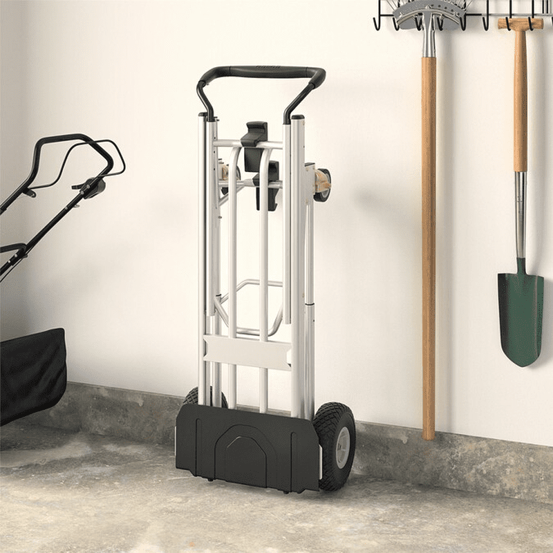 Let this multi-functional hand truck do all your heavy lifting. The ergonomic design makes it ideal for home or work. Easily converts to a 2-wheel upright, 4-wheel cart, 4-wheel platform cart or assisted 4-wheel hand truck —no tools, no pins, no kidding. The new folding toe plate allows for larger items to be easily transported. With this new 4-in-1 Folding Series Hand Truck, nothing gets left behind.